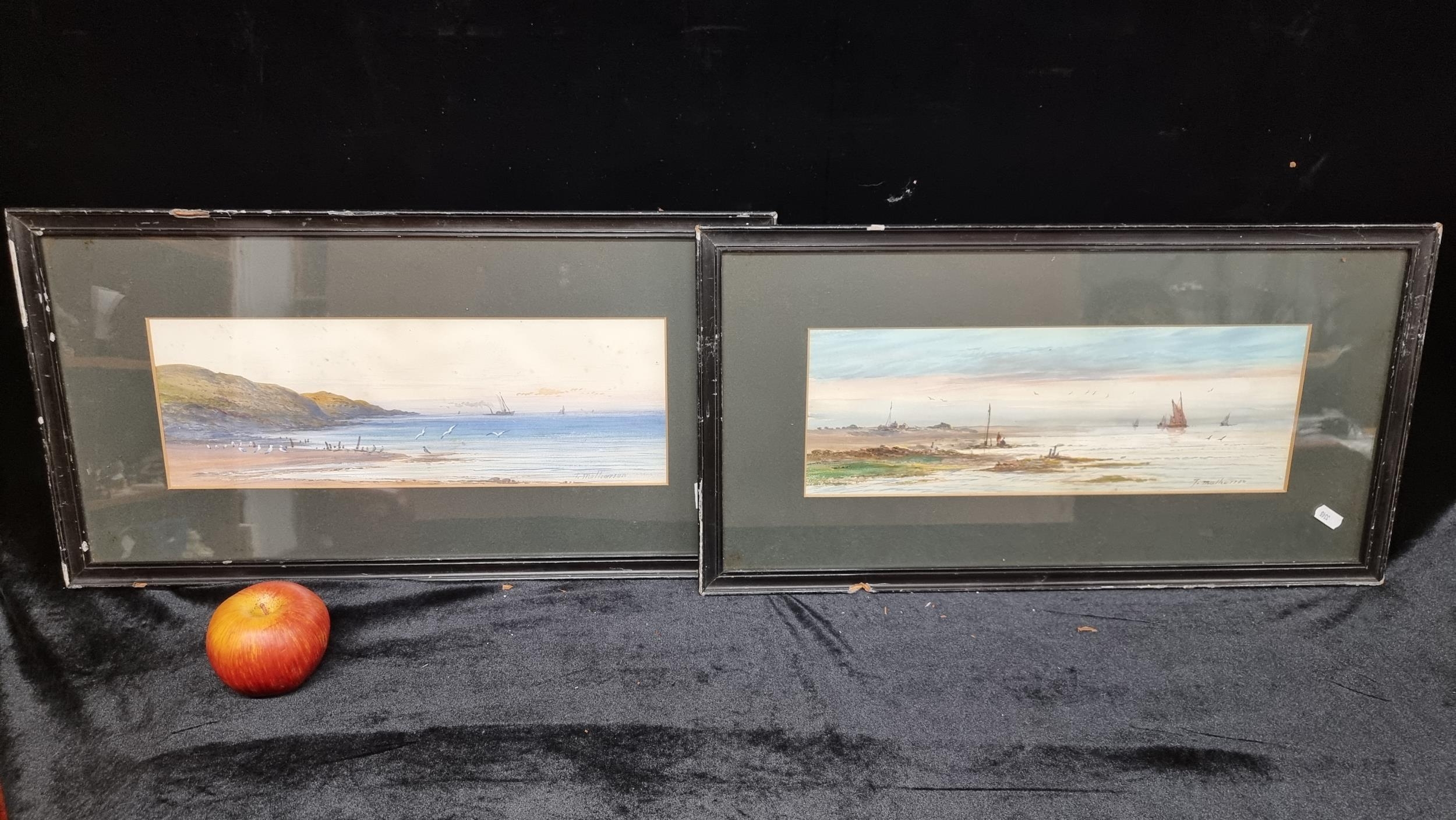 Pair of good sized original antique watercolours showing coastal landscapes, both signed by the artist T Mulherram. Beautiful use of the medium, very high quality paintings.