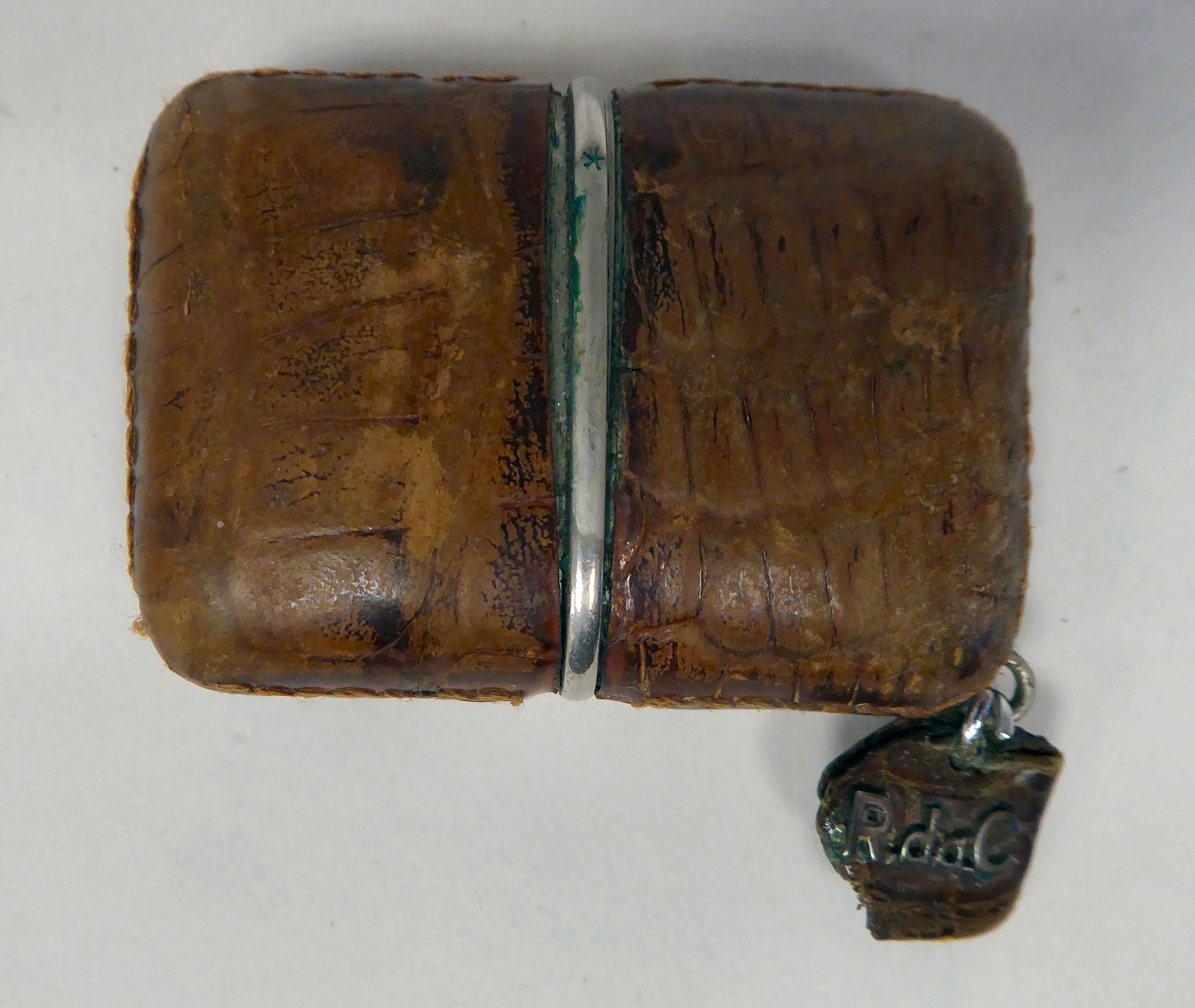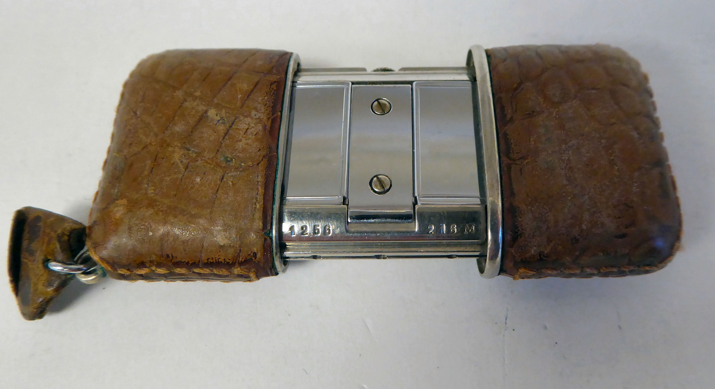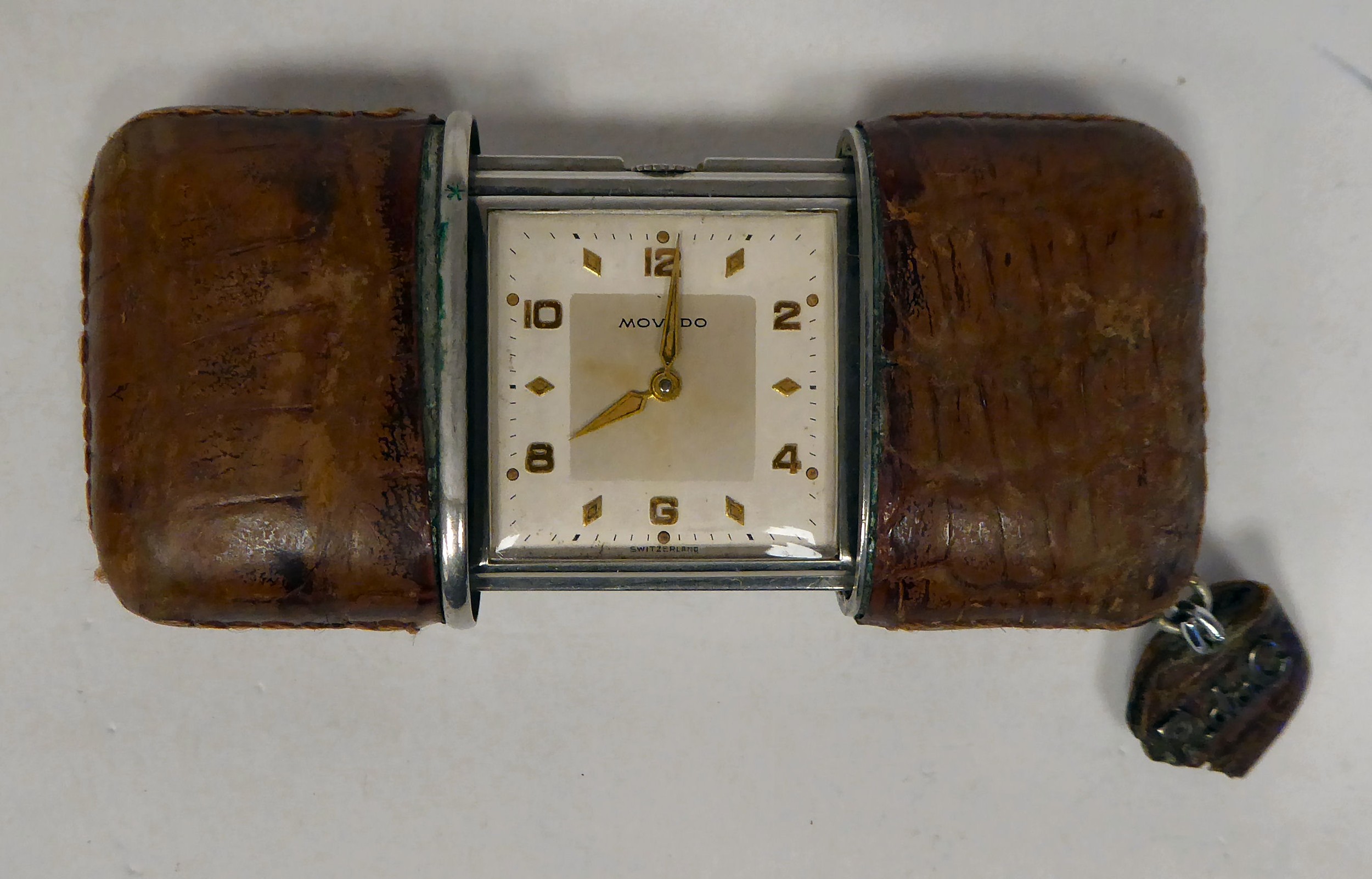 A Movado Ermeto stitched snakeskin clad mechanical watch, faced by a gilded square Arabic dial, stamped 1256 216M, the tab on the keyring stamped R.da.C