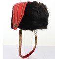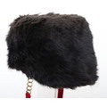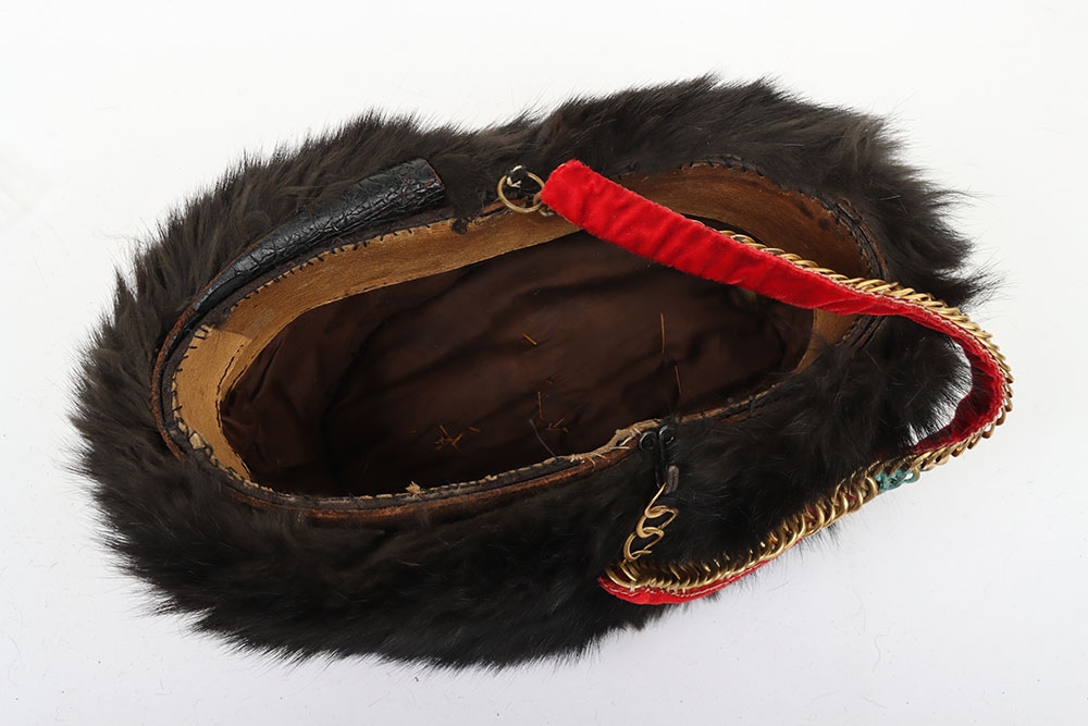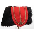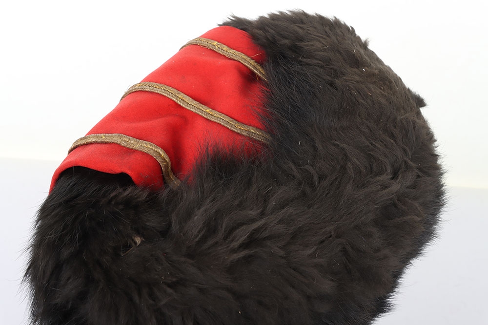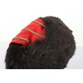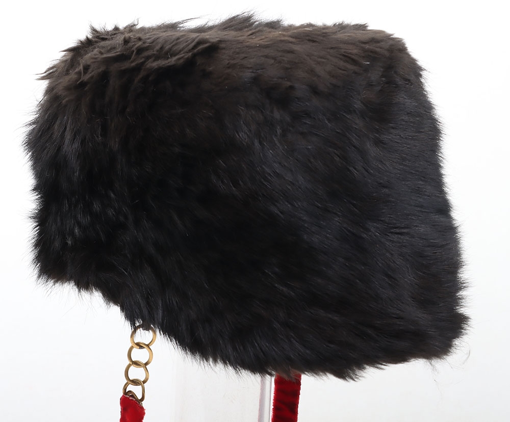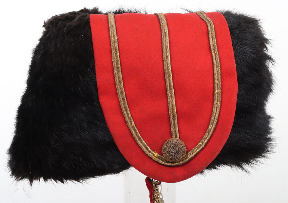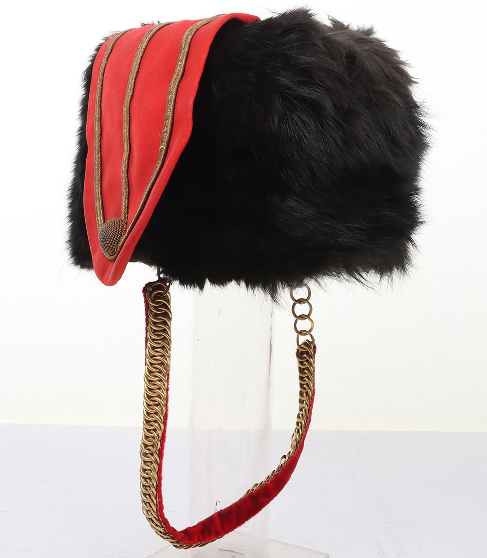 Hussar Officers Busby. Modern hussar officers fur busby with scarlet bag having gilt lace & button and scarlet velvet backed associated chin chain..
