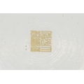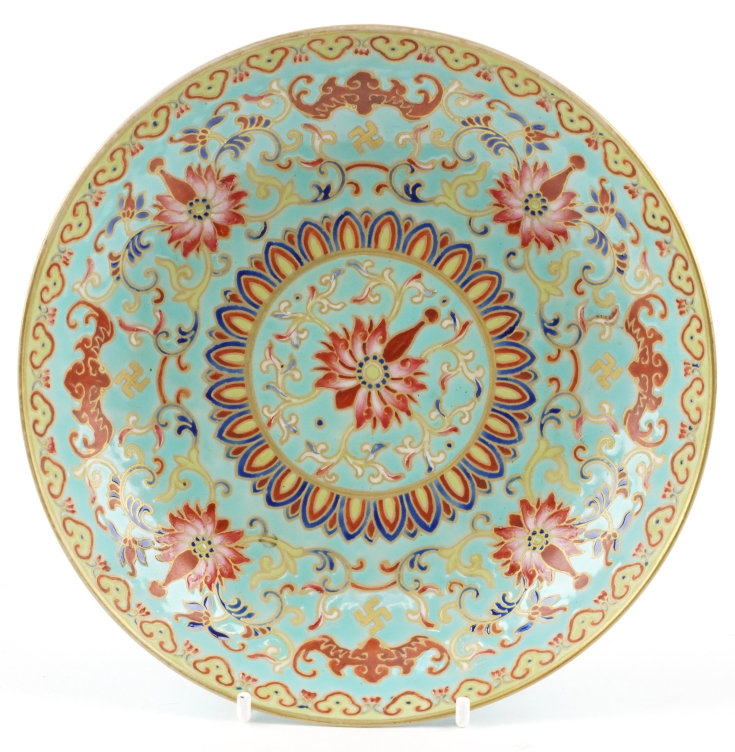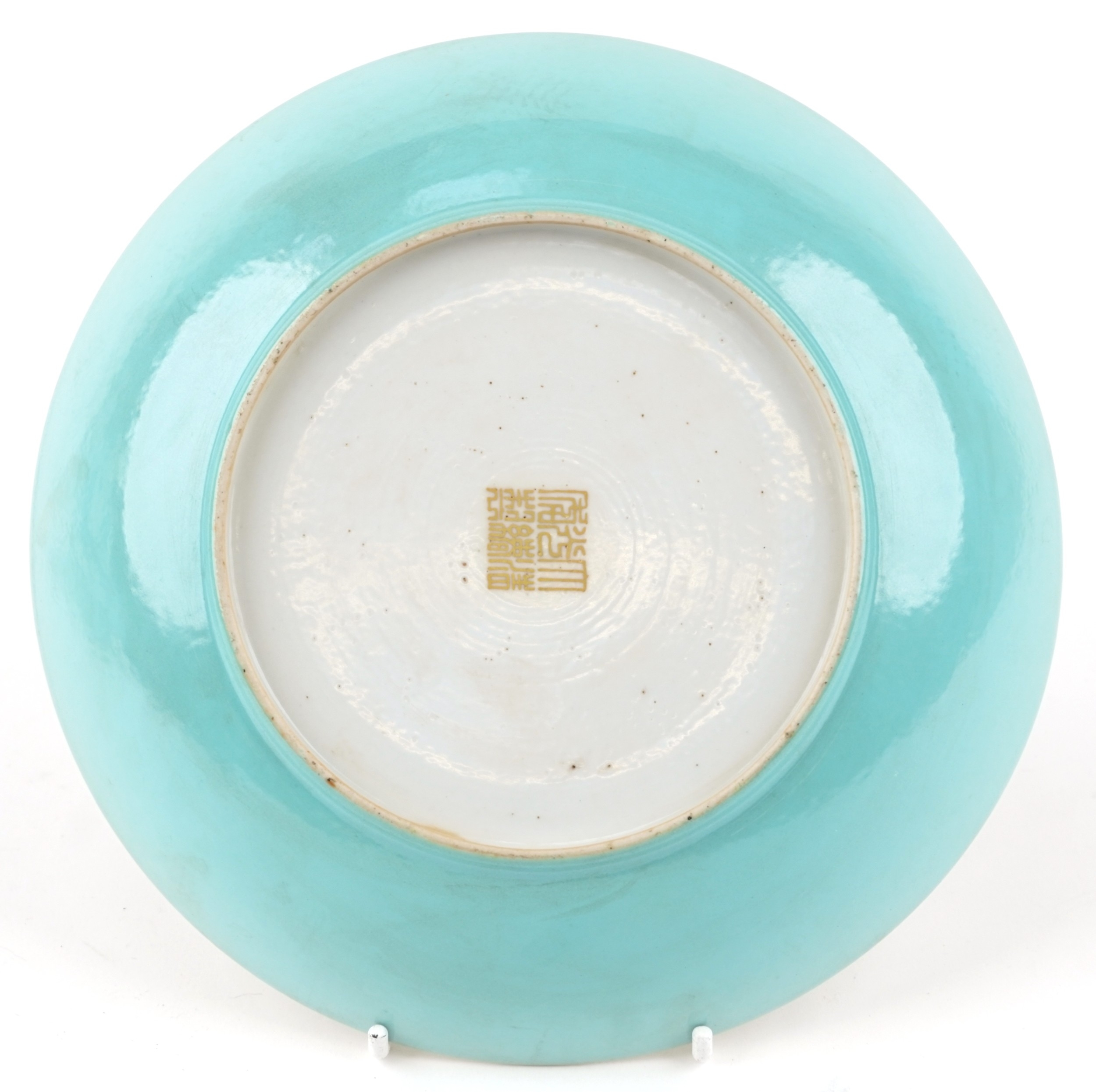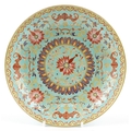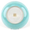 A Chinese porcelain dish hand painted in the famille rose palette with foliage and gilt motifs onto a turquoise ground, 19cm in diameter.