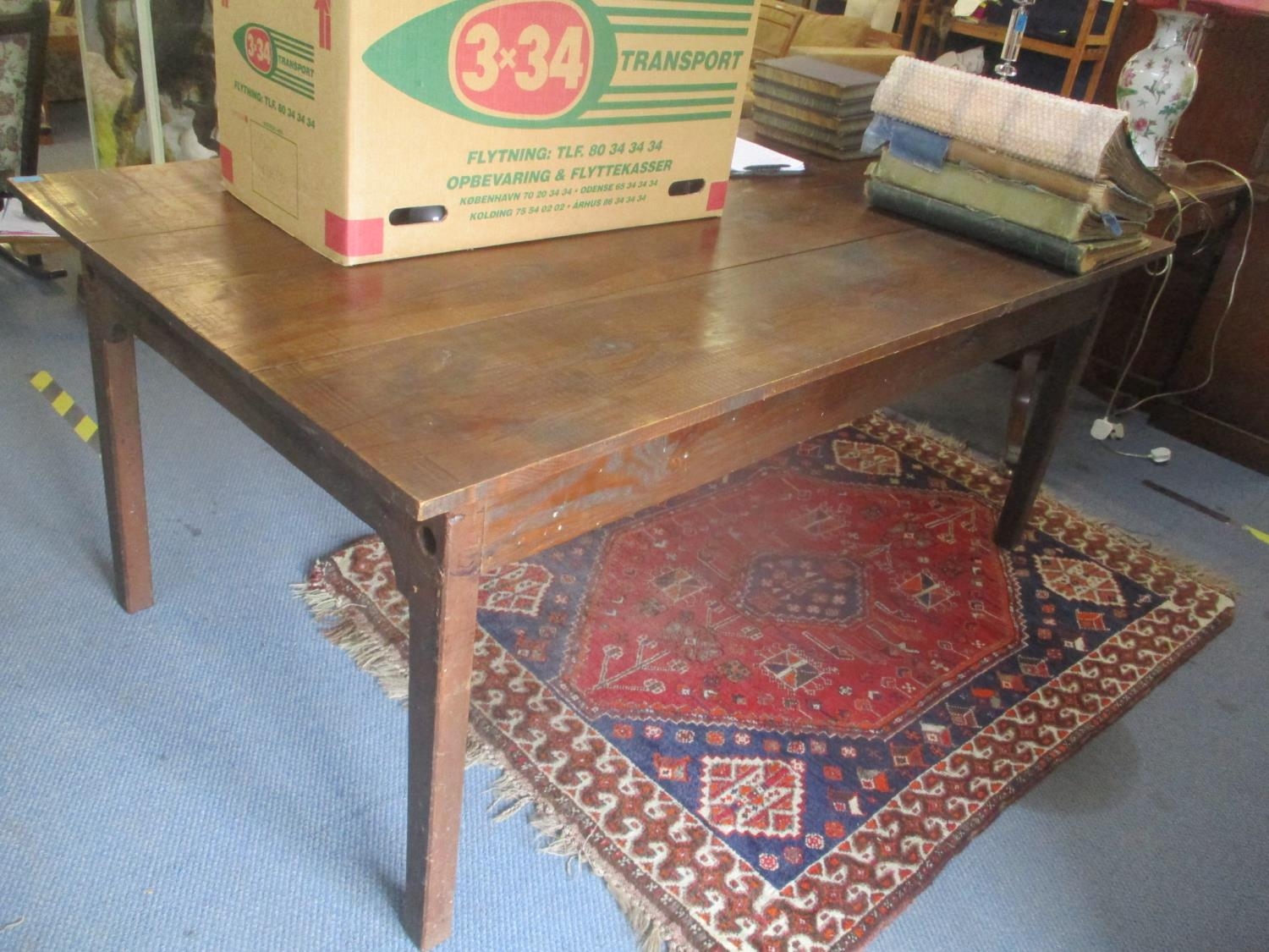 An American Texas Weavers pine table with a planked top on square legs, 30 1/4" H x 72" W