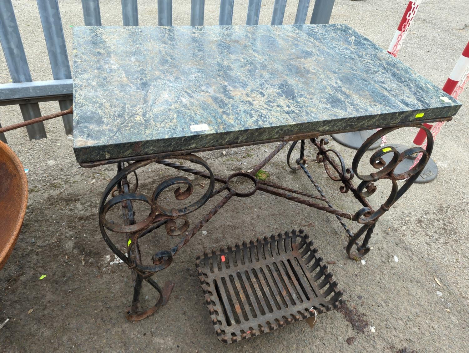 Wrought iron garden table with polished granite top. W100cm D60cm H77cm.