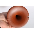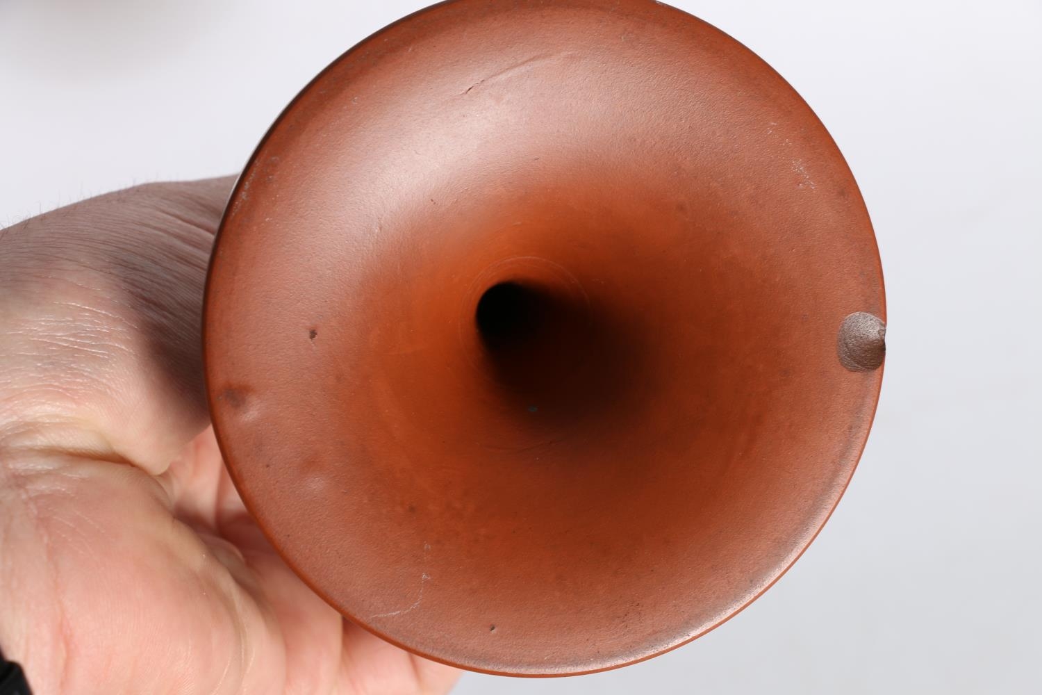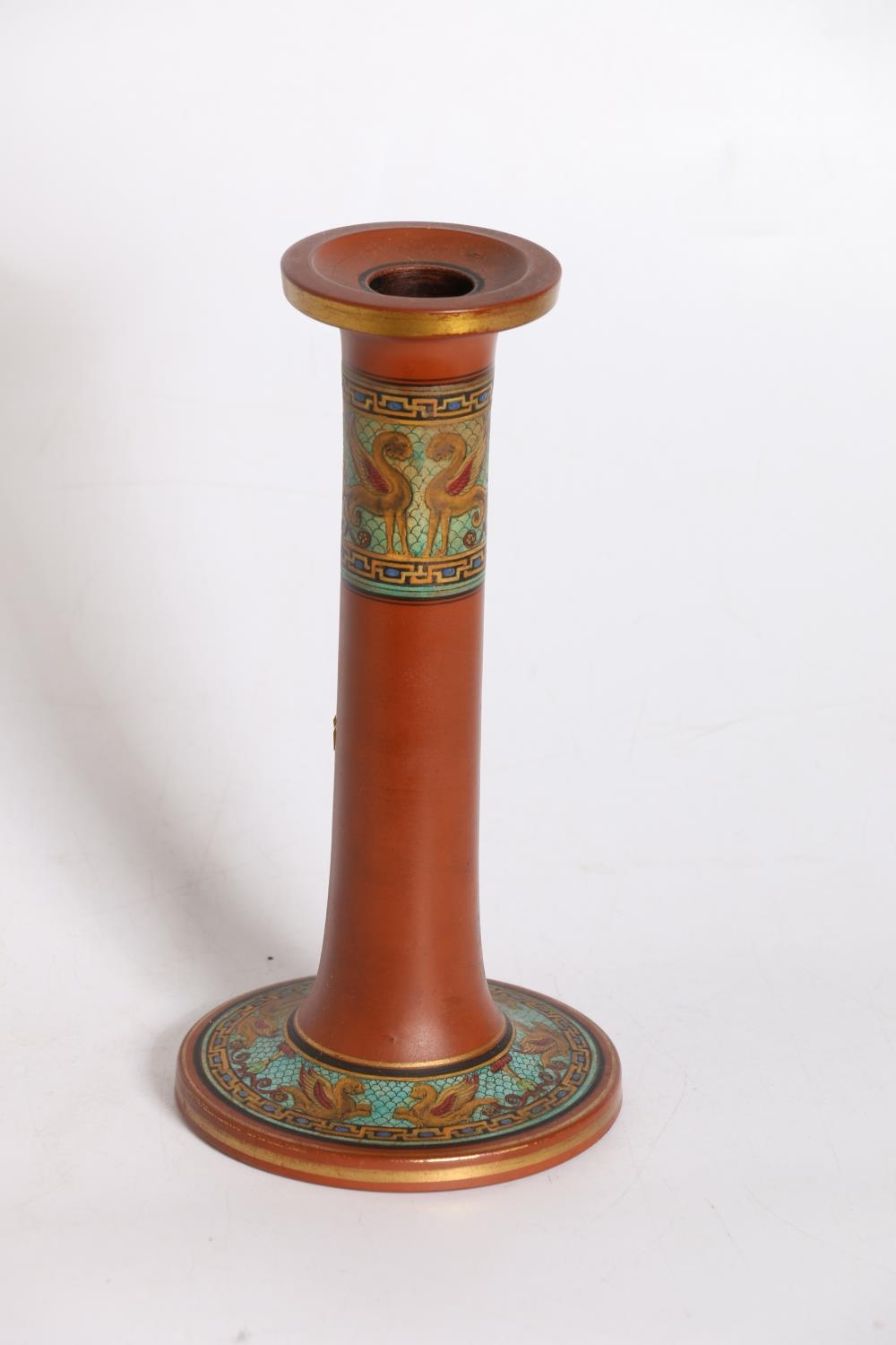 Terracotta pottery candlesticks in the manner of Pratt Ware, 21cm tall.
