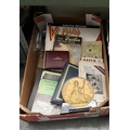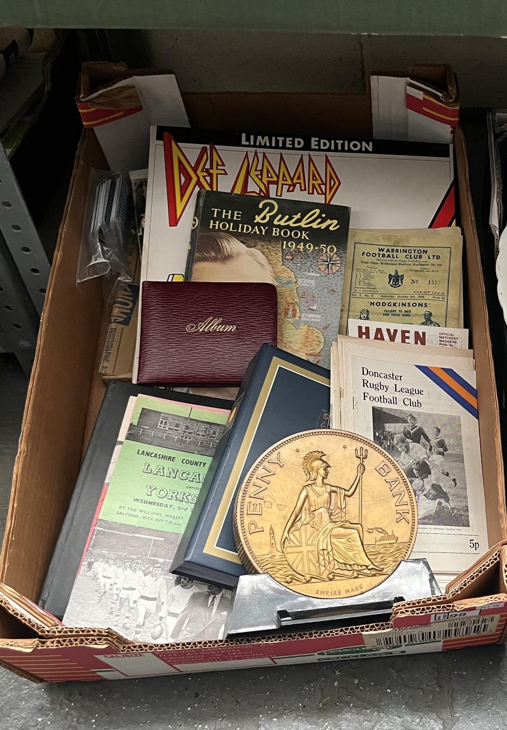 Box containing ephemera, 1949 Butlin Holiday Book and sports programmes
