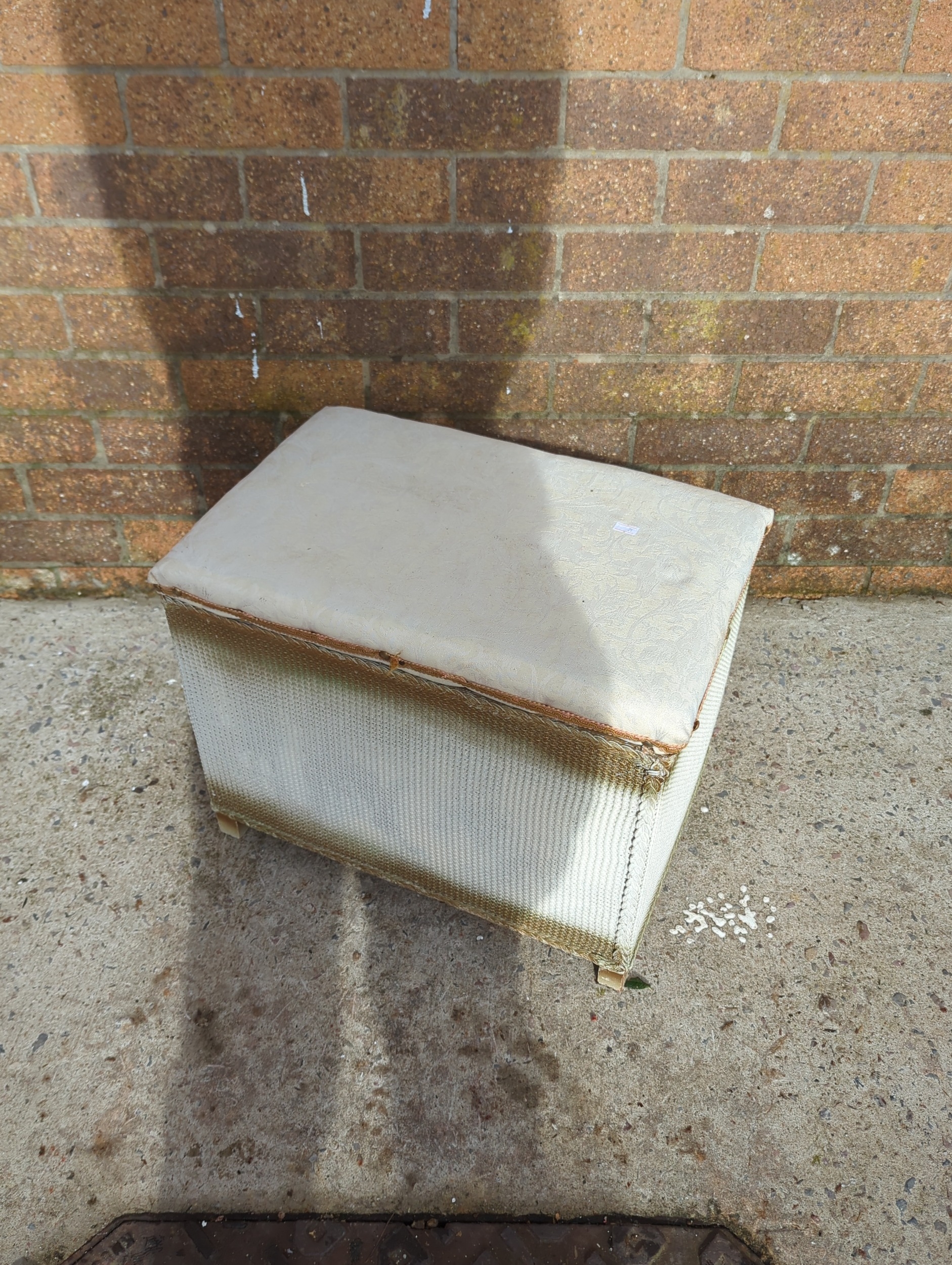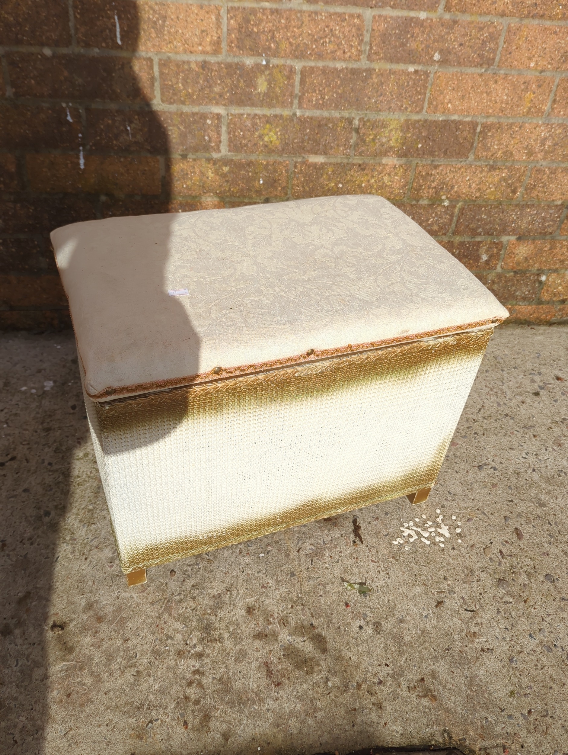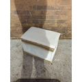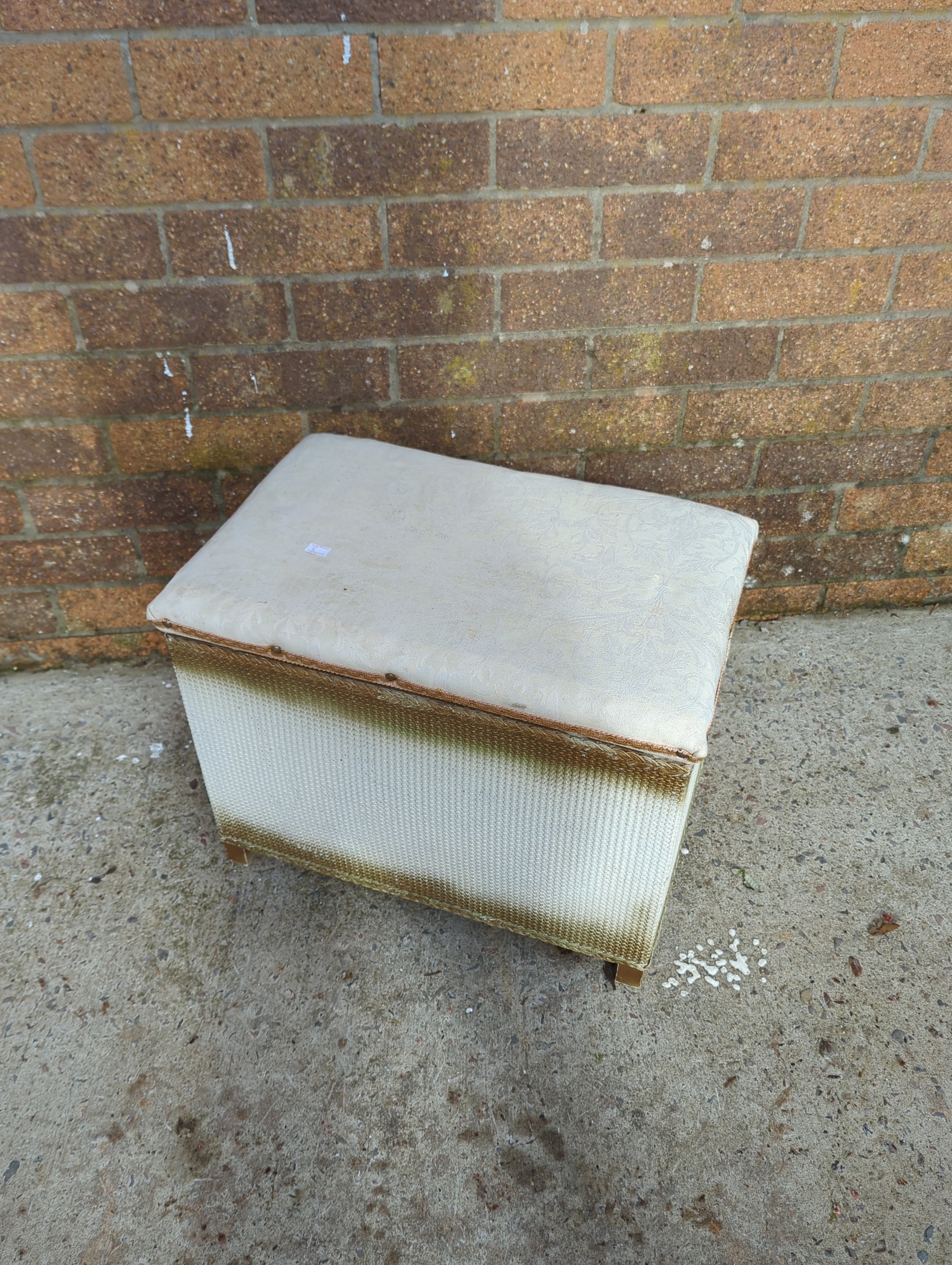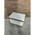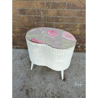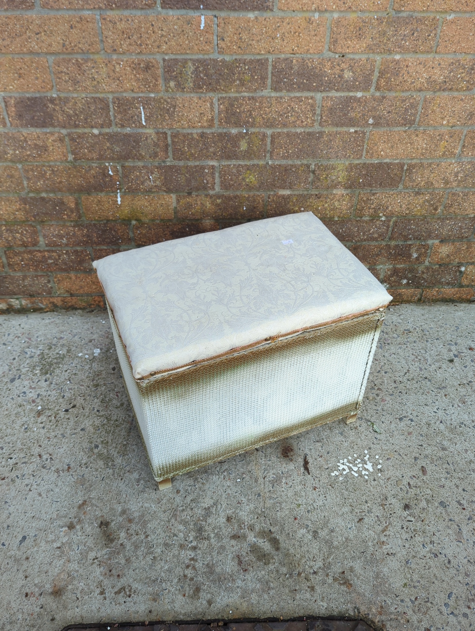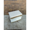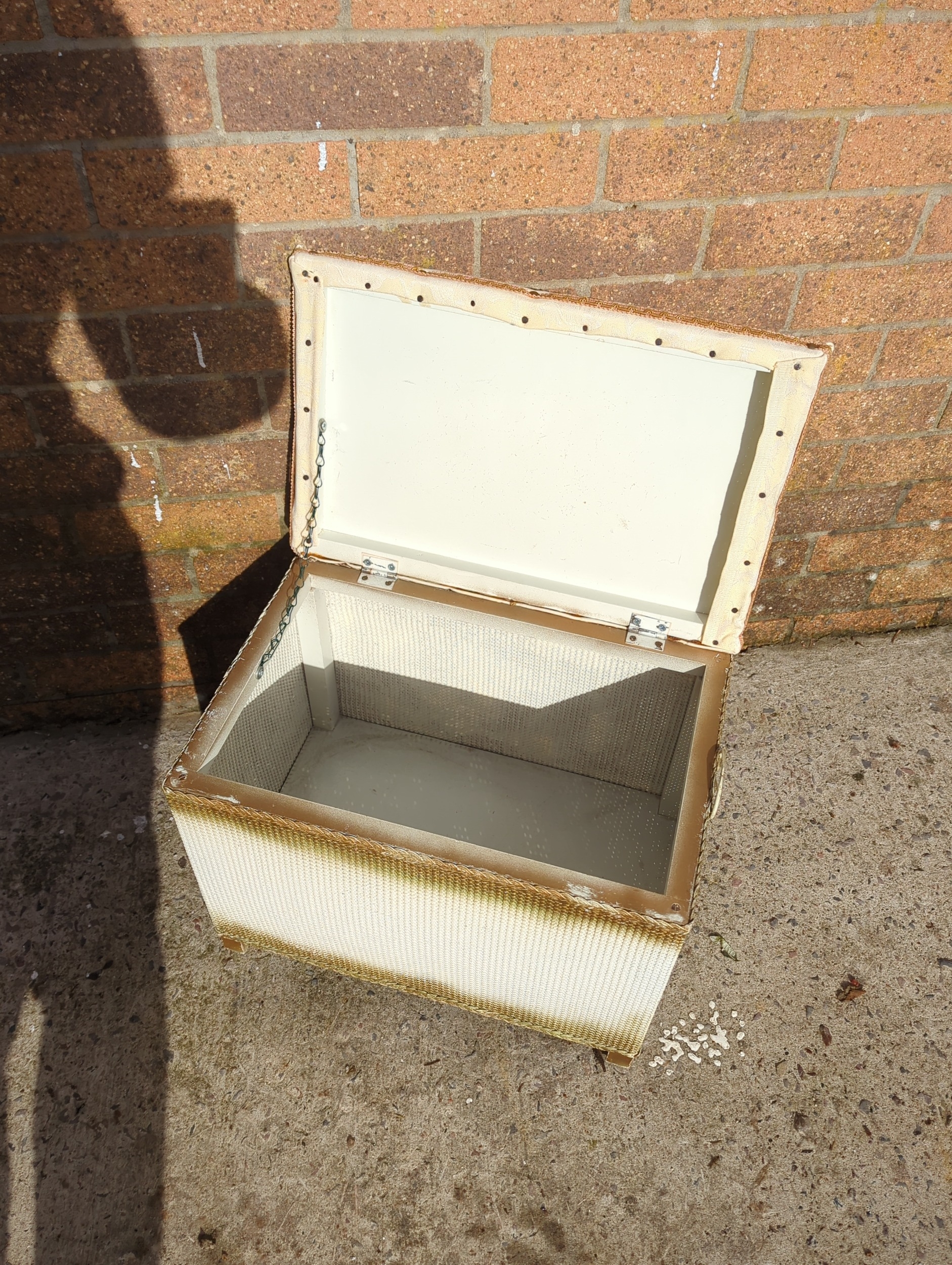 This is a cream patterned storage box with a decorative textile covering. The box features a hinged lid for easy access, and its interior is lined, offering secure storage options. The design includes a subtle floral motif, adding an elegant touch to its functional appeal.
