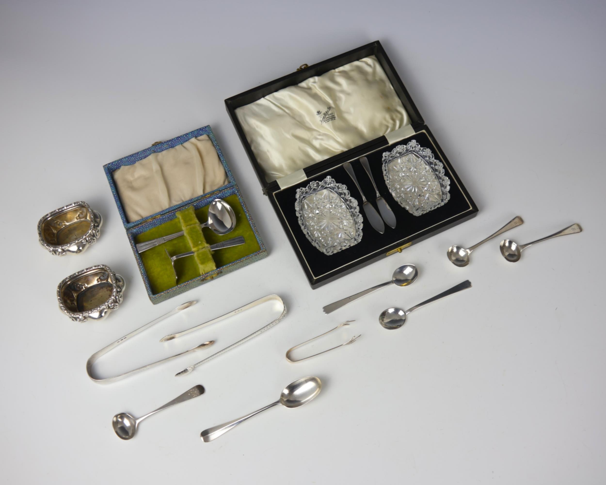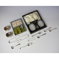 A selection of silver, including a pair of William IV silver mustard pot spoons, London 1831, 10cm, with a further silver mustard pot spoon, two 19th century silver sugar tongs, and further silver flatware and cased examples, gross weight 8ozt (qty) (at fault)