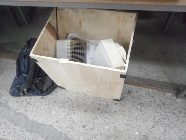Lot inc wooden storage box, fan heaters, trolley wheels, etc