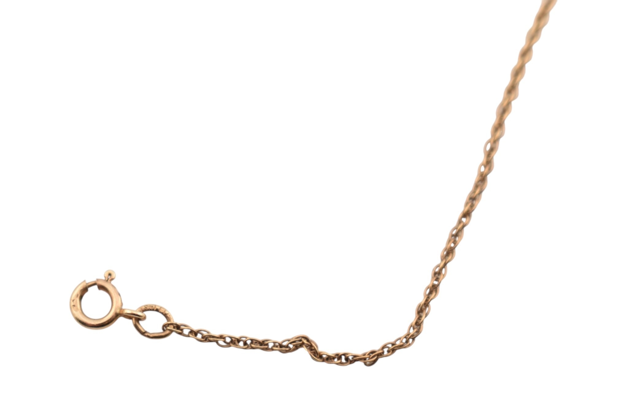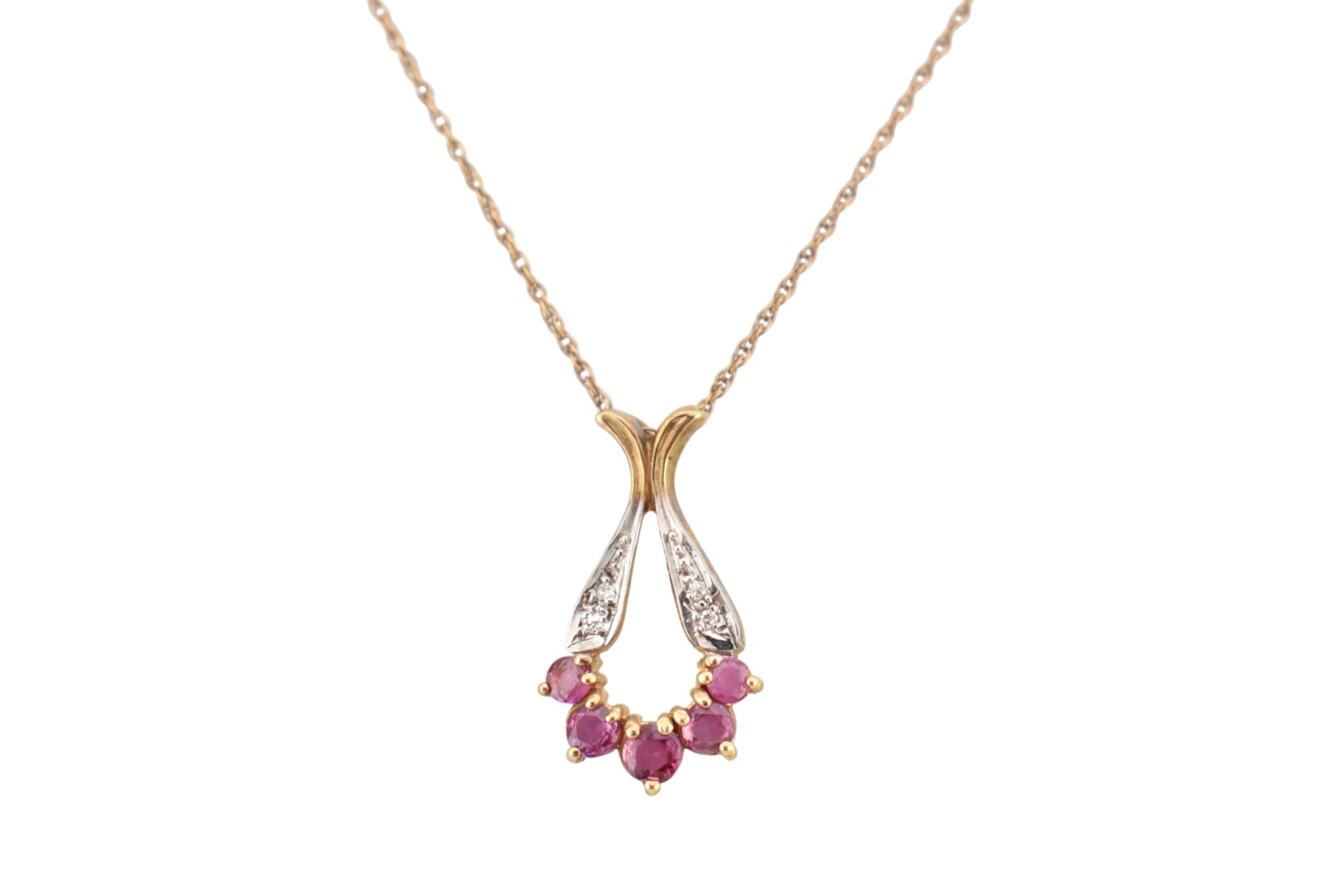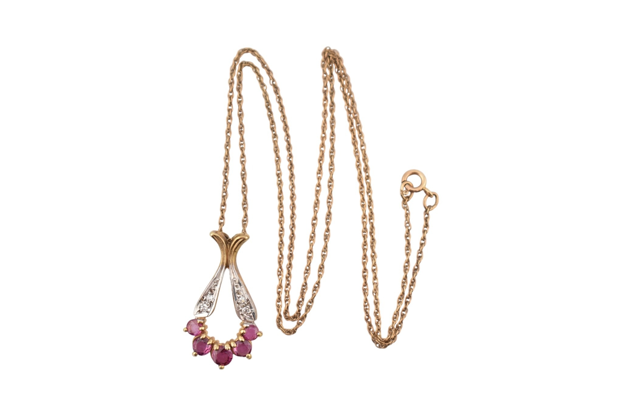 A hallmarked 9ct gold ruby and diamond pendant necklace. The pendant hallmarked 9ct, the chain stamped 9k. Weight 1.9g. Measures 40cms chain, pendant 2cms
