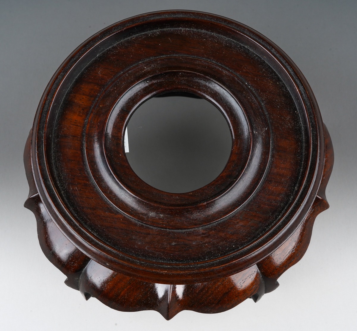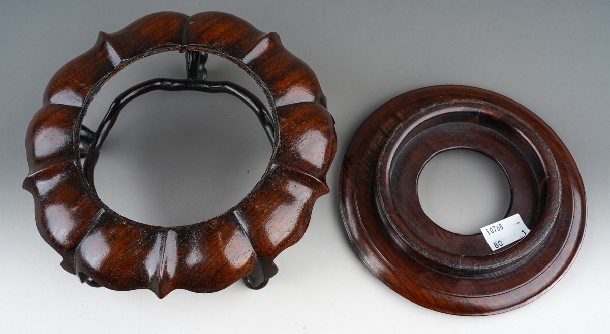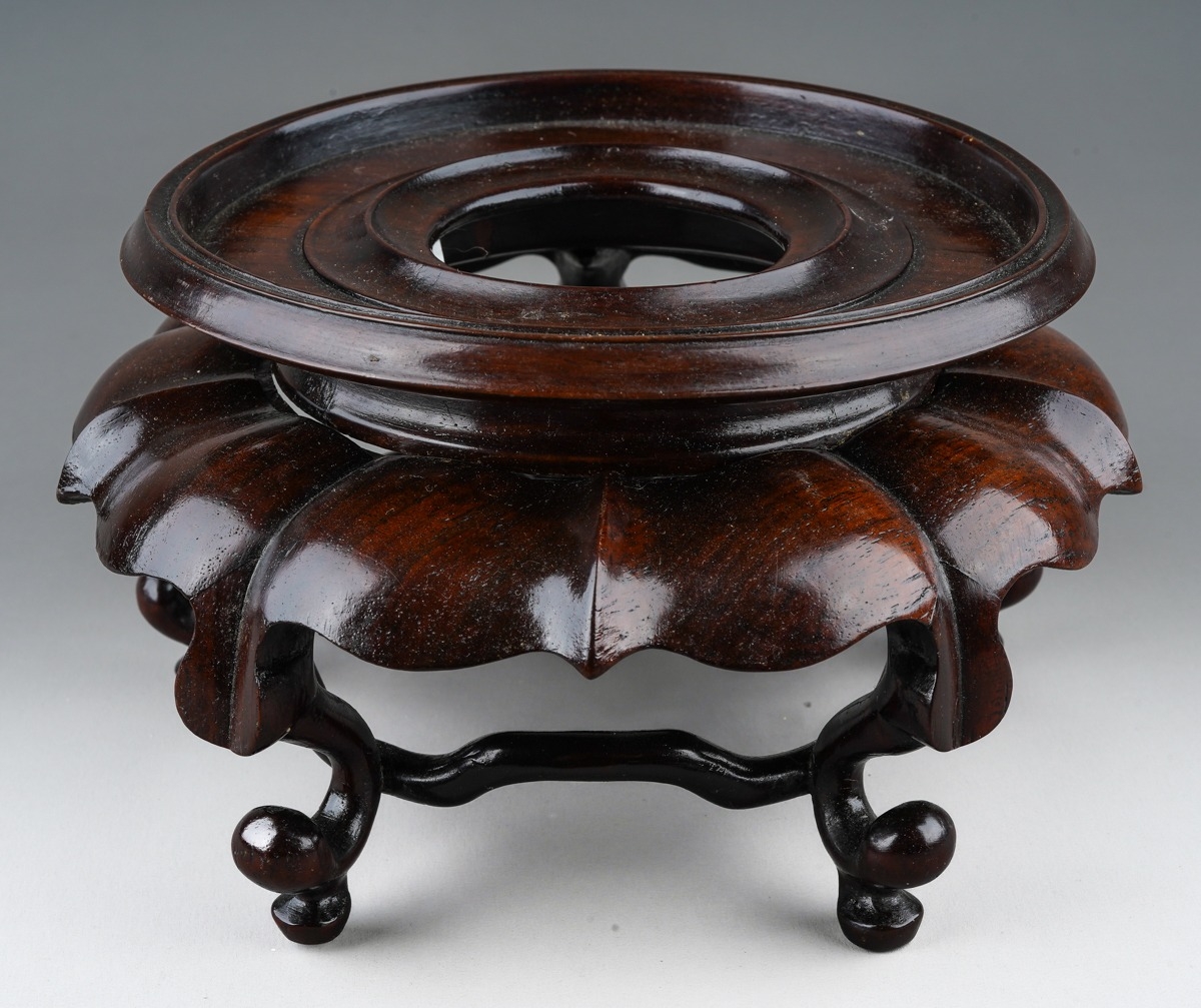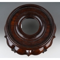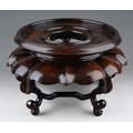 A Chinese hardwood two piece stand, the turned circular top with short foot on a wavy lotus style base with five scrolled legs united by a continuous wavy stretcher, diameter approx. 17cm x height 10cm