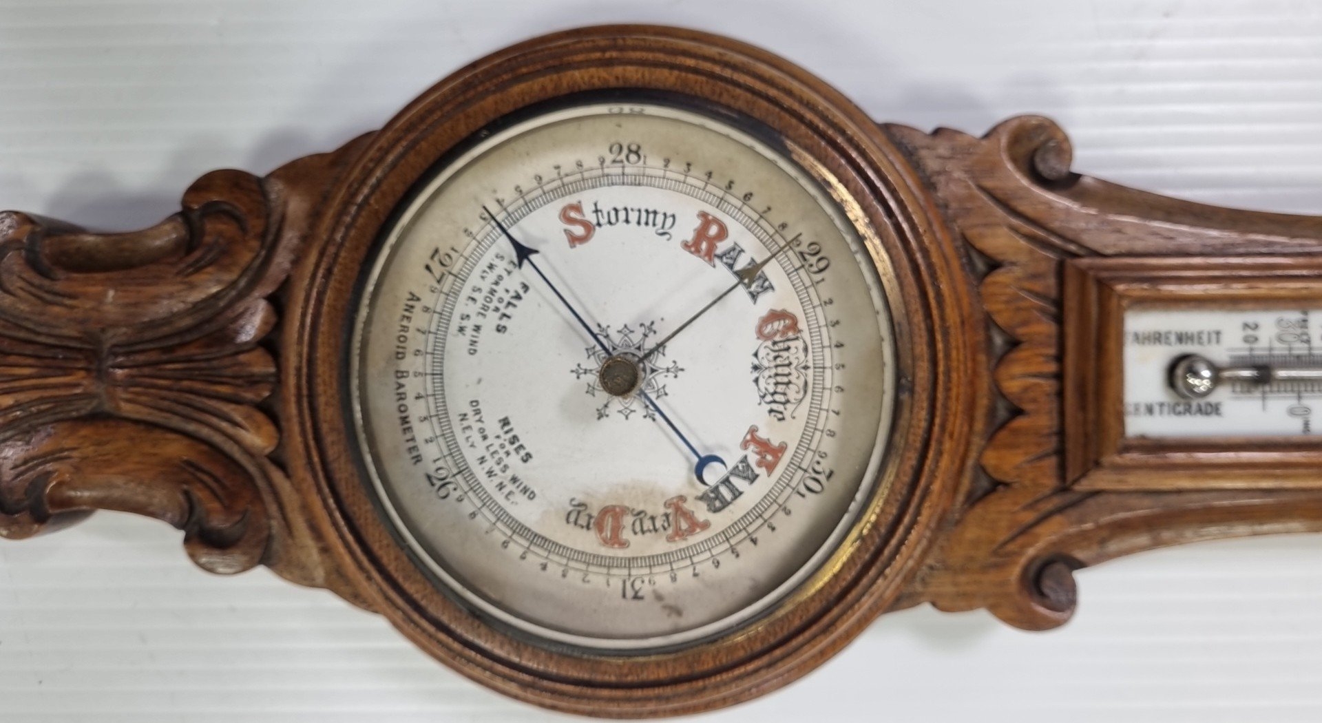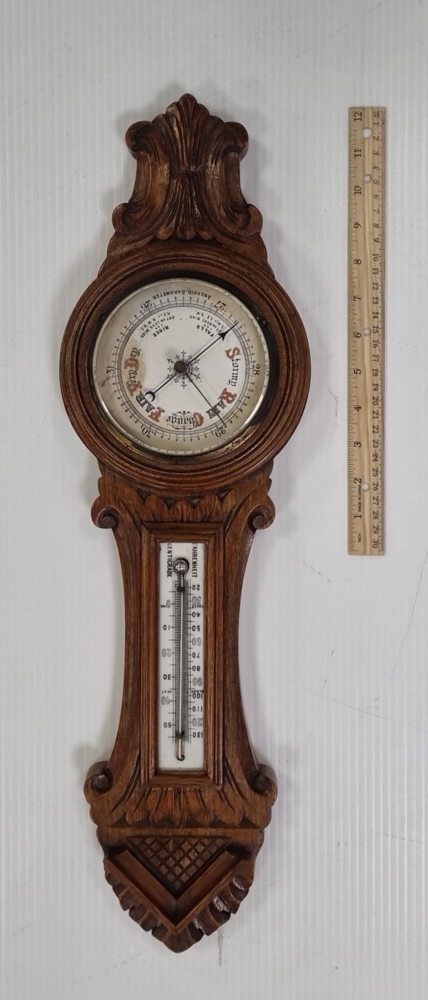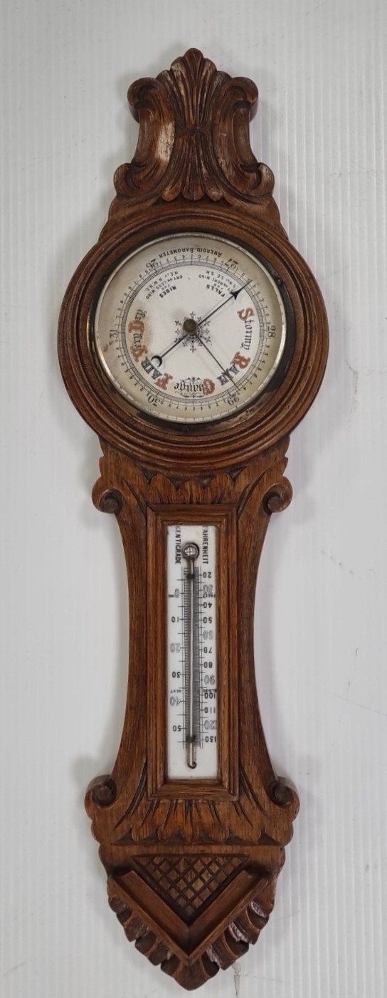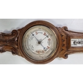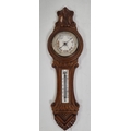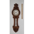 Small Carved hardwood aneroid barometer and thermometer, H: ...