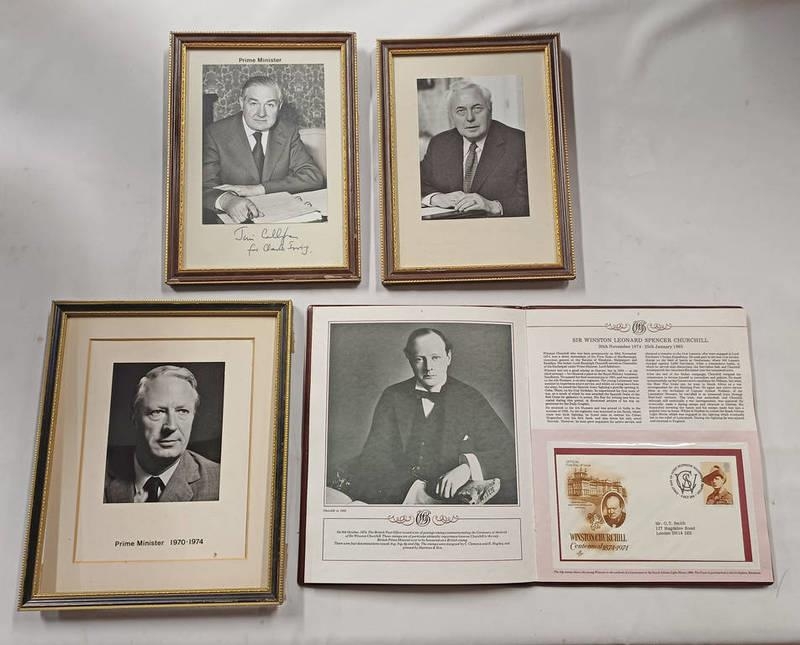 SIGNED PHOTOGRAPH OF FORMER PRIME MINISTER JIM CALLAGHAN, 2 OTHER PHOTOS OF EDWARD HEATH AND HAROLD WILSON & CHURCHILL CENTENARY FIRST DAY COVERS