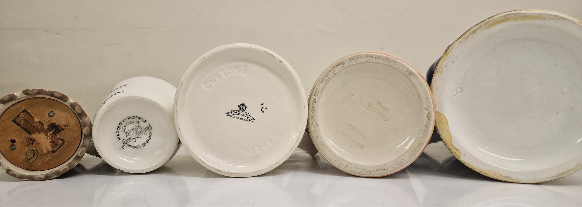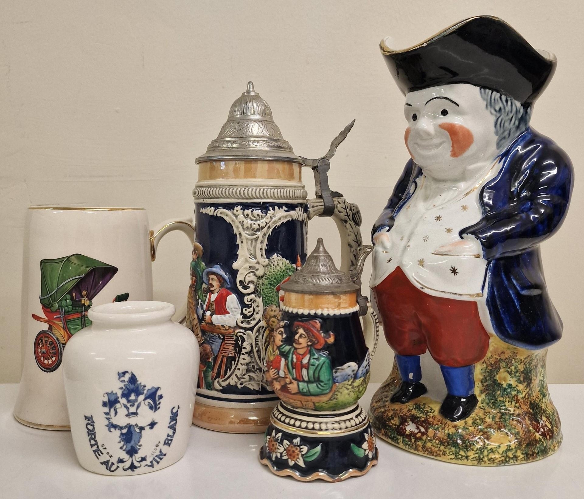 A mixed lot of ceramics. To include a large scale Toby jug, two steins (one musical), mug & jar.
