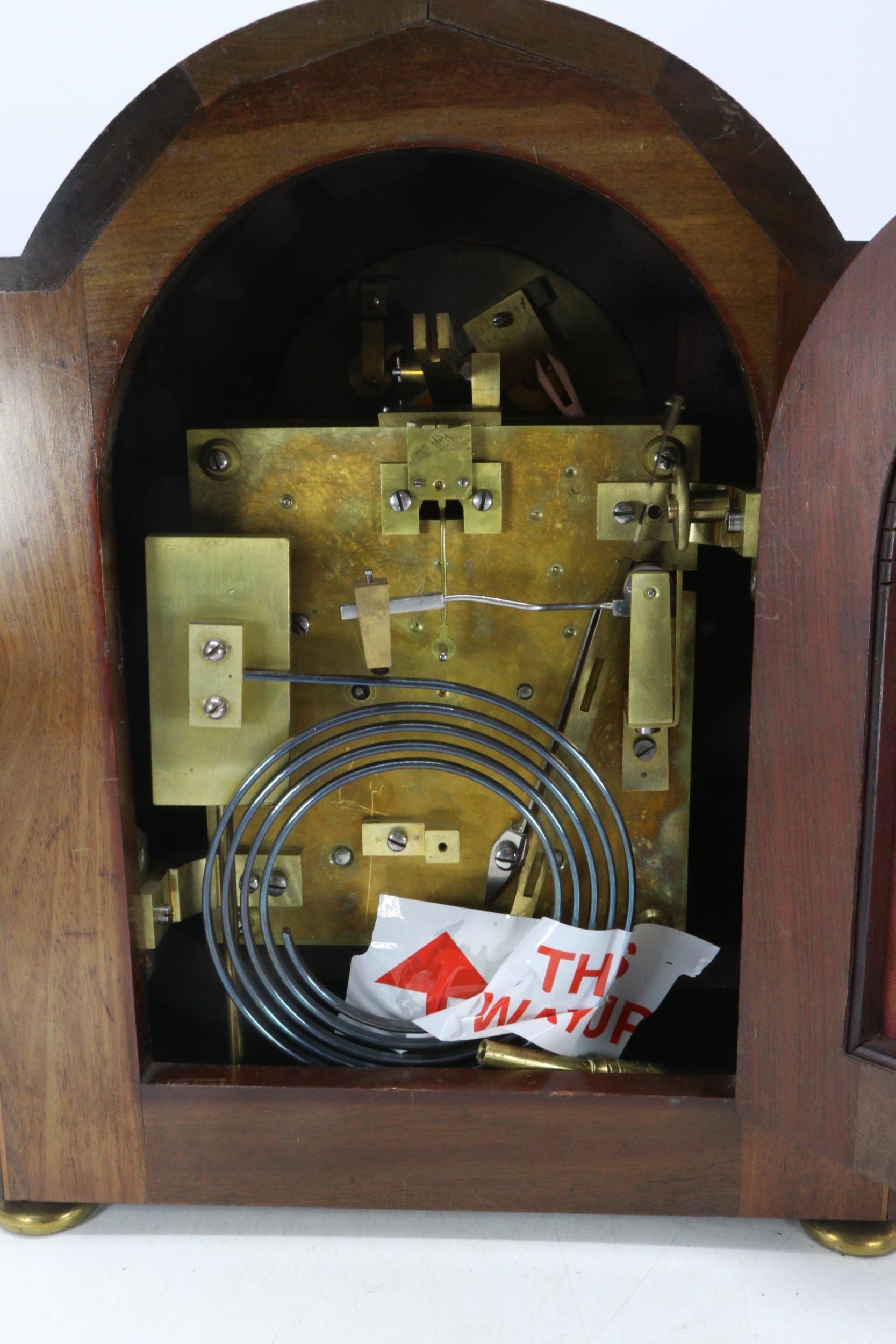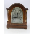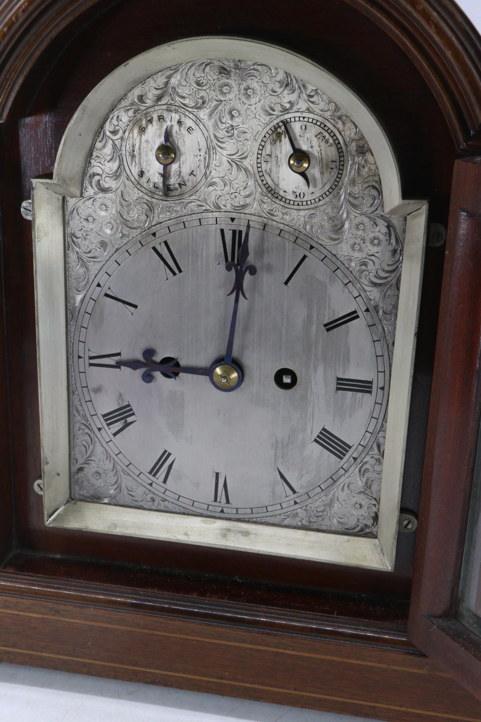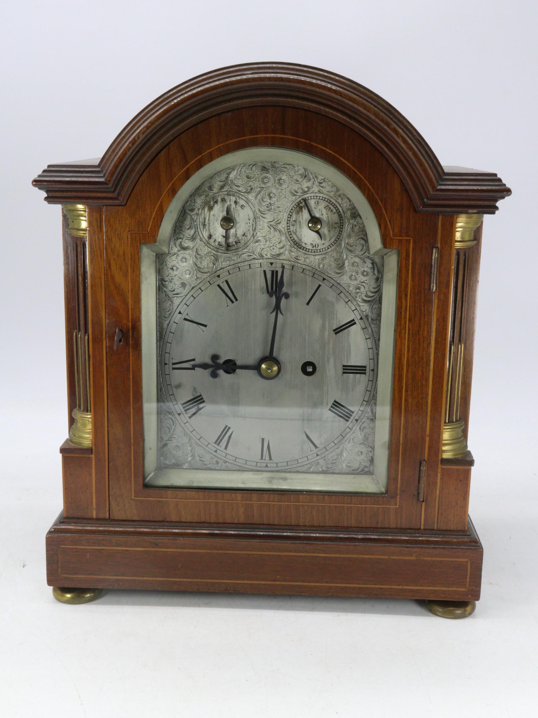 An Edwardian bracket clock with striking movement, having silvered dial and 1/4 column mouldings to case (examine split to top). Key.