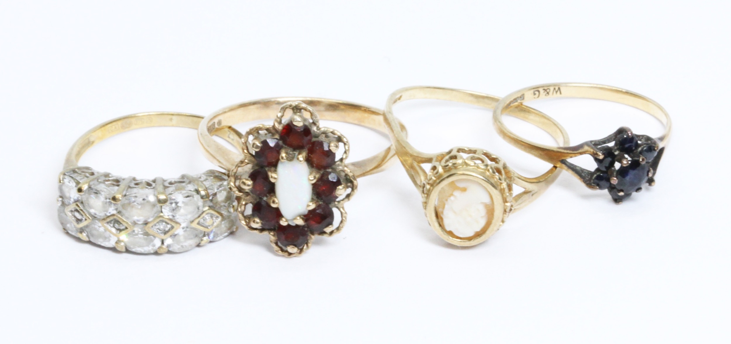 A group of four assorted hallmarked 9ct gold rings, gross weight 7.7g, 10% buyer's premium (inclusive of VAT), normal online bidding fees apply.