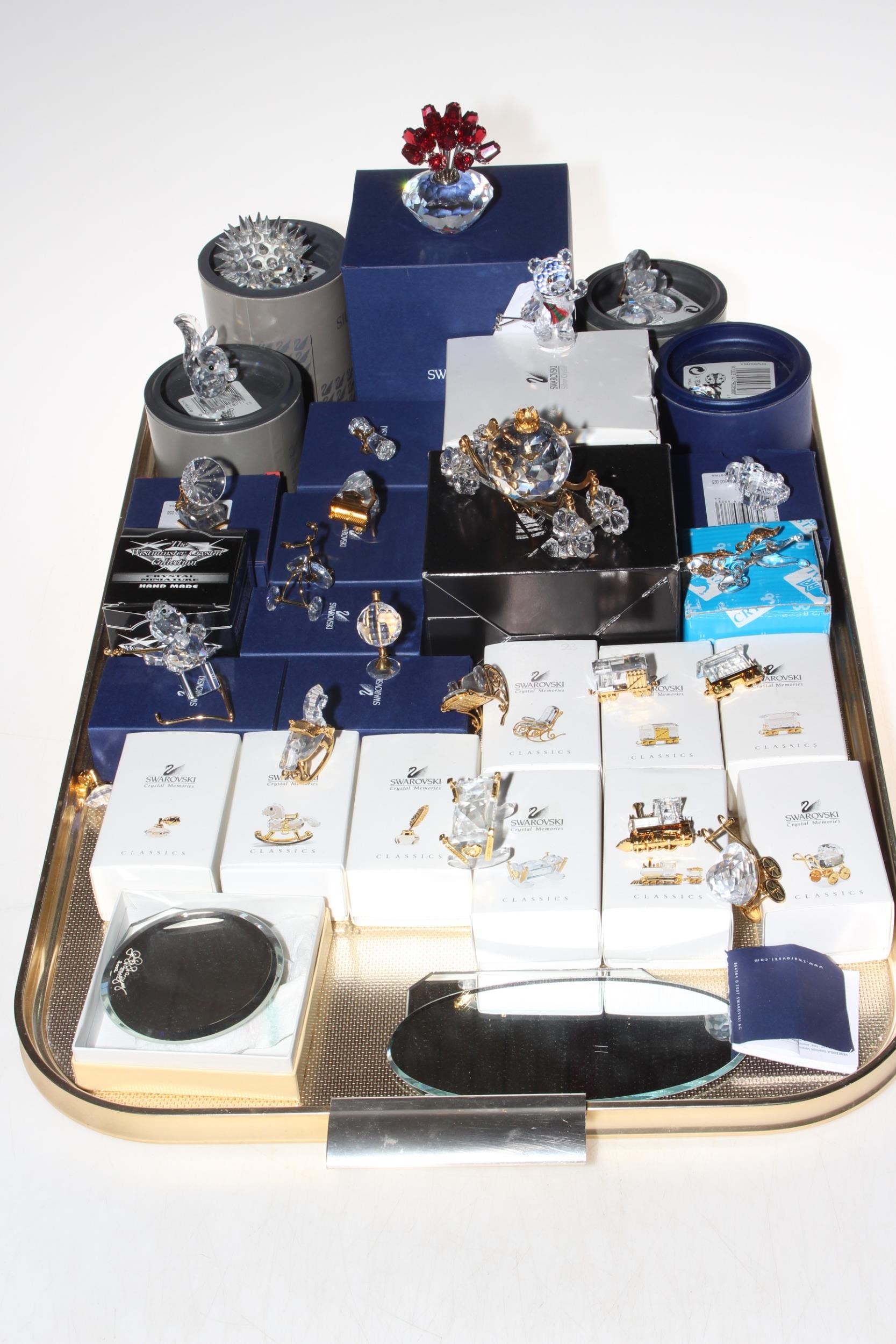 Collection of mostly boxed Swarovski ornaments, and some mirrored stands.