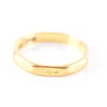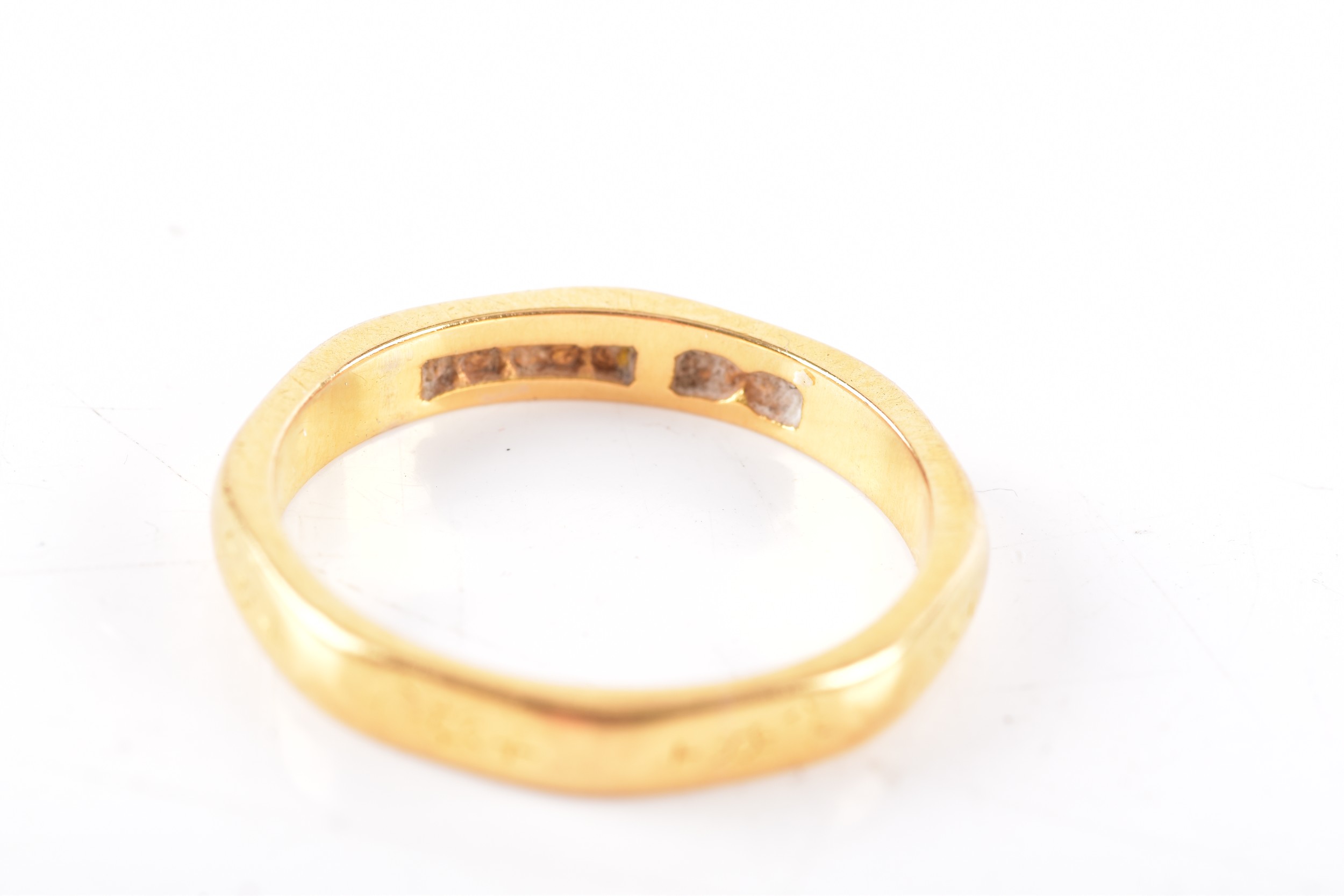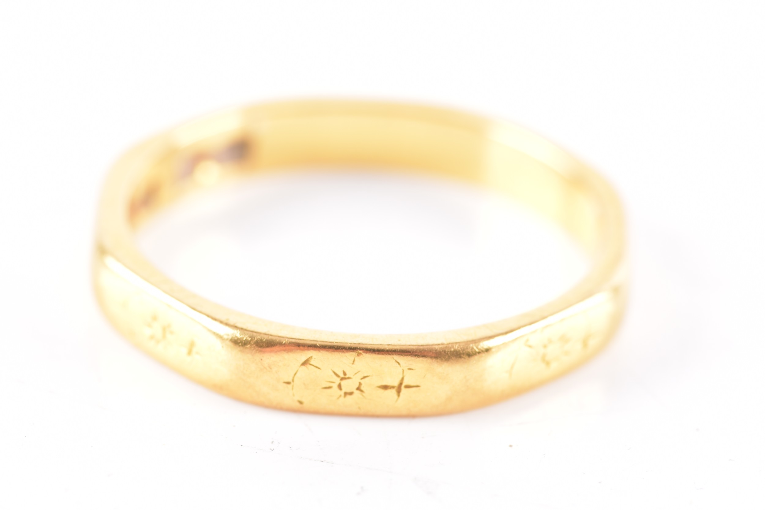An 18ct yellow gold faceted wedding band, featuring worn star motif engraved detail, size J.