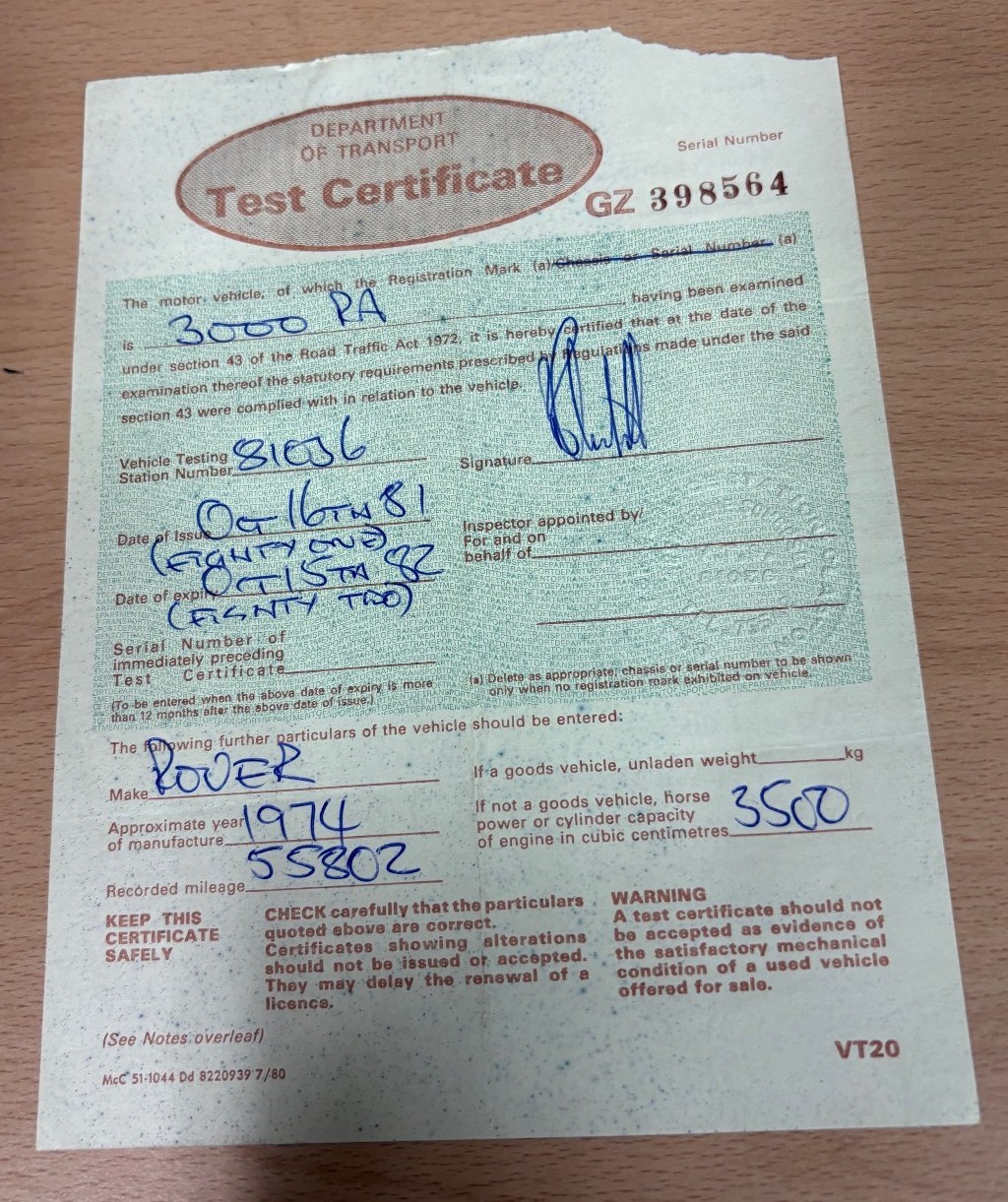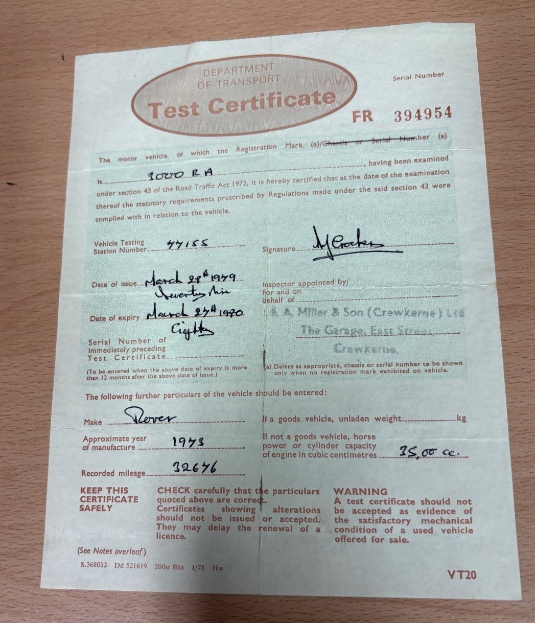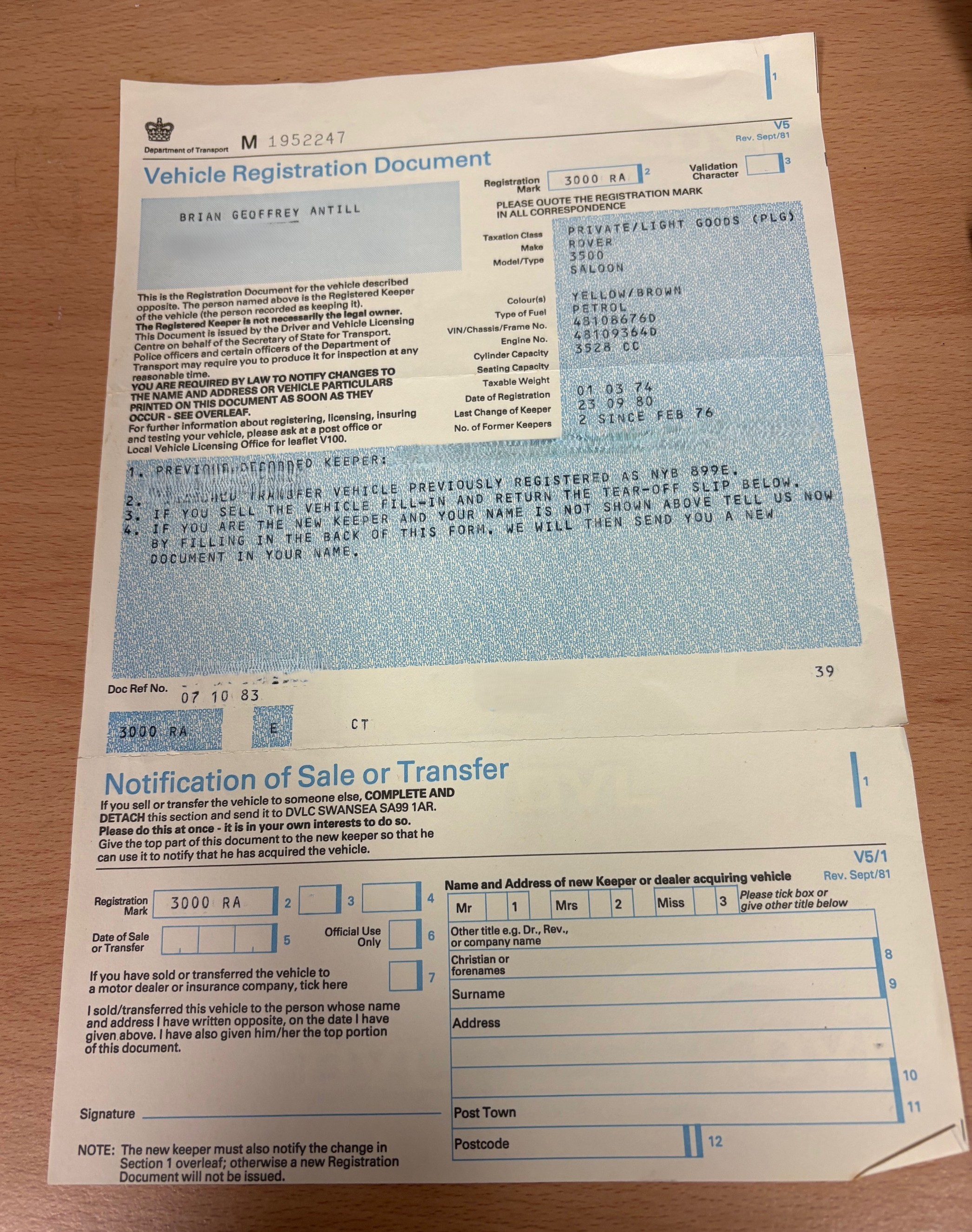 V5 (part only) and small group of paperwork including four previous MOT certificates (1979-1982)