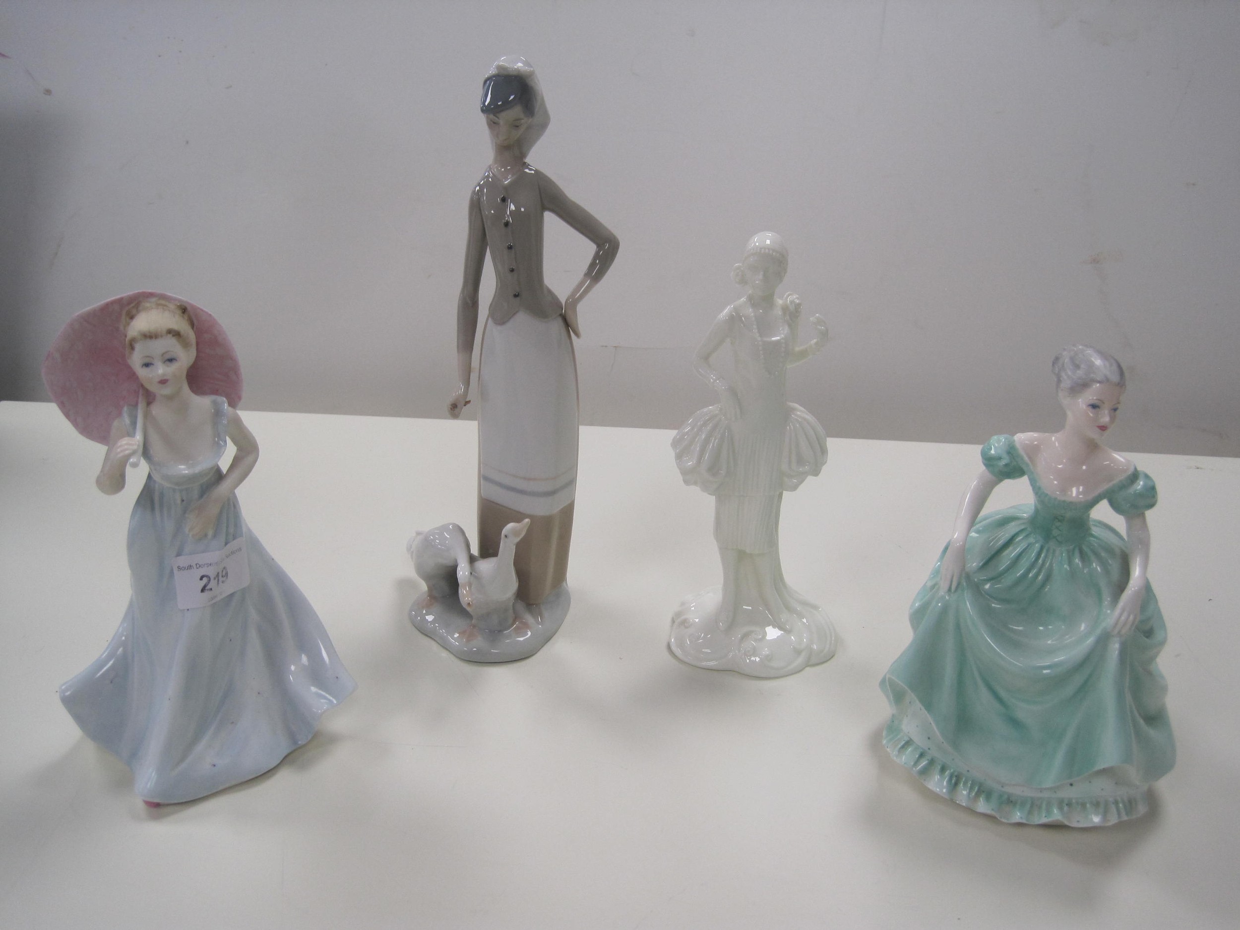 Coalport Ladies of Fashion figurine Henrietta, figurine L'Ombrelle from the same series, Royal Worcester The 1920s Vogue Collection figure 'Kitty 1928', and an a/f damaged LLadro figure of woman and geese.