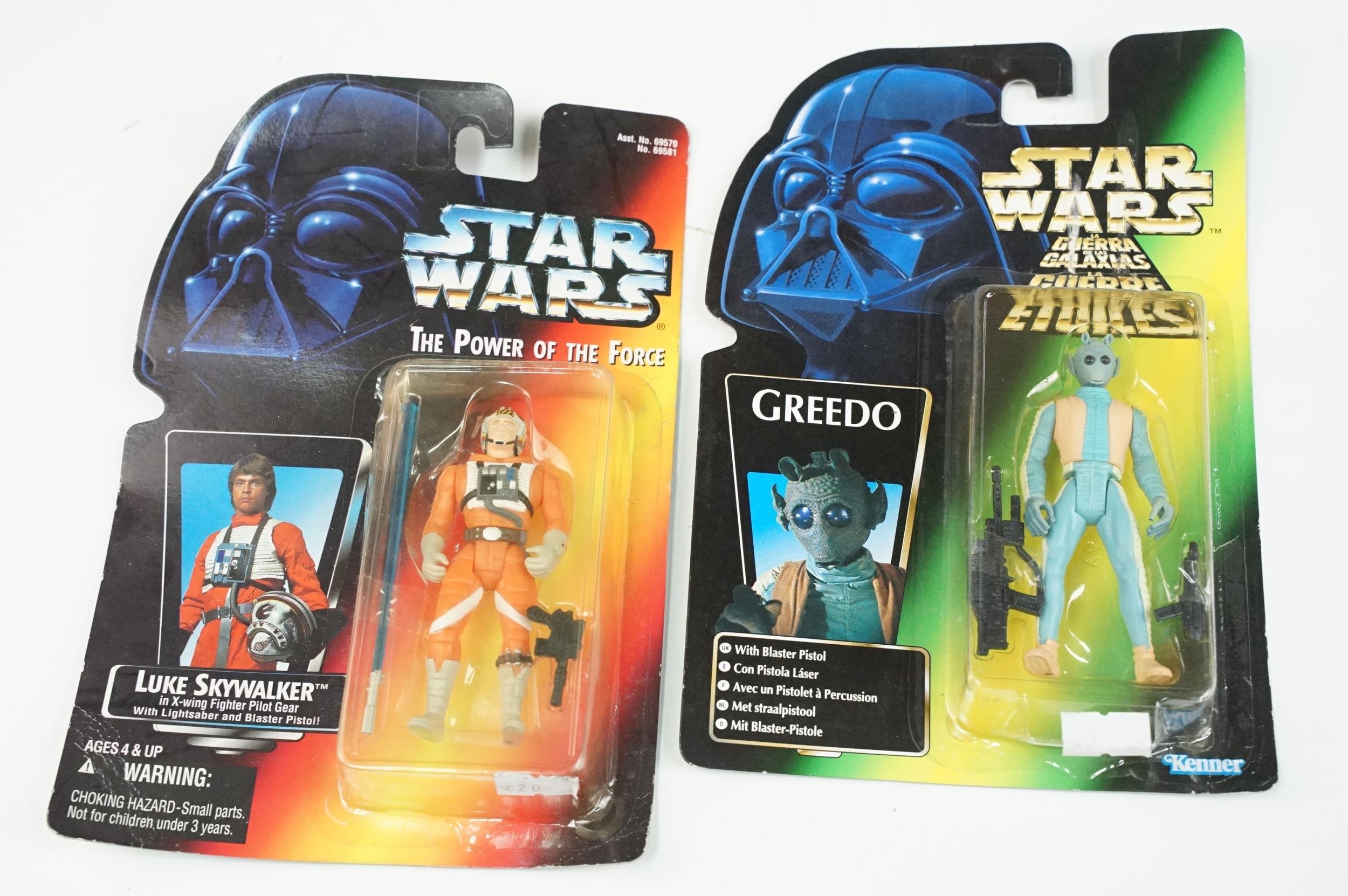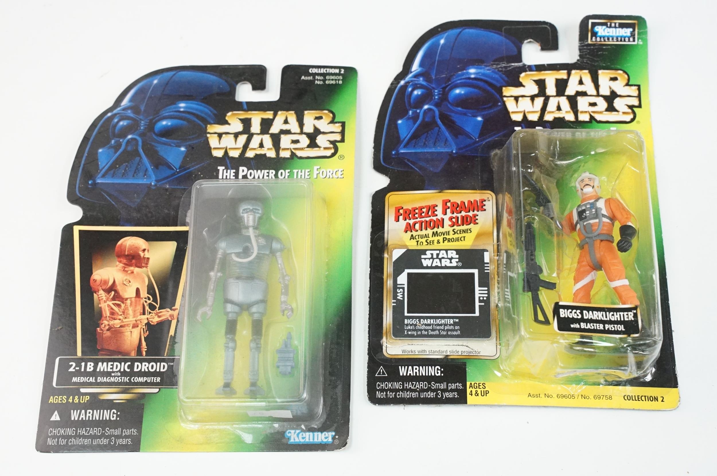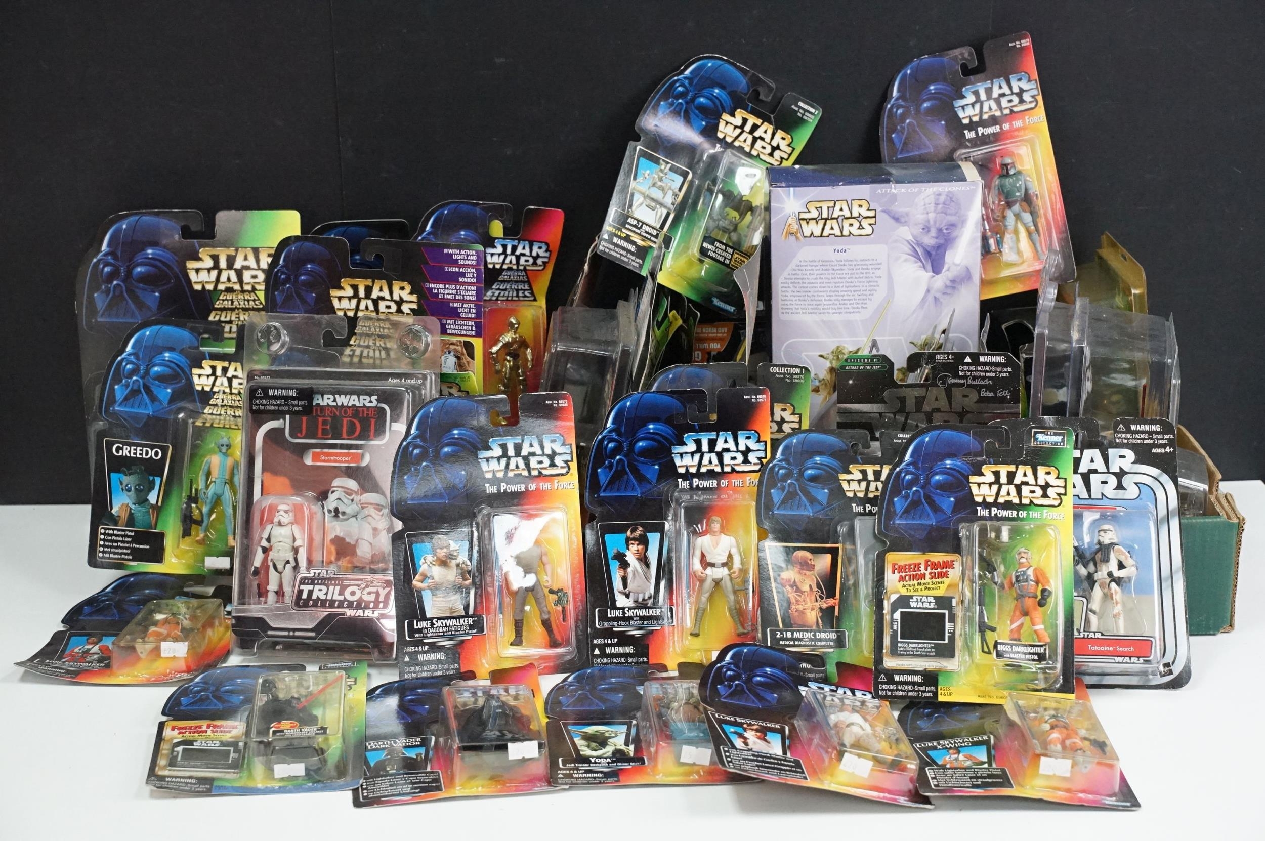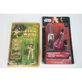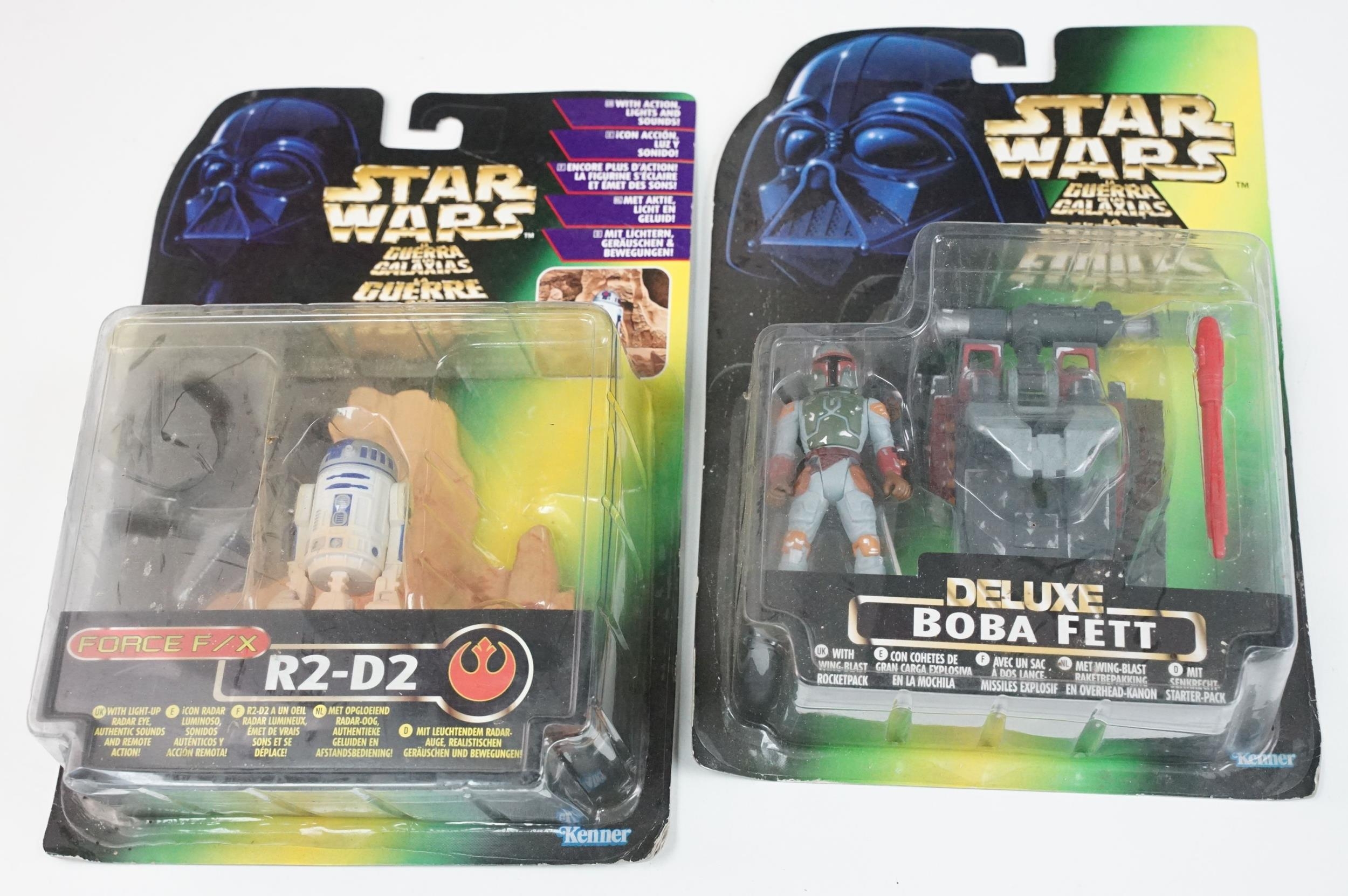 Star Wars - 41 Boxed / carded Hasbro / Kenner Star Wars figures to include The Saga Collection Boba Fett signed by Jeremy Bulloch in silver pen, various The Power Of The Force figures including Force FX R2-D2, Deluxe Boba Fett, Deluxe Han Solo, Darth Vader with Freeze Frame Action Slide, etc, small quantity of Episode I figures including Electronic Commtech Reader, etc, boxes / cards showing signs of wear throughout (2 Boxes)