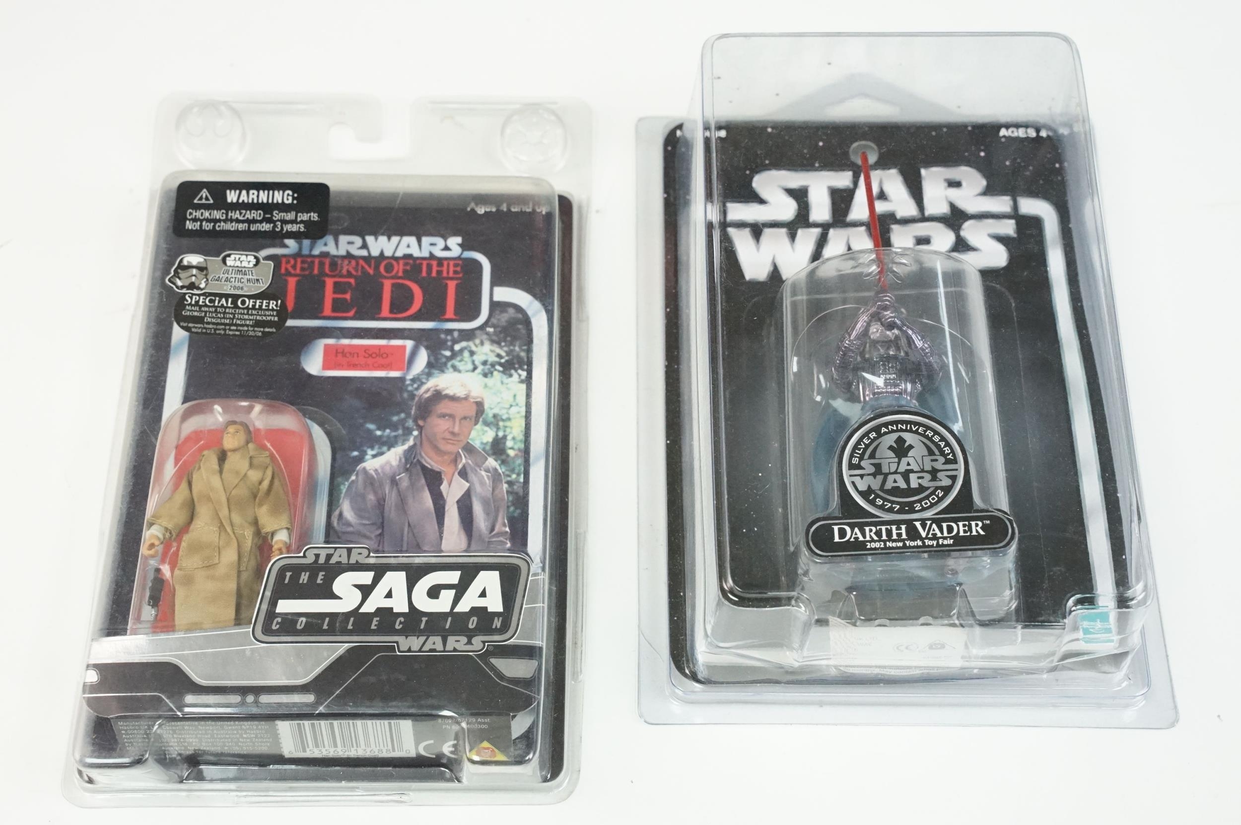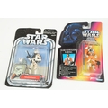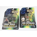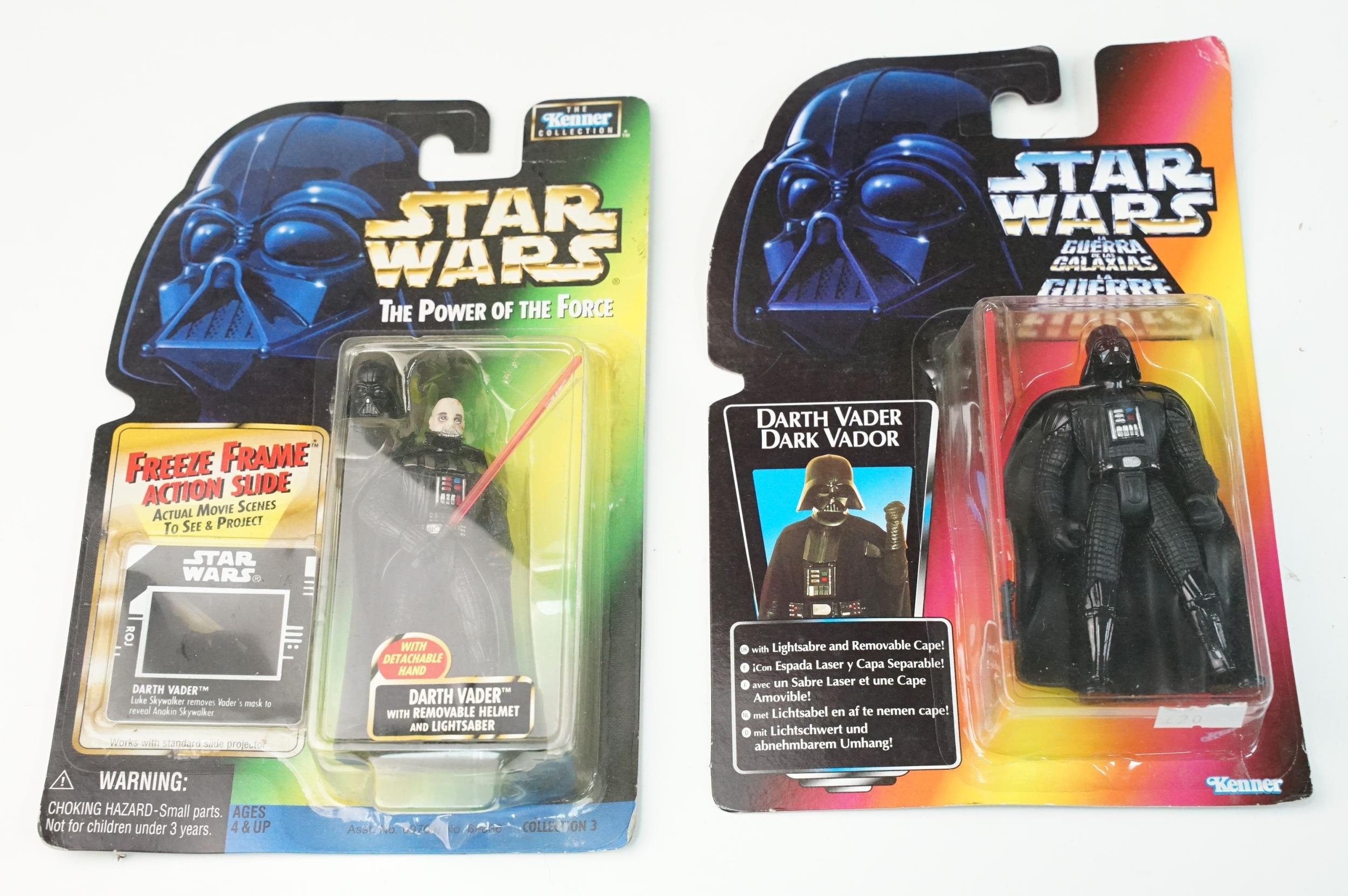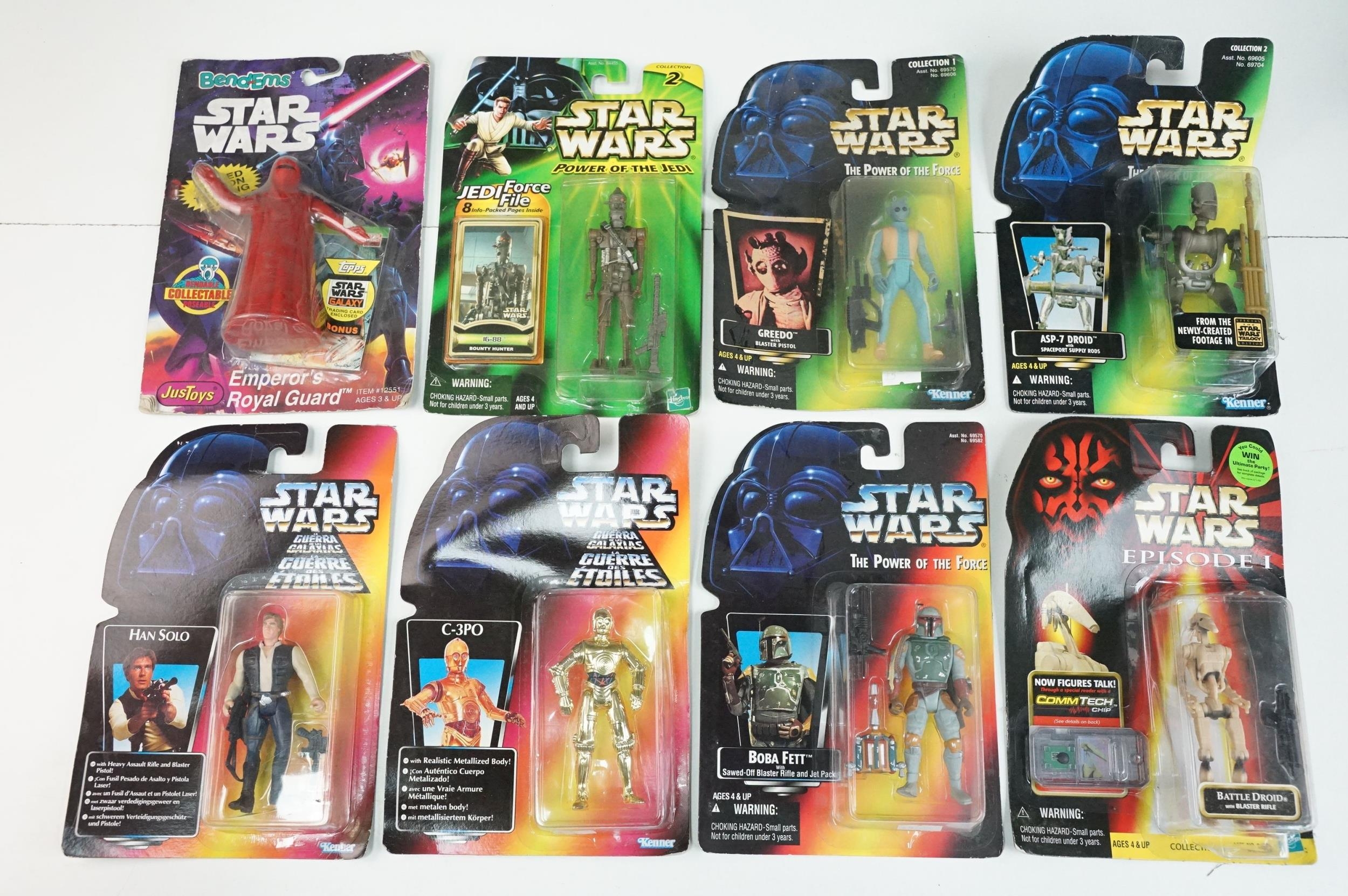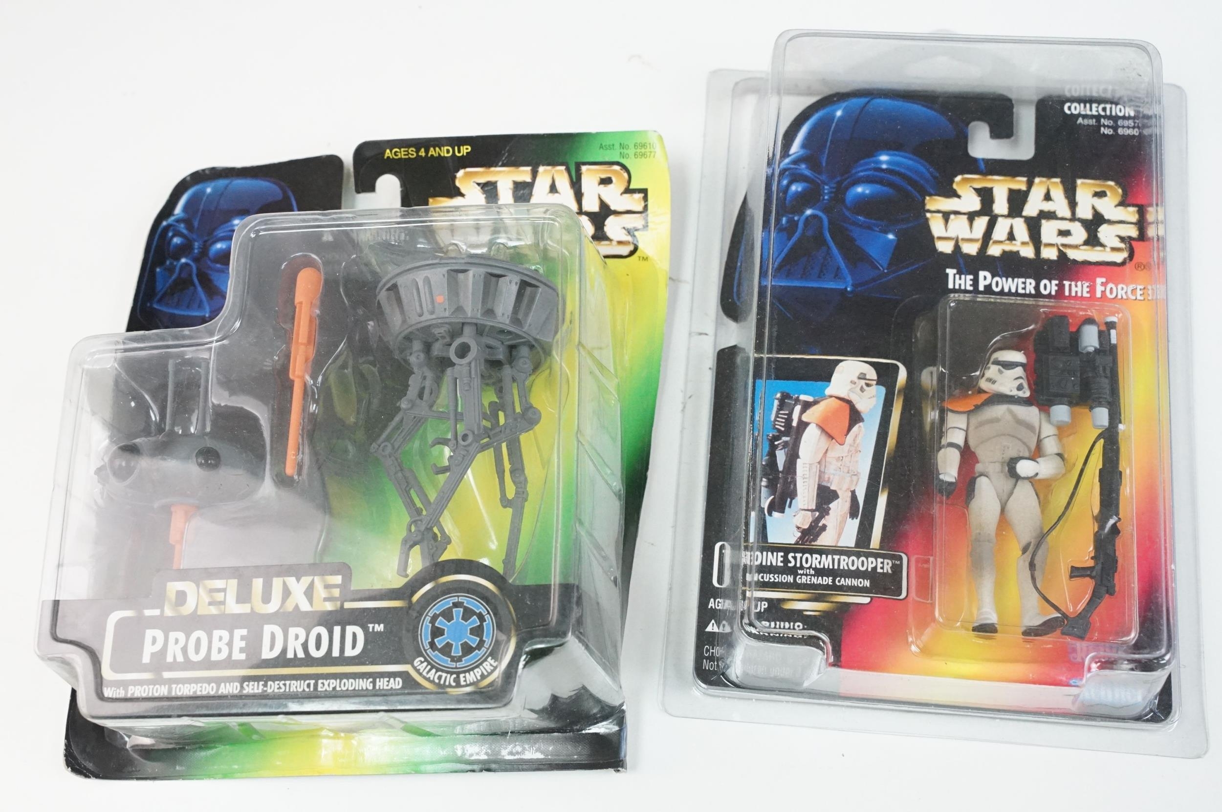 Star Wars - 41 Boxed / carded Hasbro / Kenner Star Wars figures to include The Saga Collection Boba Fett signed by Jeremy Bulloch in silver pen, various The Power Of The Force figures including Force FX R2-D2, Deluxe Boba Fett, Deluxe Han Solo, Darth Vader with Freeze Frame Action Slide, etc, small quantity of Episode I figures including Electronic Commtech Reader, etc, boxes / cards showing signs of wear throughout (2 Boxes)