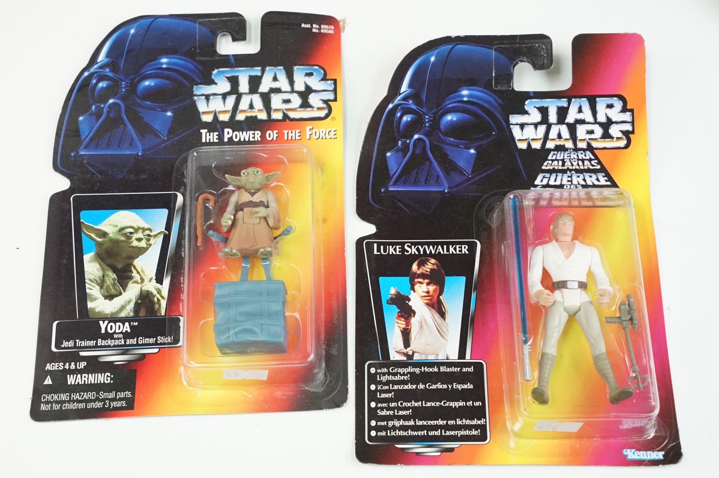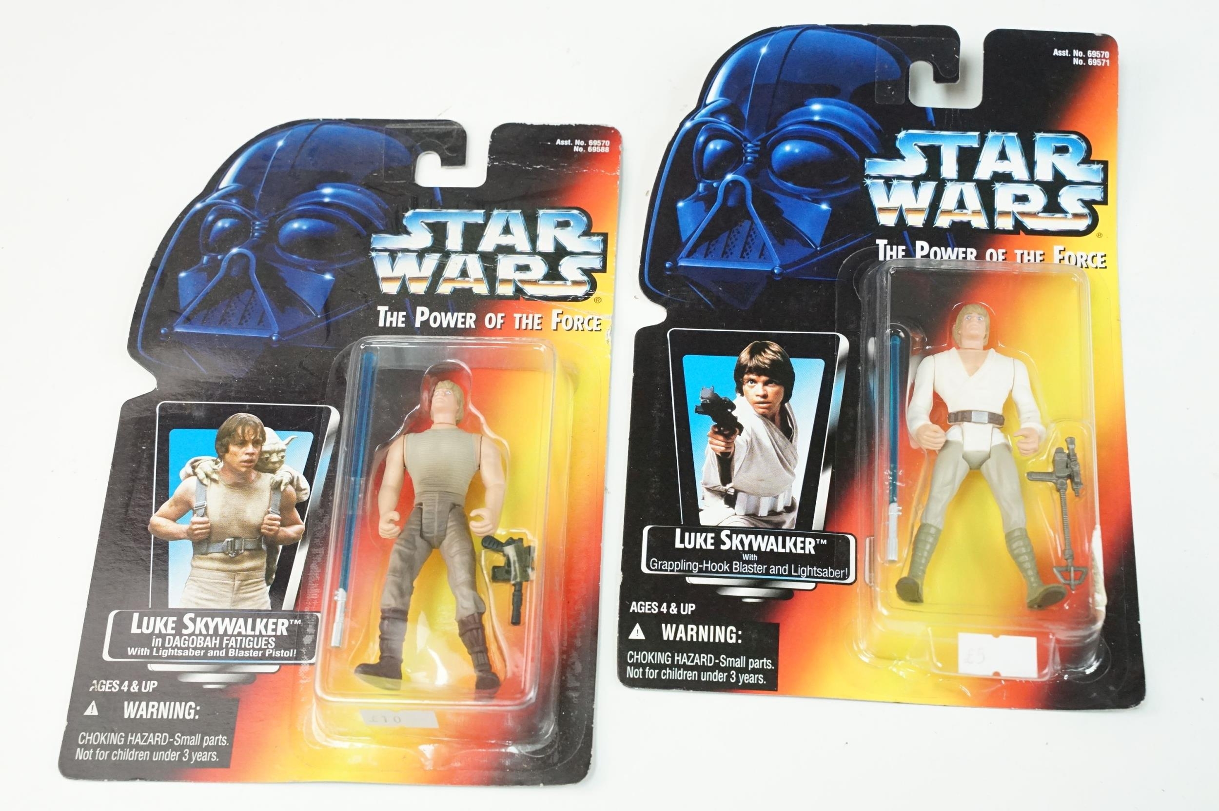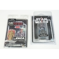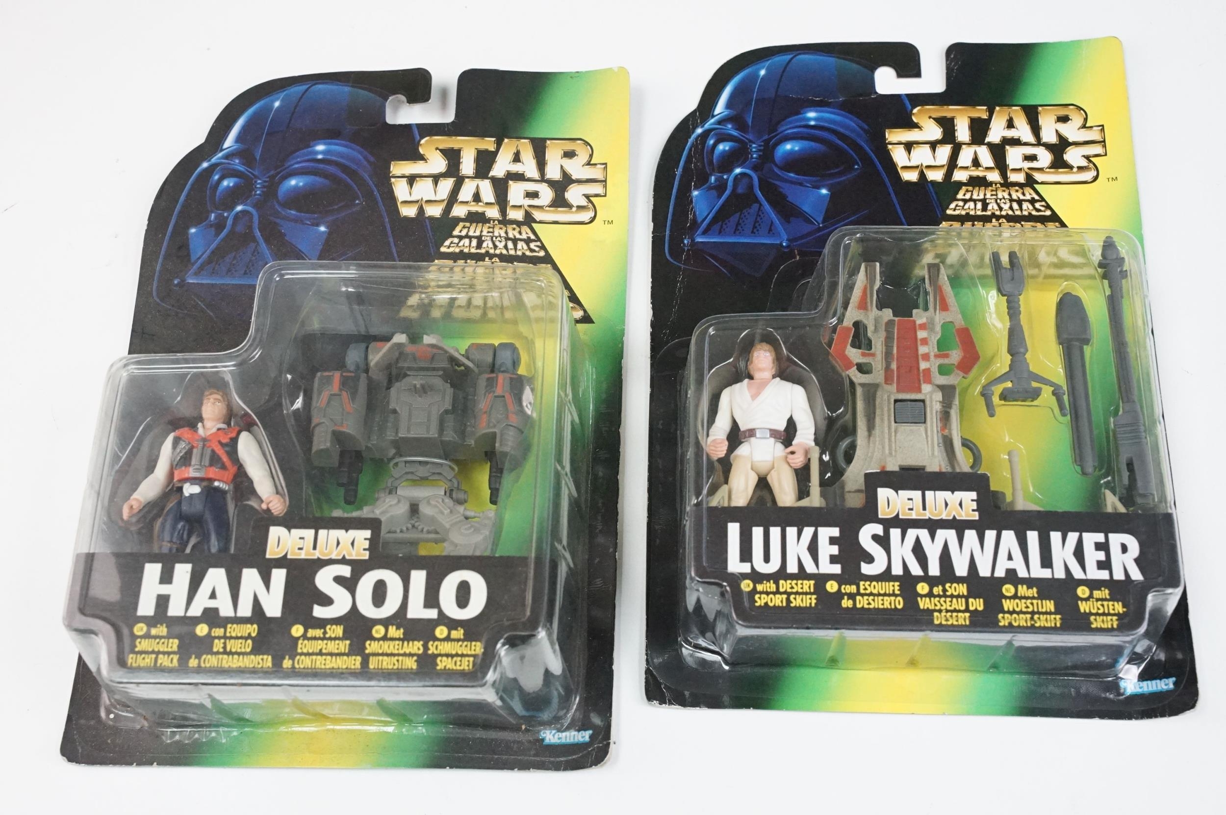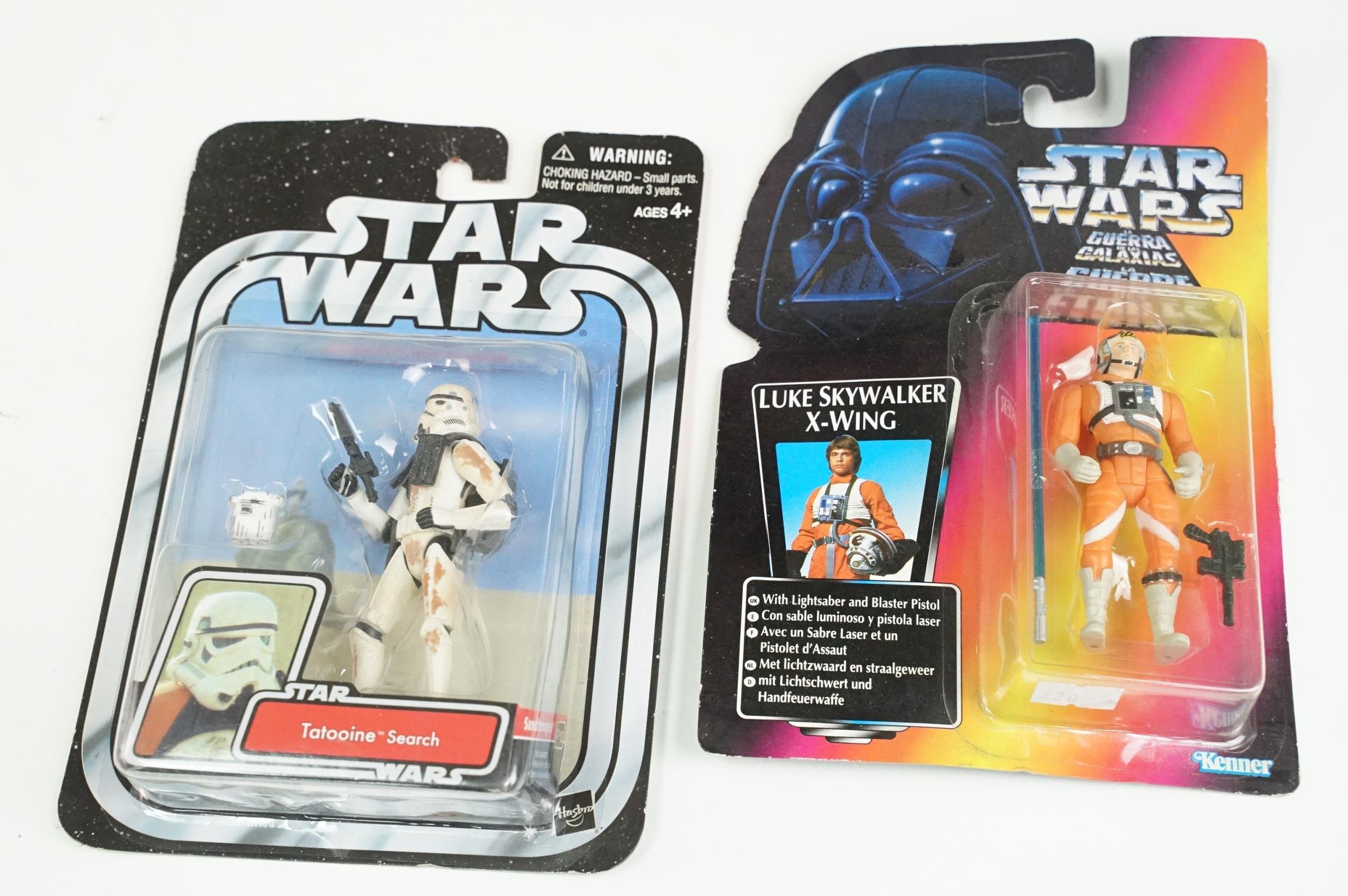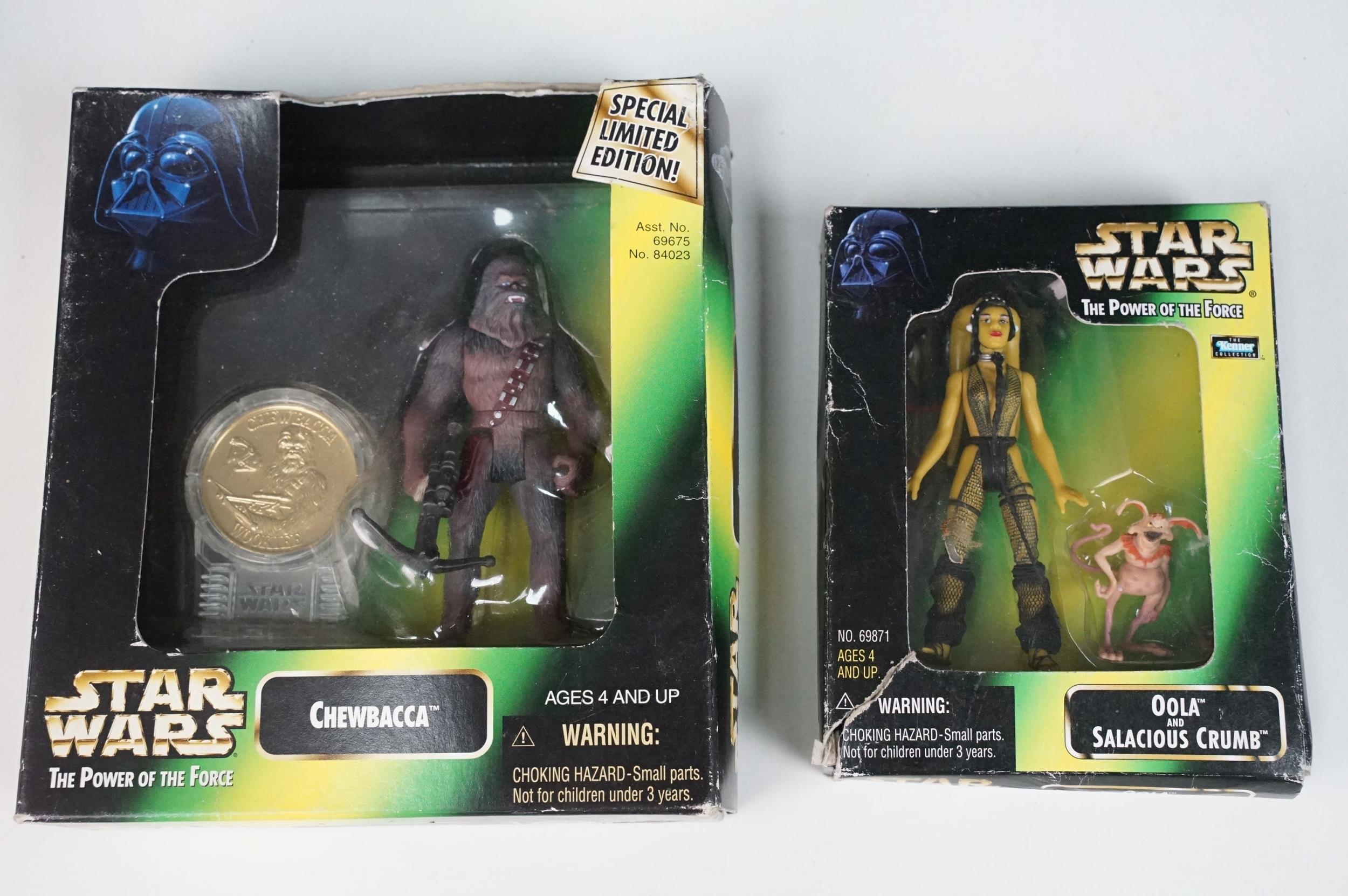 Star Wars - 41 Boxed / carded Hasbro / Kenner Star Wars figures to include The Saga Collection Boba Fett signed by Jeremy Bulloch in silver pen, various The Power Of The Force figures including Force FX R2-D2, Deluxe Boba Fett, Deluxe Han Solo, Darth Vader with Freeze Frame Action Slide, etc, small quantity of Episode I figures including Electronic Commtech Reader, etc, boxes / cards showing signs of wear throughout (2 Boxes)
