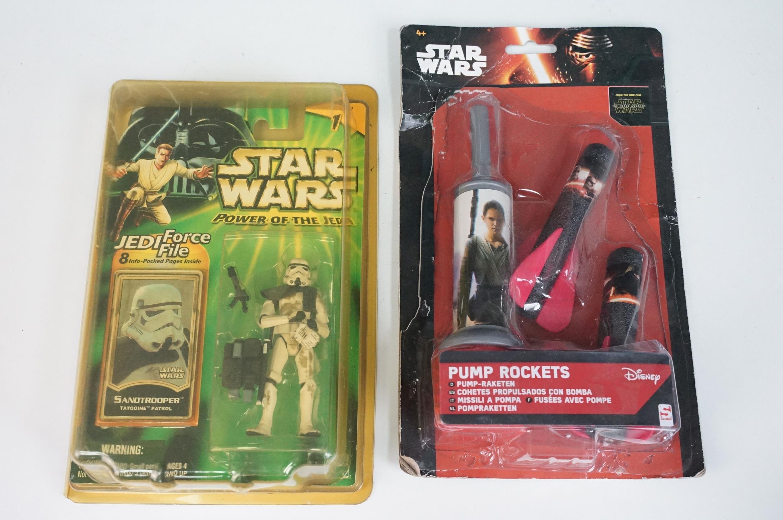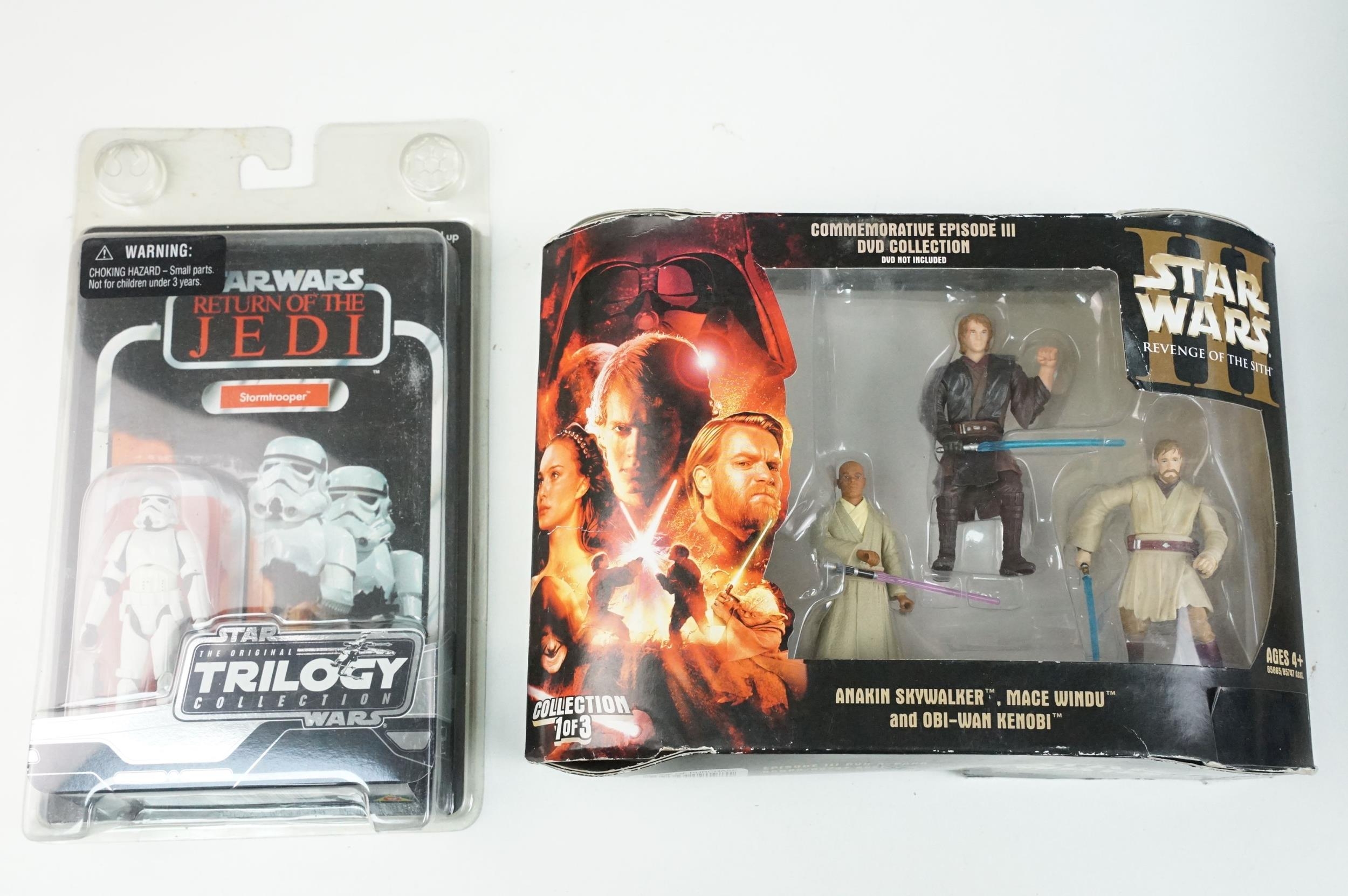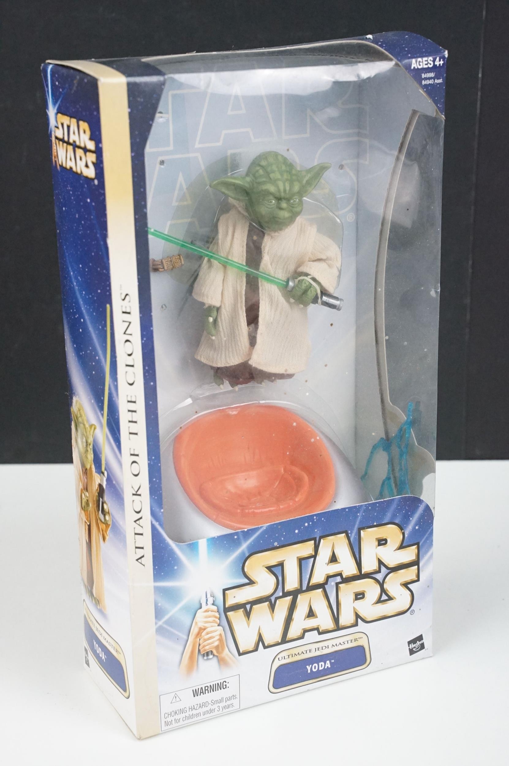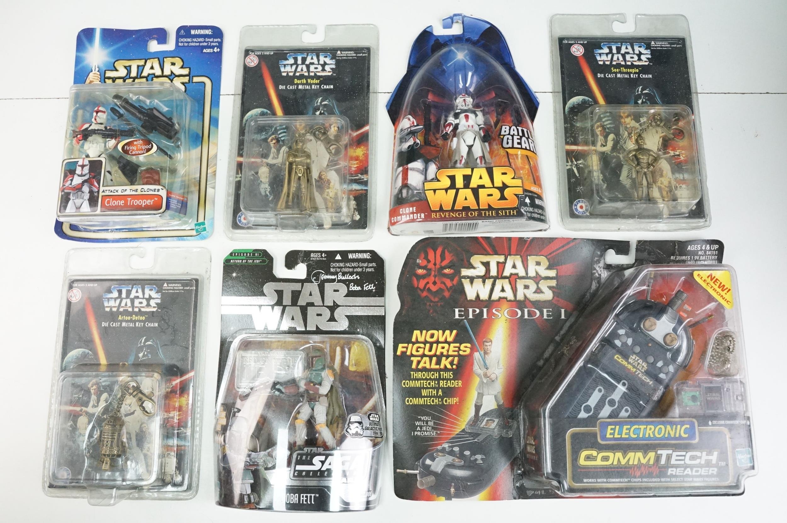 Star Wars - 41 Boxed / carded Hasbro / Kenner Star Wars figures to include The Saga Collection Boba Fett signed by Jeremy Bulloch in silver pen, various The Power Of The Force figures including Force FX R2-D2, Deluxe Boba Fett, Deluxe Han Solo, Darth Vader with Freeze Frame Action Slide, etc, small quantity of Episode I figures including Electronic Commtech Reader, etc, boxes / cards showing signs of wear throughout (2 Boxes)