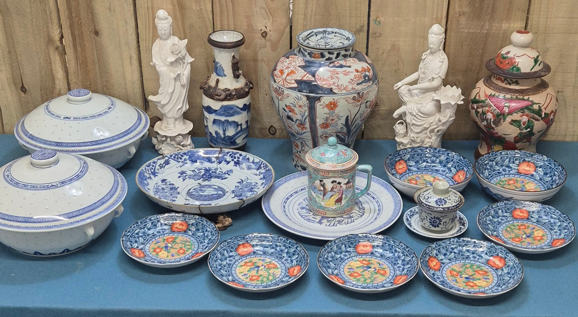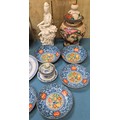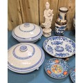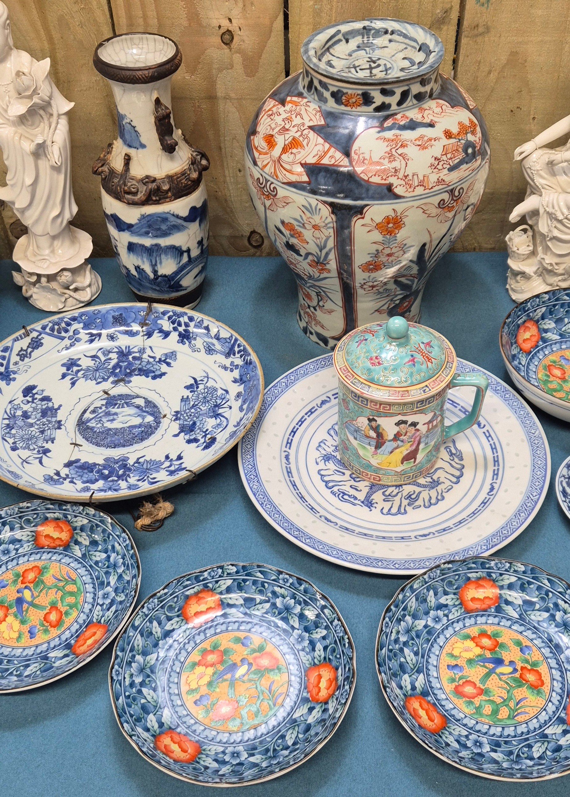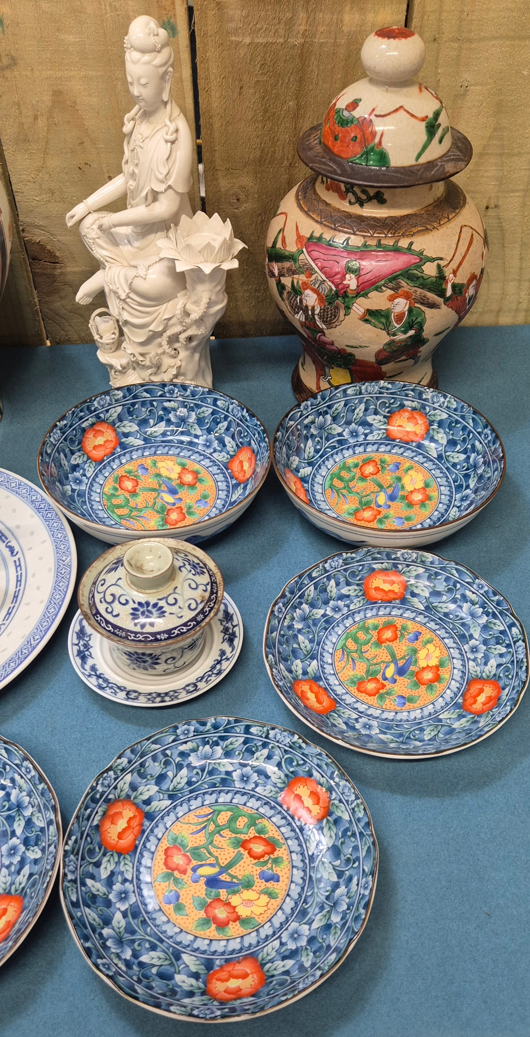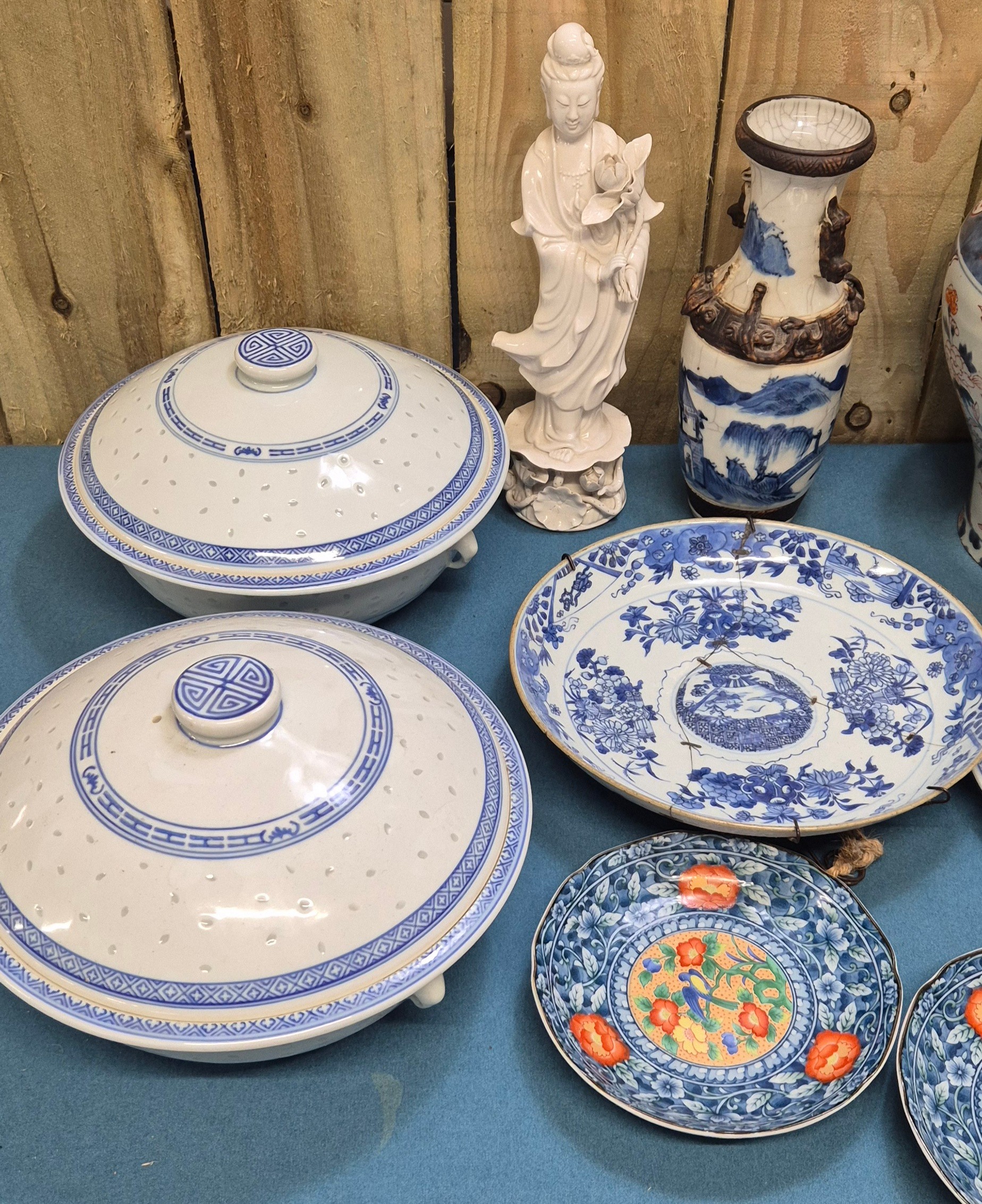 Collection of 19th & 20th century Chinese Porcelain; Pair of antique Blanc De Chine buddha sculptures, Chinese blue & white vase with brown relief design- reign mark to base, Plates & other items . 29.5cm in height.