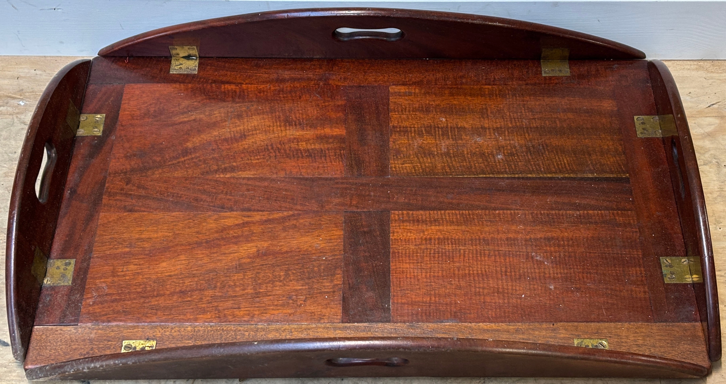 A mahogany butlers tray, 88x66cm overall when the sides are down