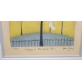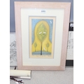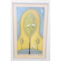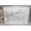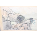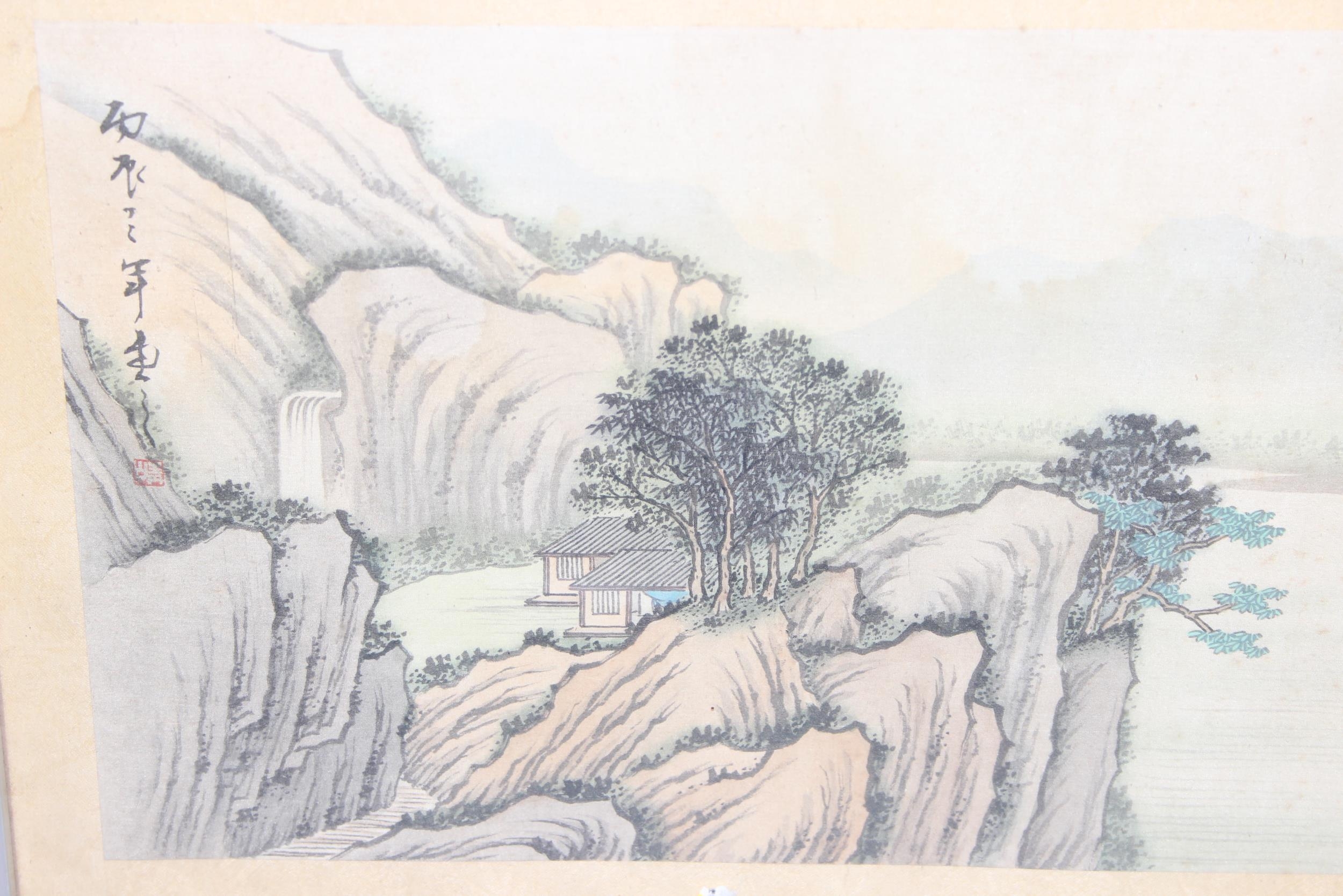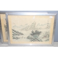 Mix of original artworks and prints to incl: an abstract limited edition print (129/375) of 'Longing by the Lemon Grove' by Adam Barsby, 2 landscape pen drawings by Eugene Fisk (1938-2018), signed, and 2 framed Chinese watercolours on silk of mountainous village scenes and a scroll painting of pandas and bamboo leaves, largest approx 56 x 41cm