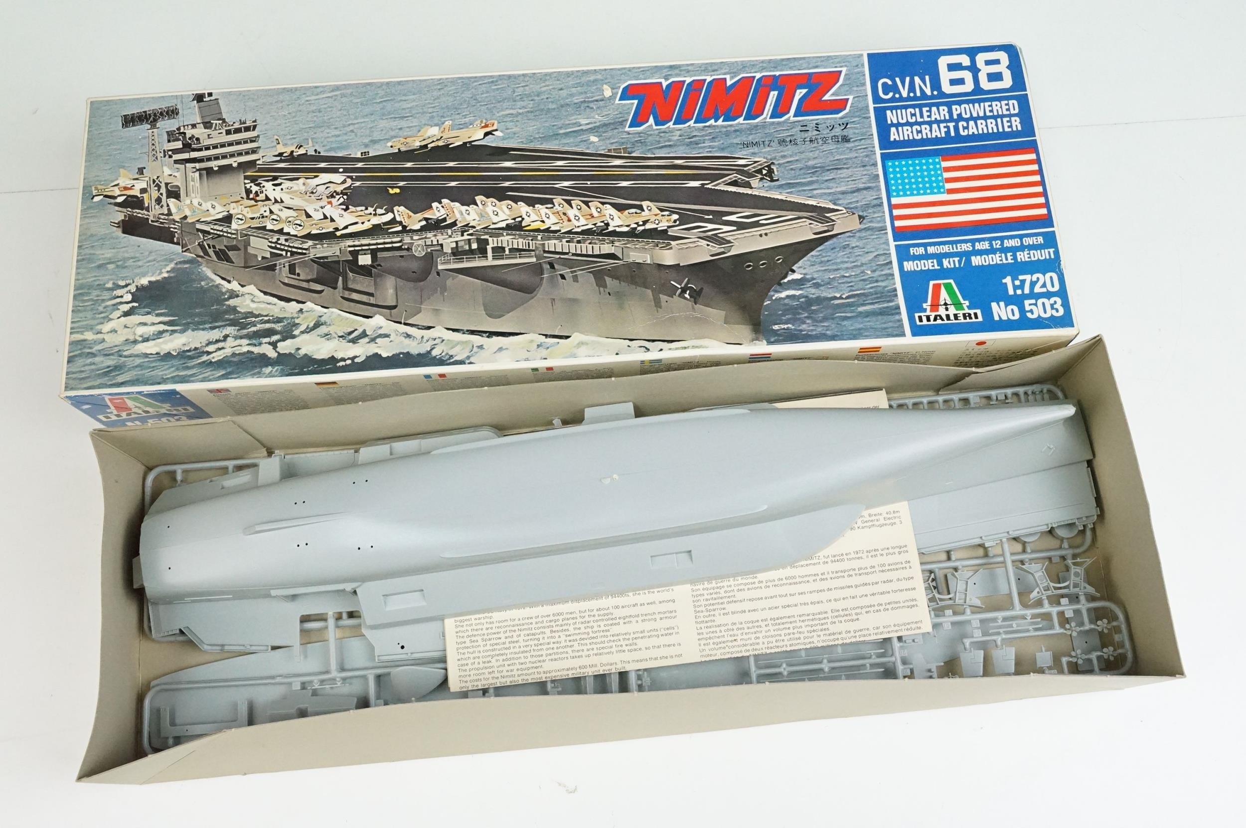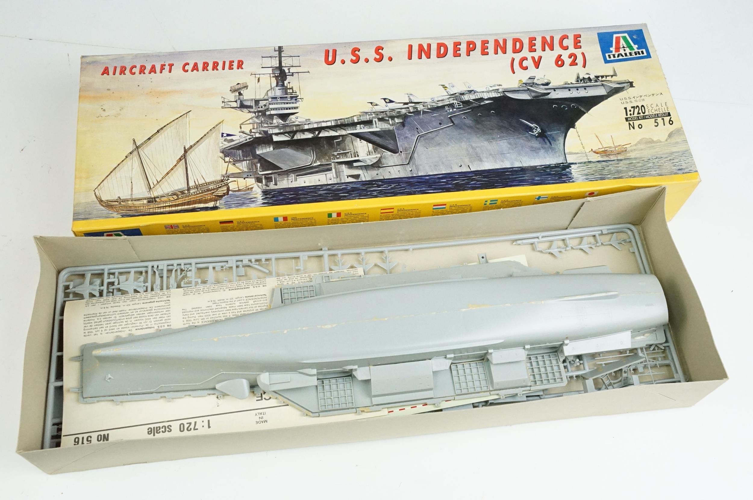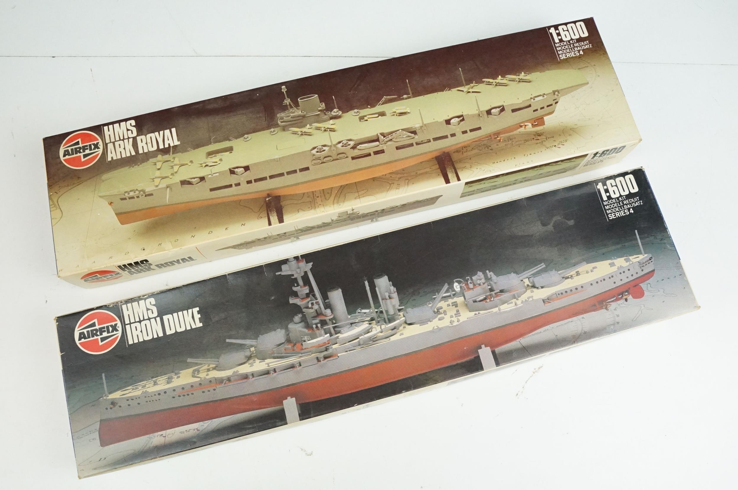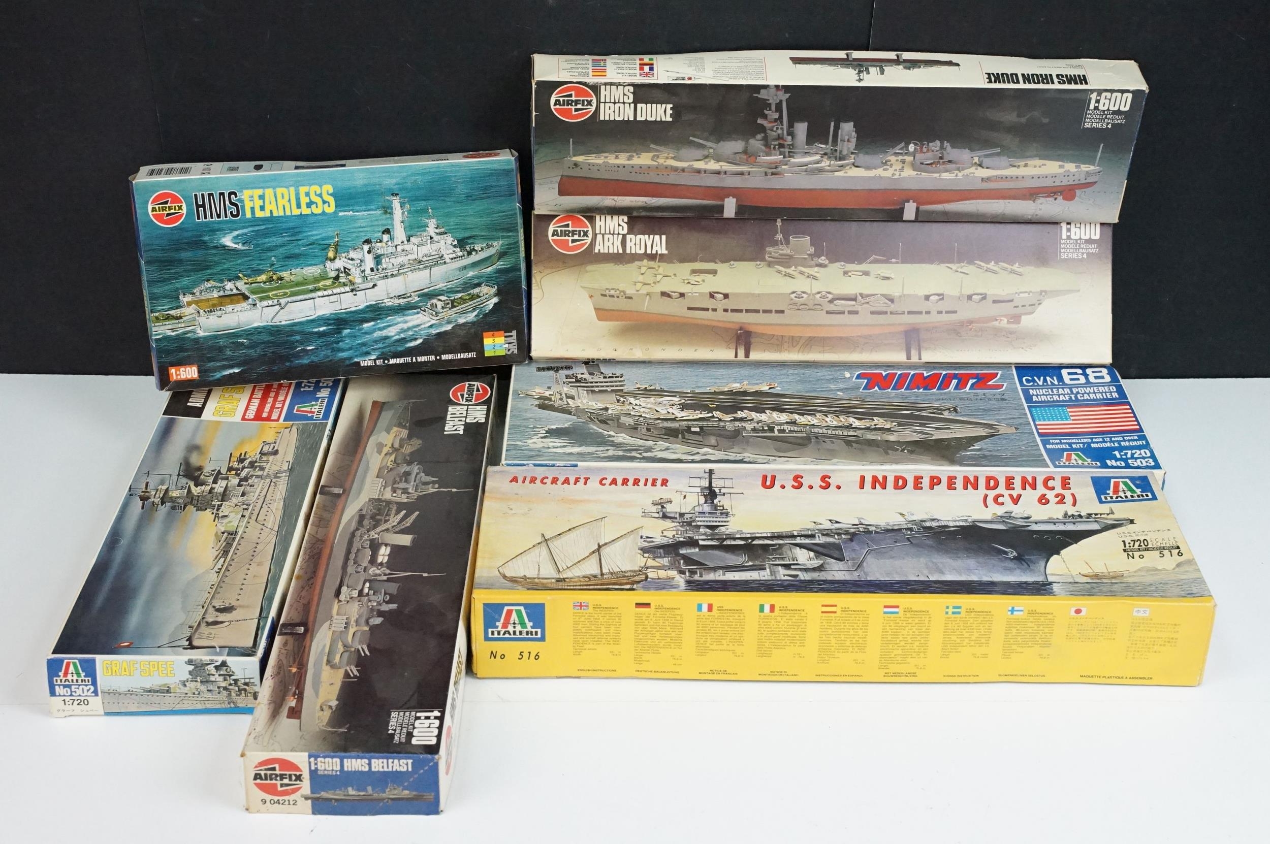 Seven boxed plastic model ship kits to include 2 x Italeri 1/720 (No 516 USS Independence CV 62 Aircraft Carrier & No 503 Nimitz CVN 68), and 5 x Airfix (03202 HMS Feerless, 04210 HMS Iron Duke, 4208 HMS Ark Royal & 4212 HMS Belfast), all unbuilt and appearing complete