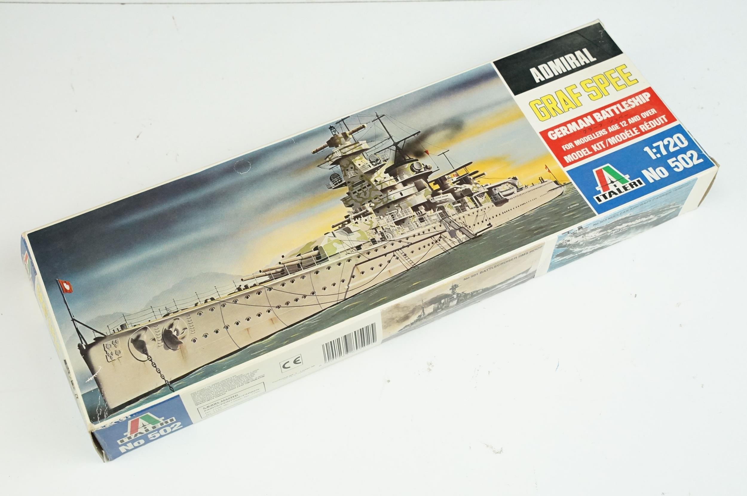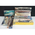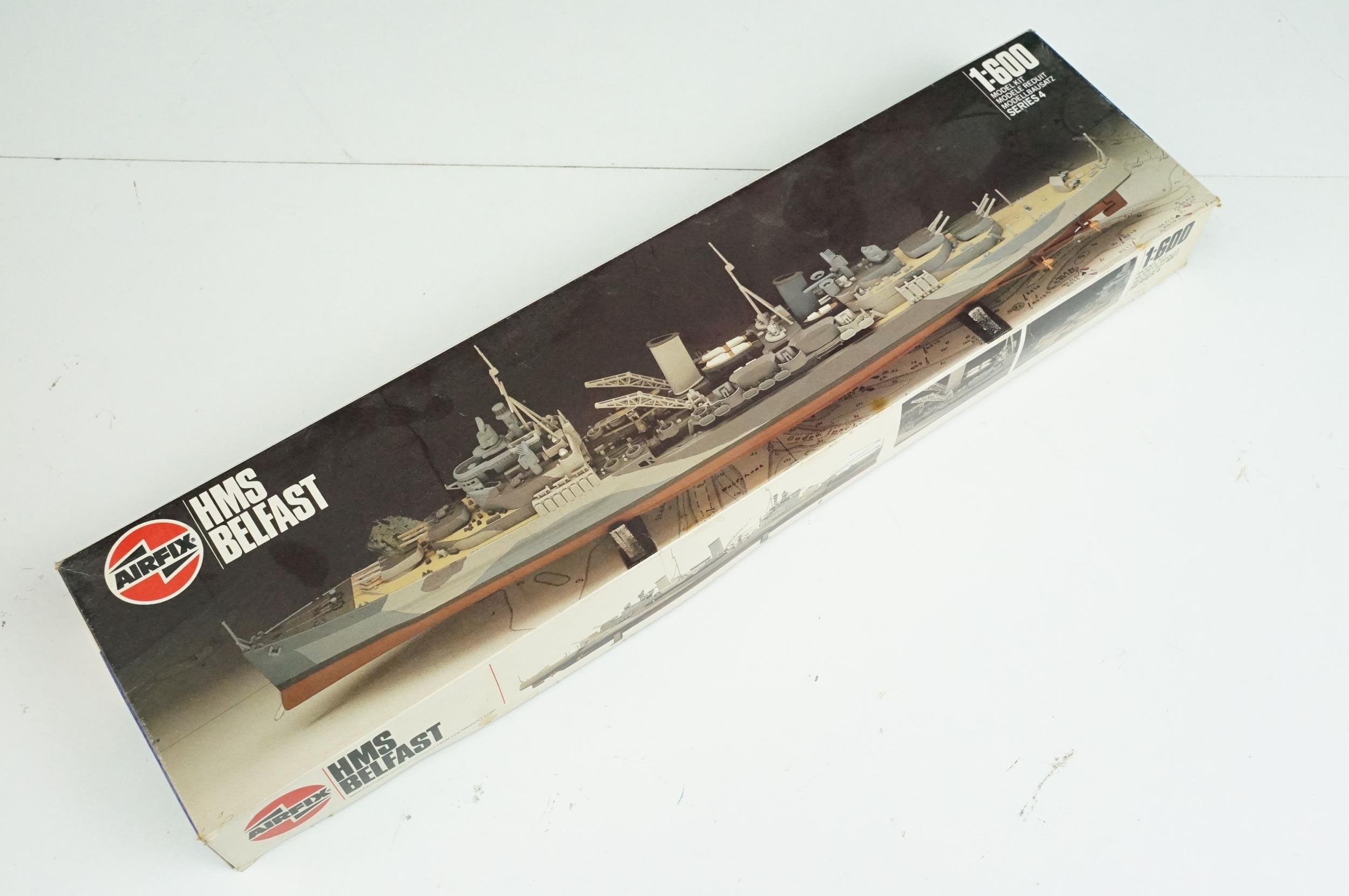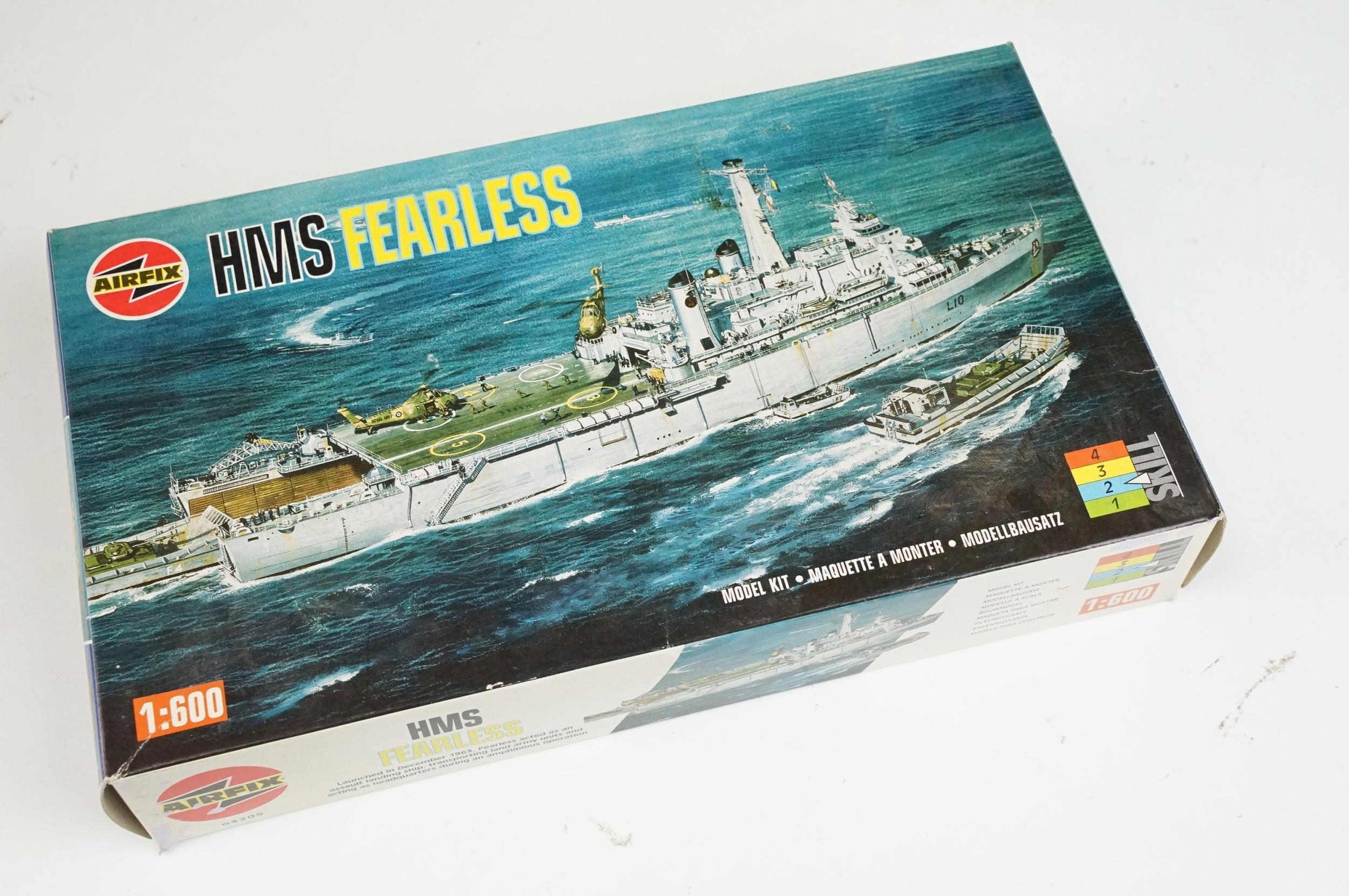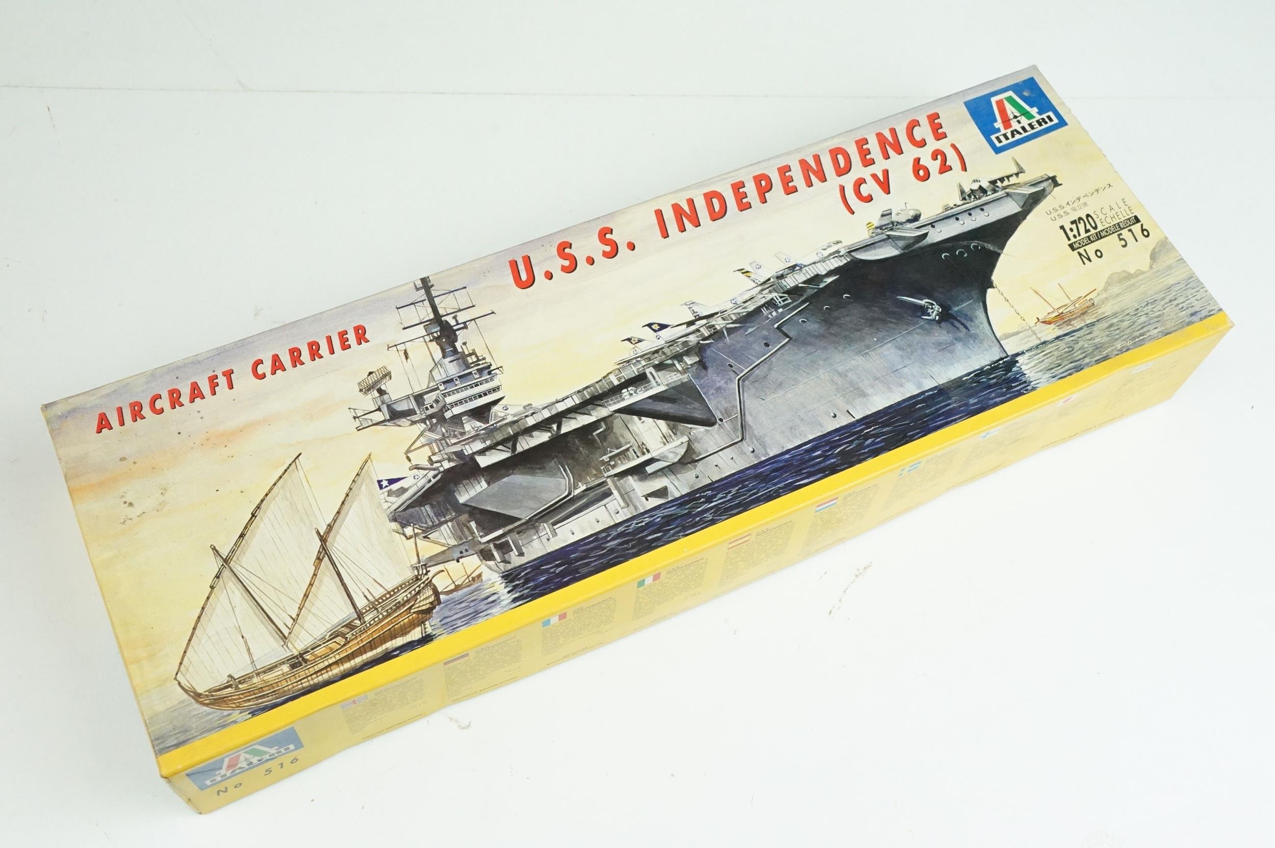 Seven boxed plastic model ship kits to include 2 x Italeri 1/720 (No 516 USS Independence CV 62 Aircraft Carrier & No 503 Nimitz CVN 68), and 5 x Airfix (03202 HMS Feerless, 04210 HMS Iron Duke, 4208 HMS Ark Royal & 4212 HMS Belfast), all unbuilt and appearing complete