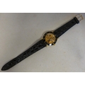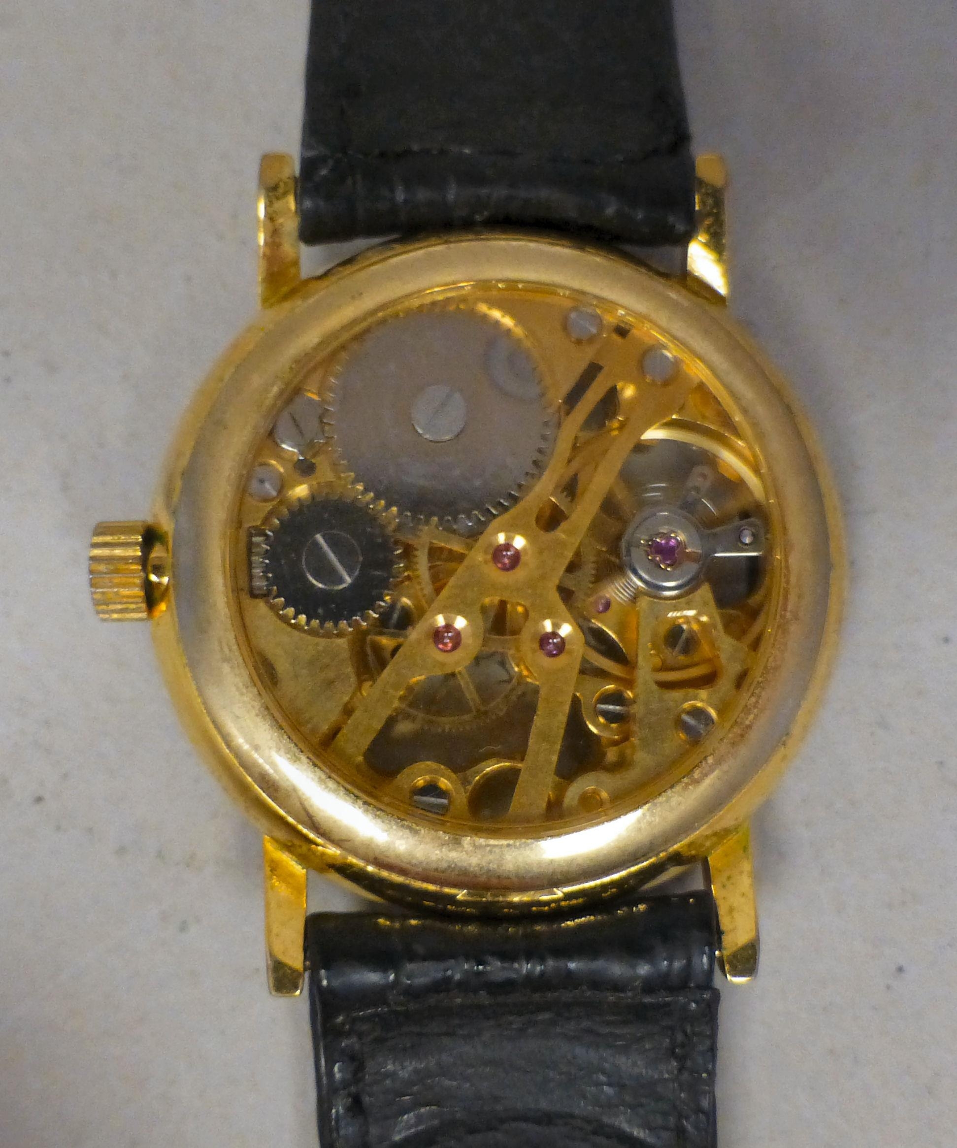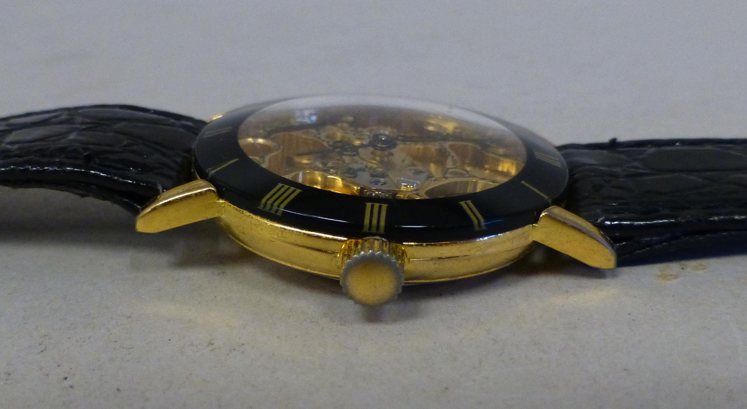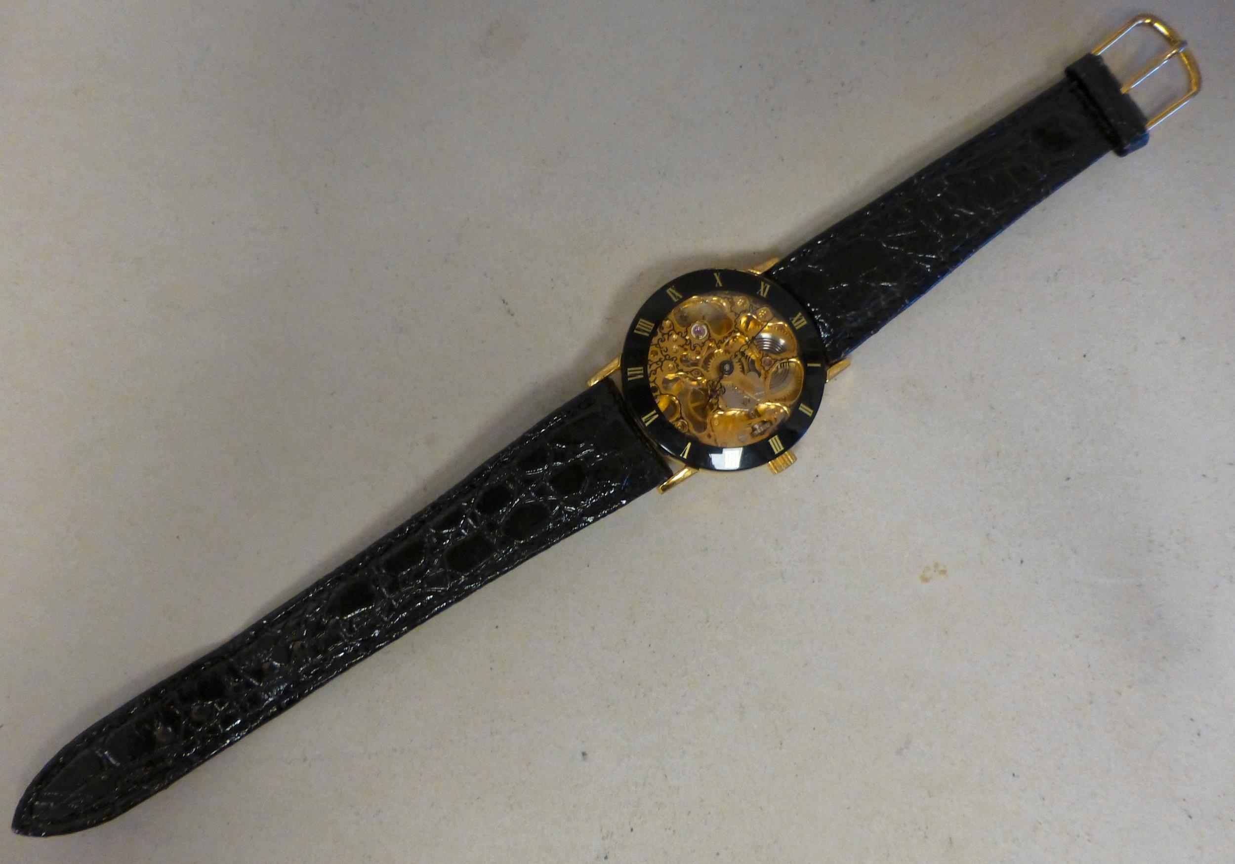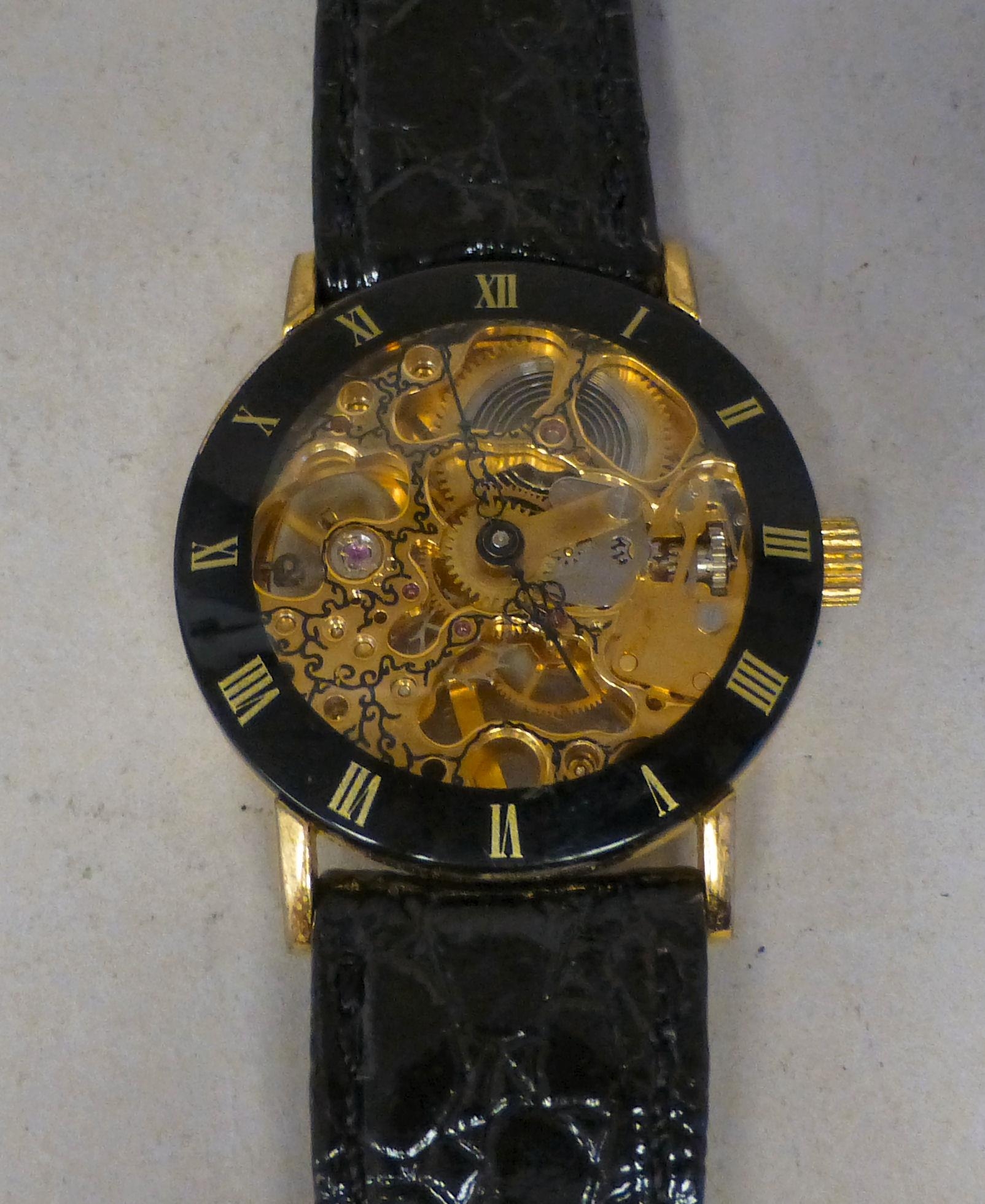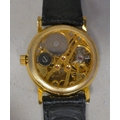 A modern gold plated manual skeleton wristwatch, faced by a Roman dial