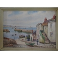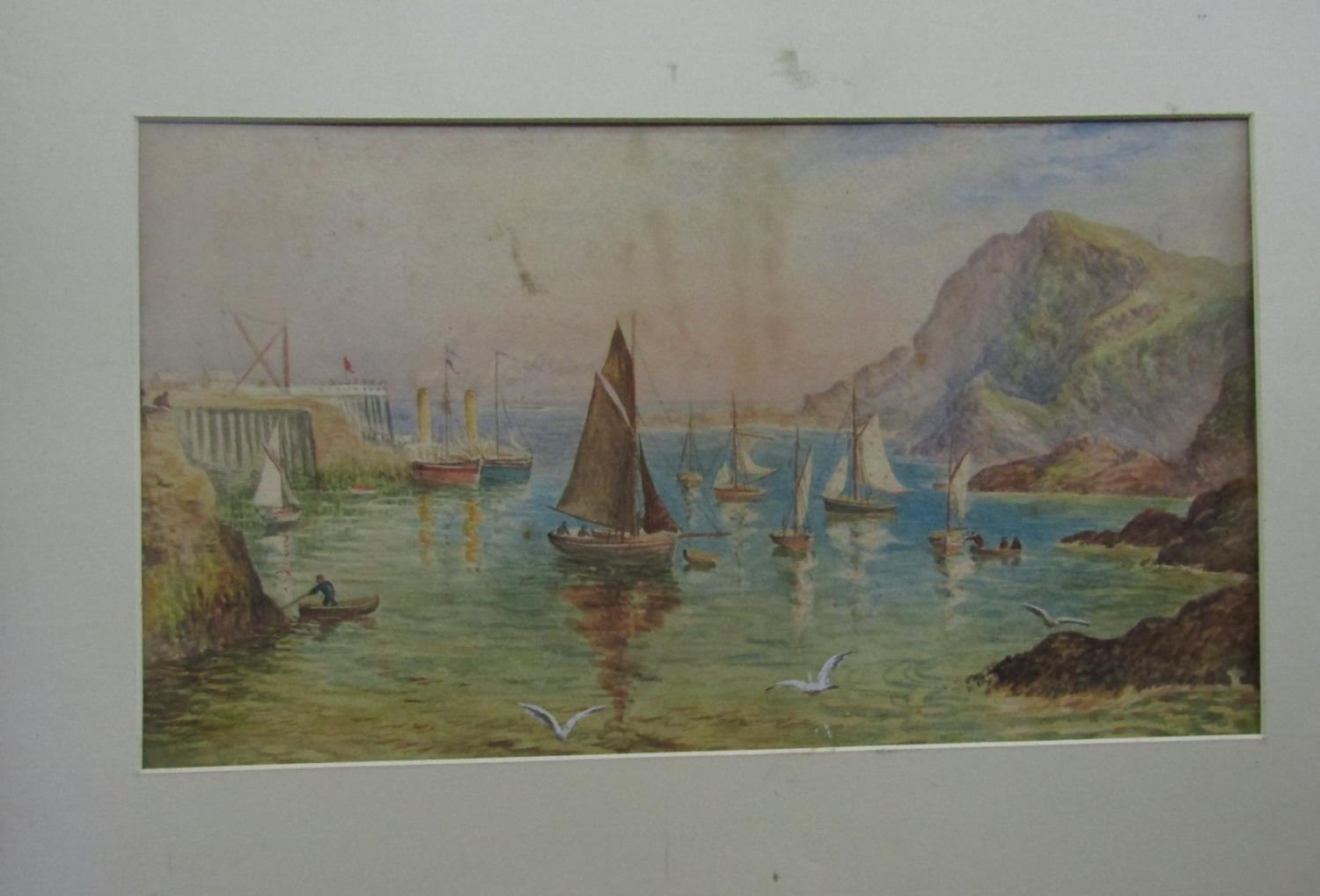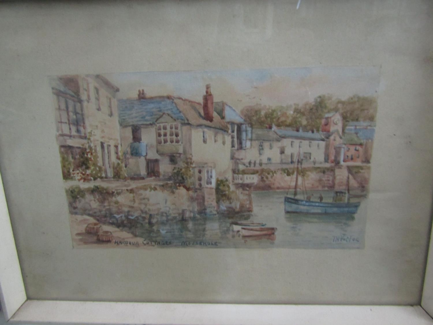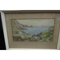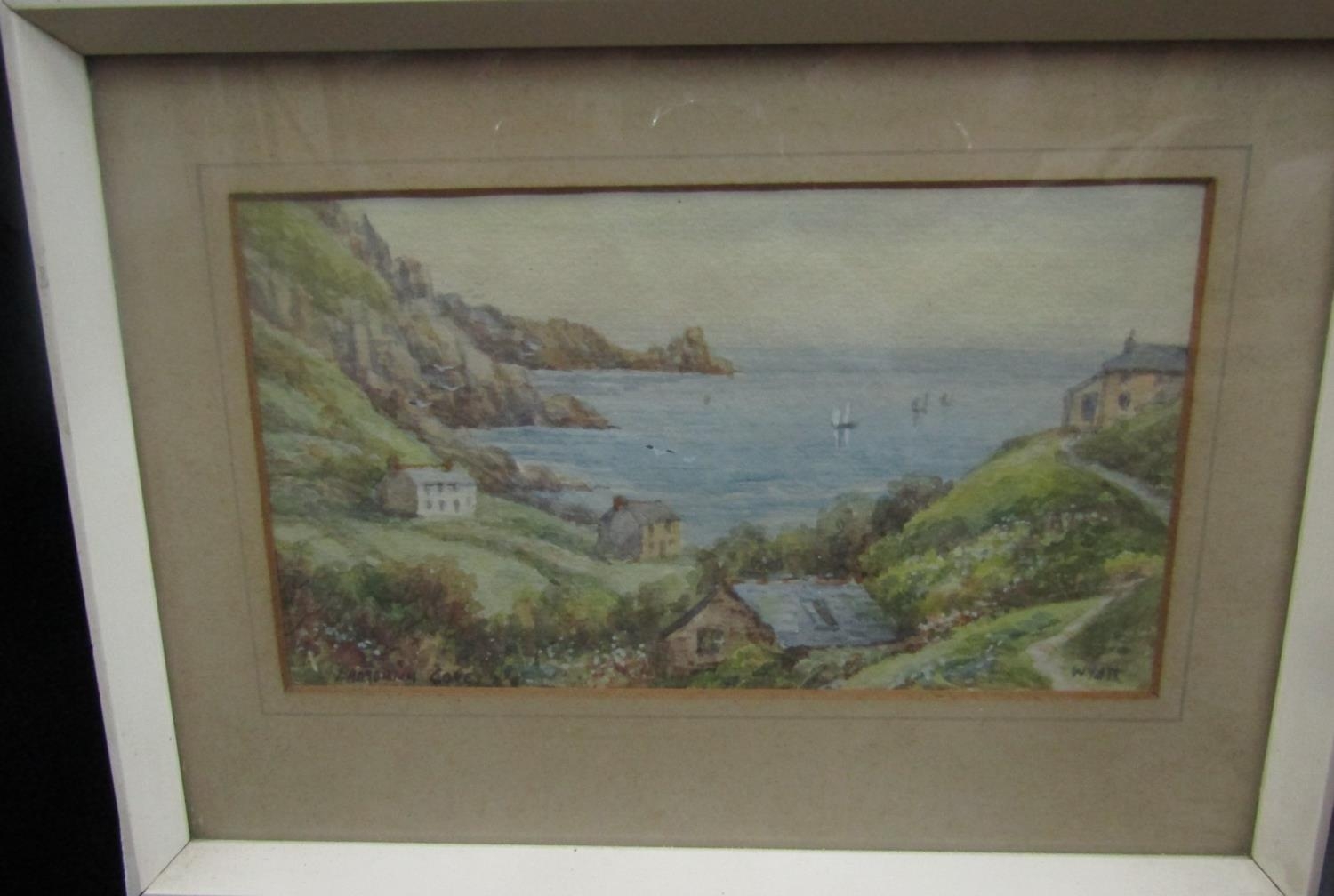 C Houston (late 19th century British school) - Coastal scene with distant yachts, watercolour and bodycolour on paper, signed, 15 x 23.5cm approx, together with T H Victor (20th century British) - three watercolours of Cornish scenes including Newlyn Harbour, 23 x 34cm, Mousehole Harbour, 10 x 17cm, Keigwyn Arms, Mousehole, 10 x17.5cm approx, all signed and inscribed, together with a study of Lamorna Cove, signed Wyatt, but possibly also by T H Victor, together with two other watercolours of coastal landscapes, all framed (7)