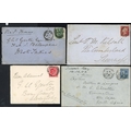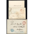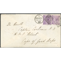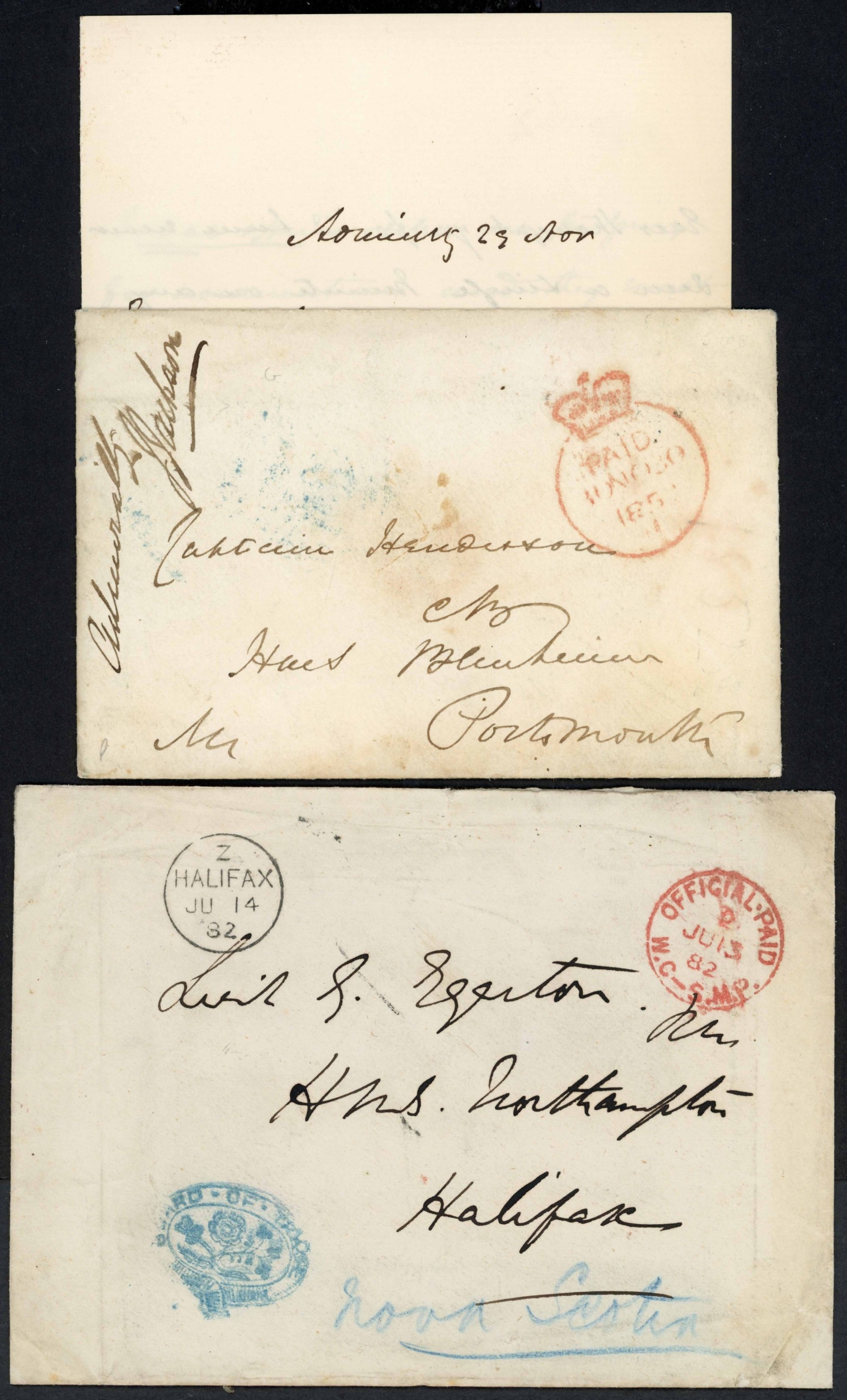 ROYAL NAVY MAILS - CANADA, CAPE, ST THOMAS, ETC.: 1852-1905 with 1874 env. + content London to S/Lt Egerton, HMS Bellerophon West Indies Via S Thomas from his mother, franked 1/- green Pl 8 GD; 1882 B.O.T. crested env. Official Paid to Lt Egerton HMS Northampton, Halifax with ms. blue crayon Nova Scotia added; 1903 env. St Servan, France to Capt. Limpus, H.M.S. Gibraltar, Simonstown, The Cape via Southampton franked tied France 25c blue; 1852 crested env. + content Admiralty, London to Captain Henderson, HMS Blenheim, Portsmouth (Blenheim was Portsmouth Guardship at the time); 1858 env. + content to Lt Kelsall The Cumberland, Sheerness just prior to her departure for the W Indies station; 1905 env. + content Adm Fawkes, Alnwick to R Adm. Egerton at Alverstoke awaiting appointment as 2i/c Atlantic Fleet, etc. (11 items) Cross Reference: NAVAL MAIL, CANADA, CAPE OF GOOD HOPE, DANISH WEST INDIES