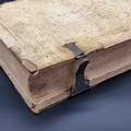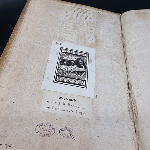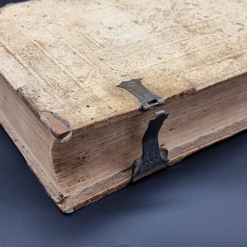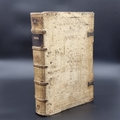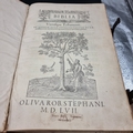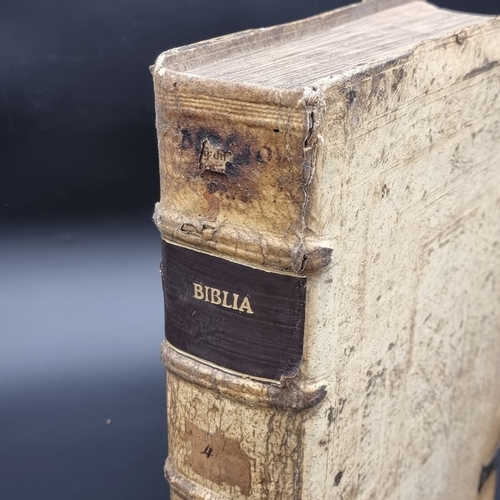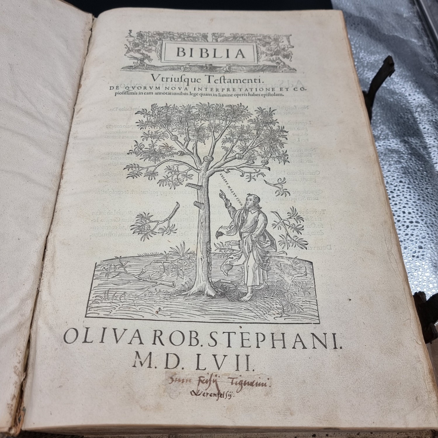BIBLE: 'Biblia. Utriusque Testamenti...': Geneva or Zurich: Robert Stephanus, 1557: volume 1 only, containing books of Genesis to Job: 188:316 fo, several woodcut illustrations: near period blind tooled vellum covered boards with metal closures, 5 raised bands with later label to spine, various later bookplates and labels to upper pastedown, large folio. (1)