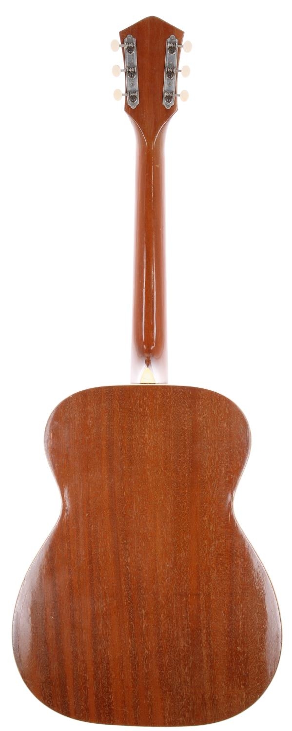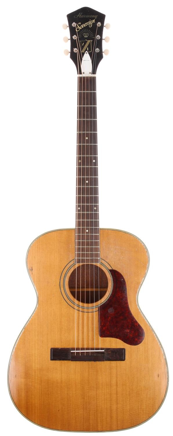 1960s Harmony Sovereign H1203 acoustic guitar, made in USA; Back and sides: mahogany, light dings and marks otherwise good for age; Top: natural spruce, light play wear to treble side, various minor dings and minor checking; Neck: mahogany, minor dings; Fretboard: light wear to first position; Frets: good; Hardware: good; Case: semi-rigid fibreboard case; Overall condition: good