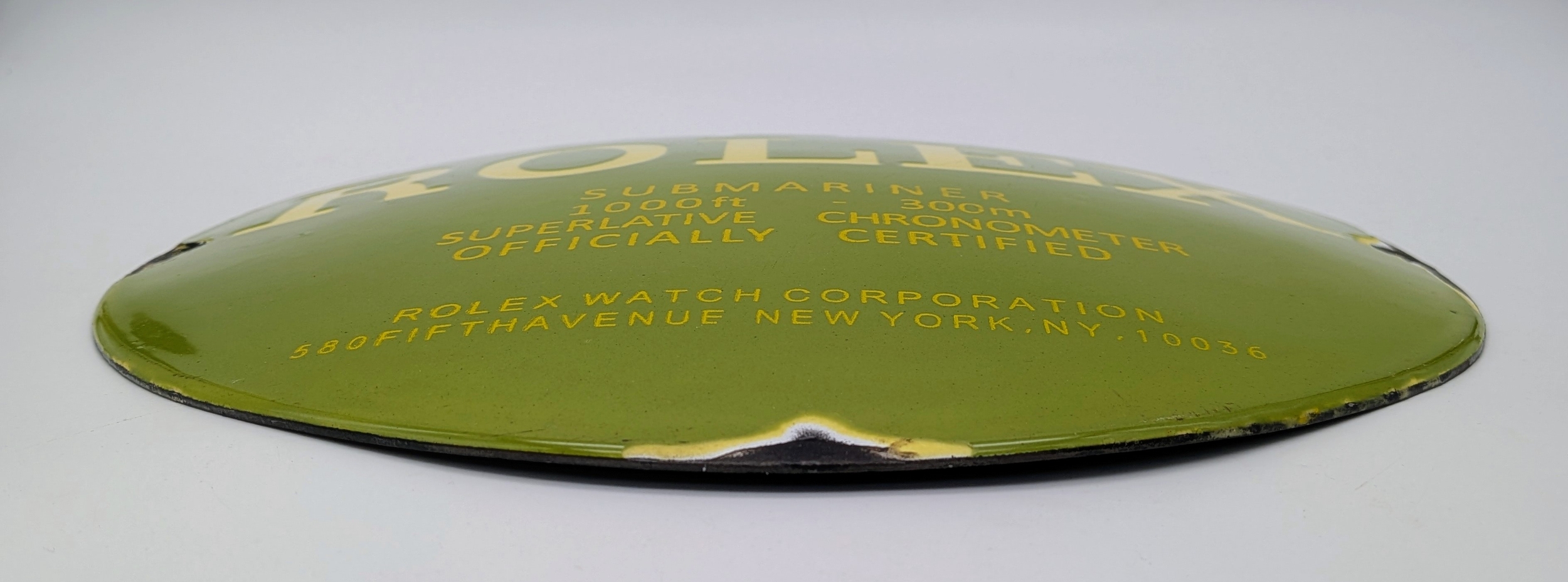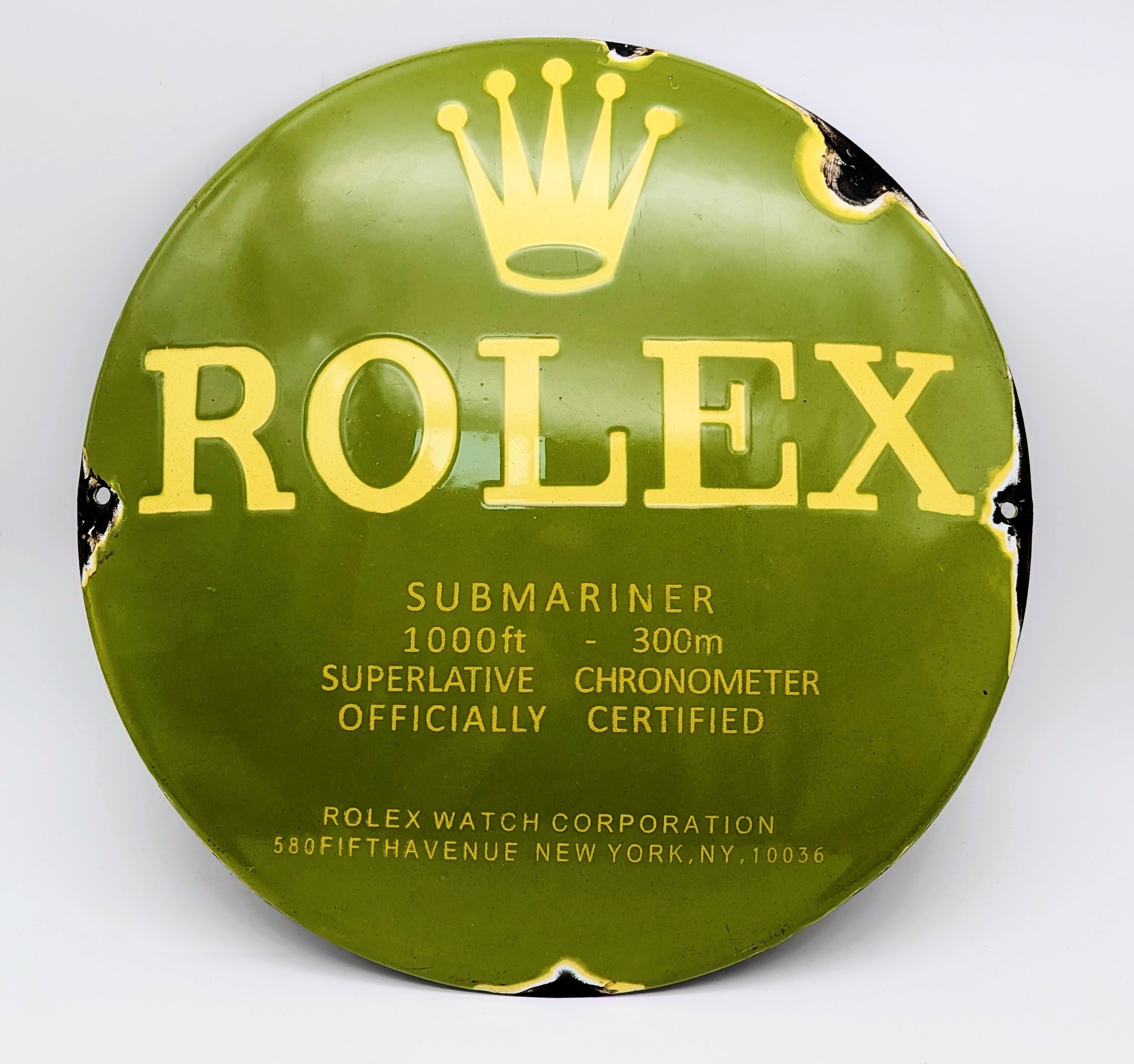 A Vintage Rolex Enamel Advertising Sign with a Focus on the Submariner Watch. Normally used as external dealer shop signs in the 1970s and 80s. 31cm diameter.