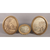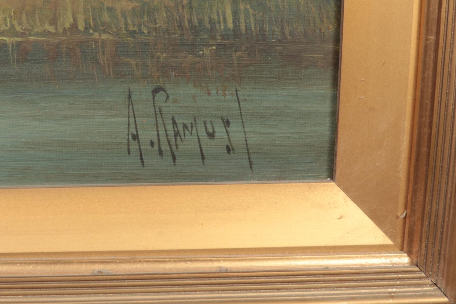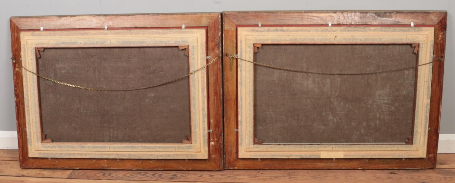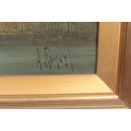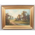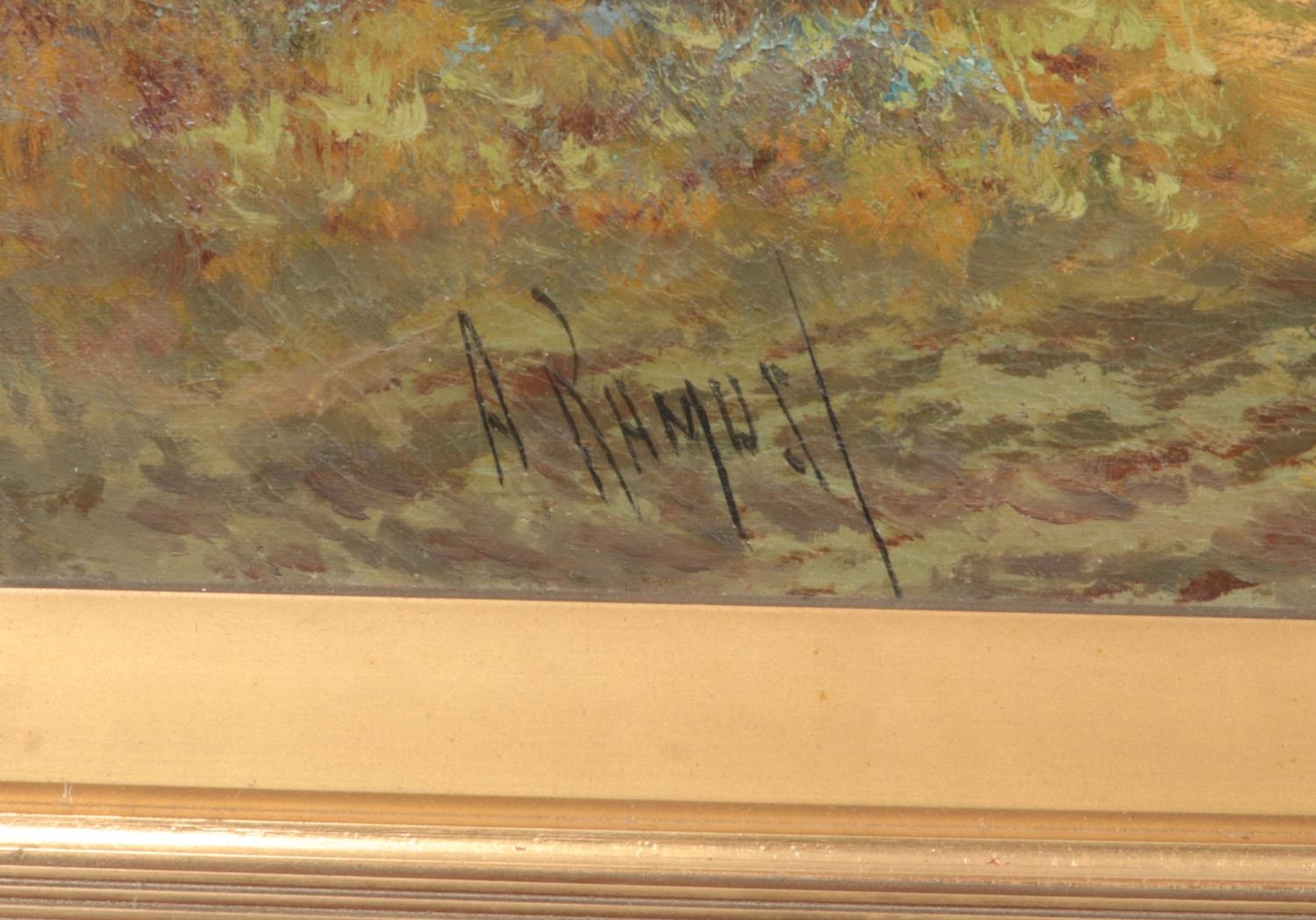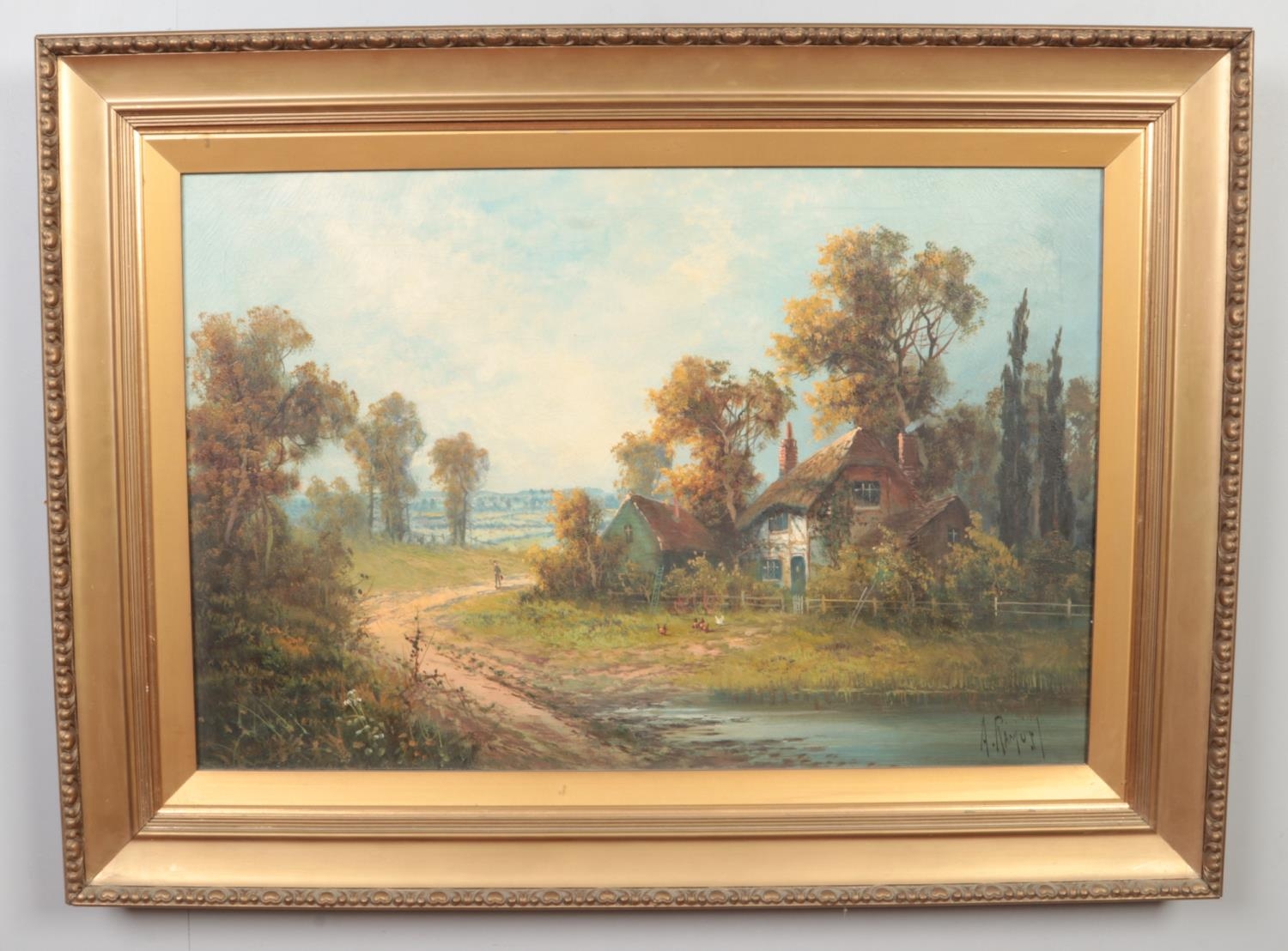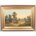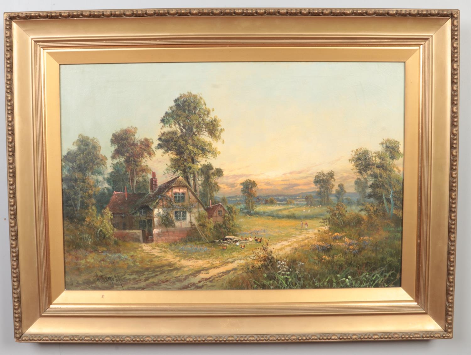 Aubrey Ramus (1895-1950), a pair of gilt framed oils on canvas. Rural evening scenes with cottages. Signed. 50cm x 75cm.