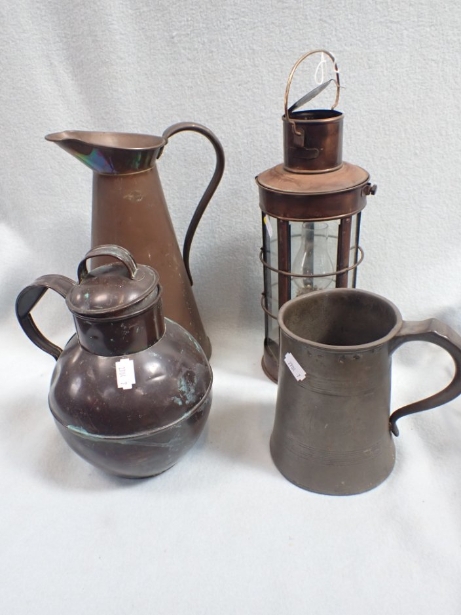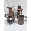 A COPPER LANTERN, A GUERNSEY TYPE MILK JUG and other metalware