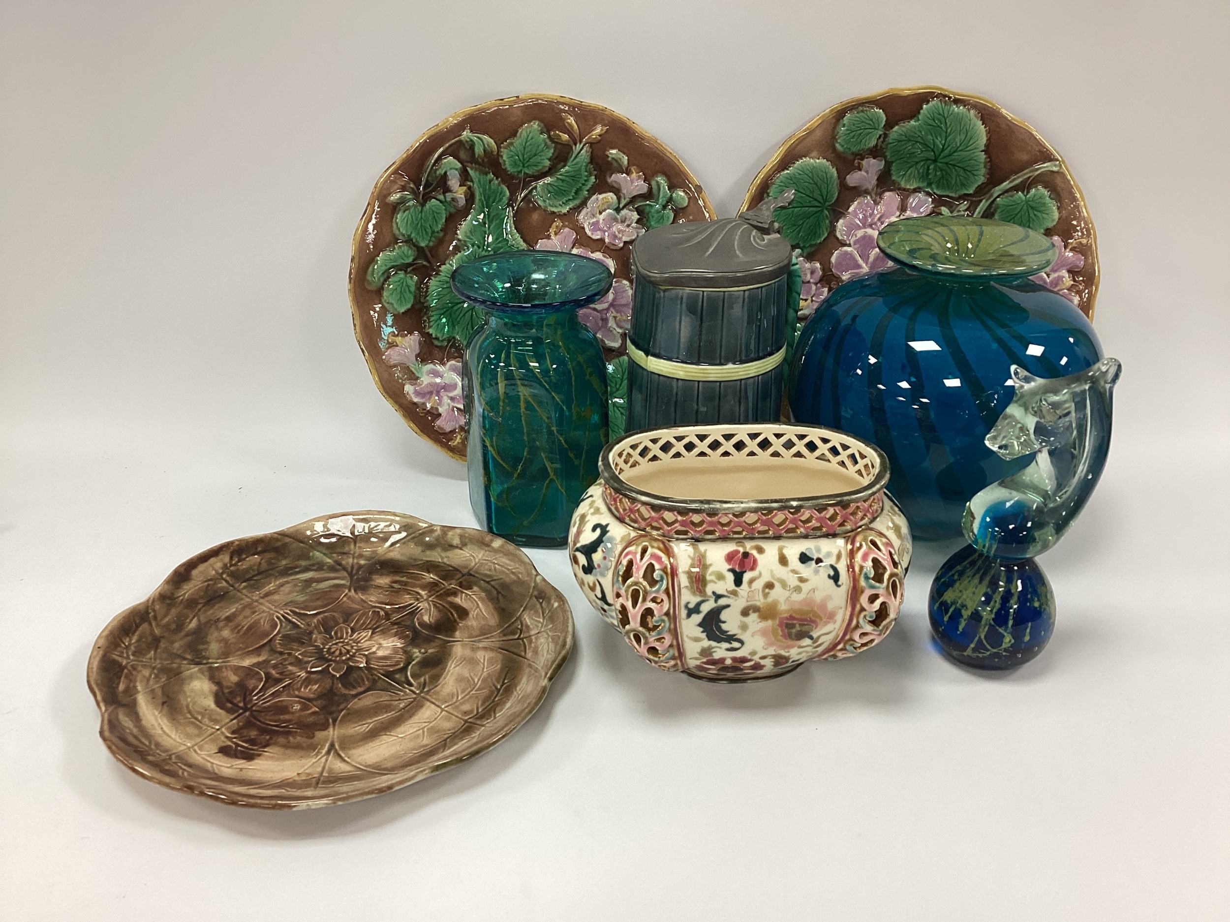 A Large Mdina 'Globe' Vase Signed 'Mdina Glass 1977' To Base, two others similar, unsigned, Zsolnay Pecs bowl with pierced gallery design, Wedgwood jug with pewter lid, plates:- One Tray.