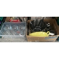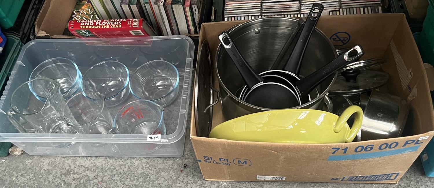 2 Boxes containing kitchenalia including Jamie Oliver pans and Pyrex jugs etc