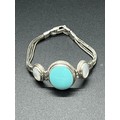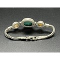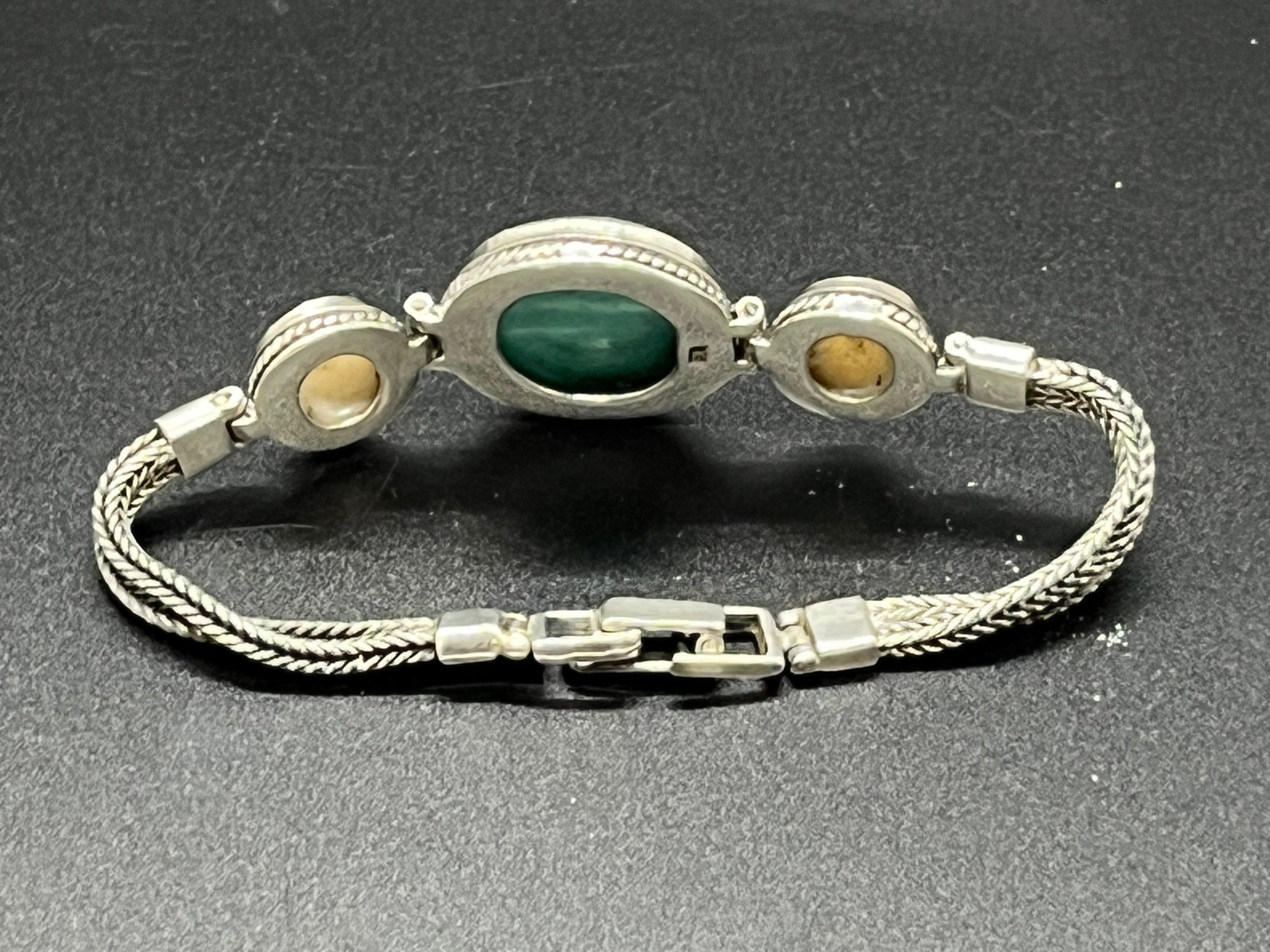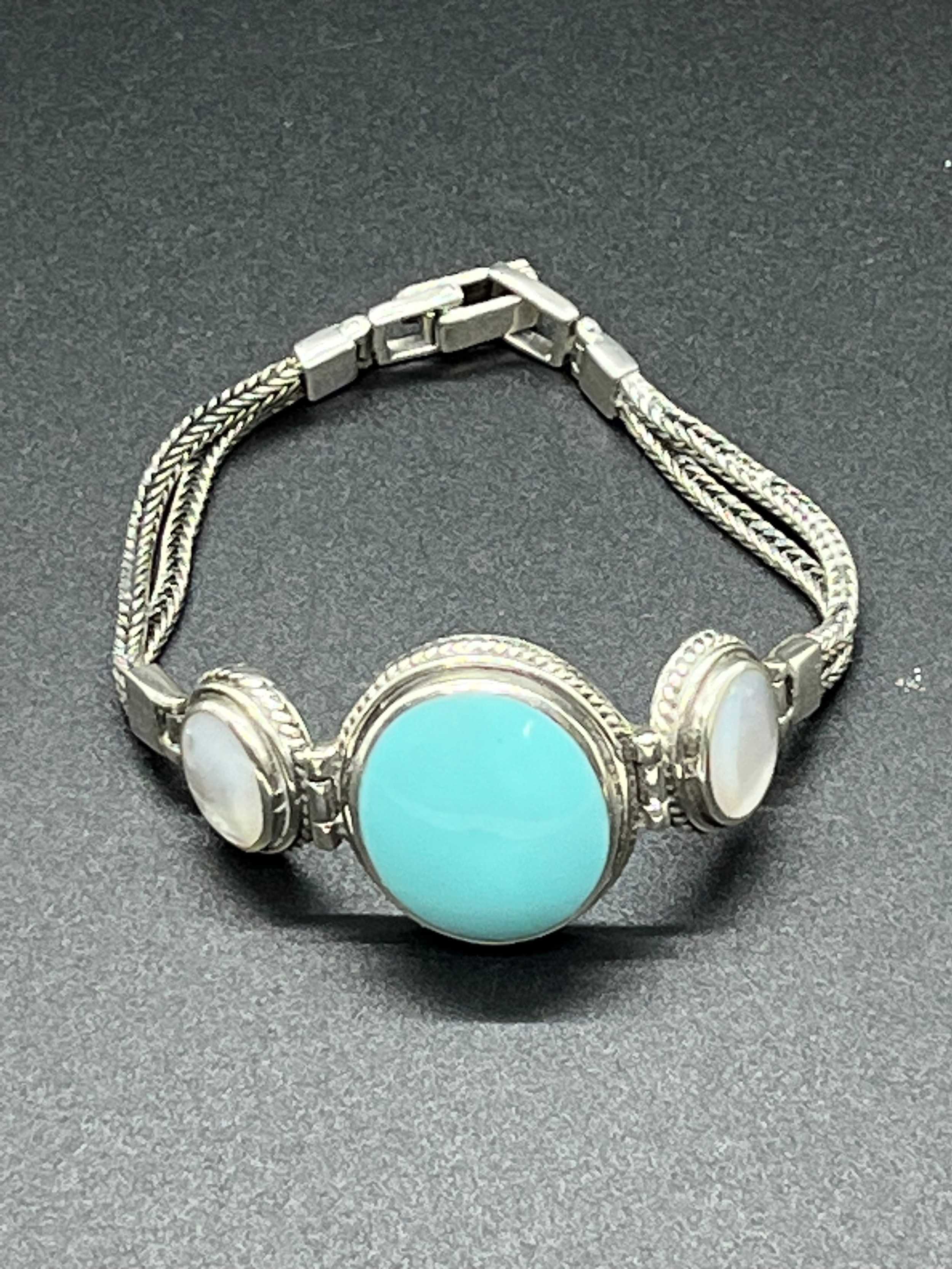 Silver (.925) flexable bracelet & clasp , with Mother of Pearl & Blue coloured stone ... 29 grams.