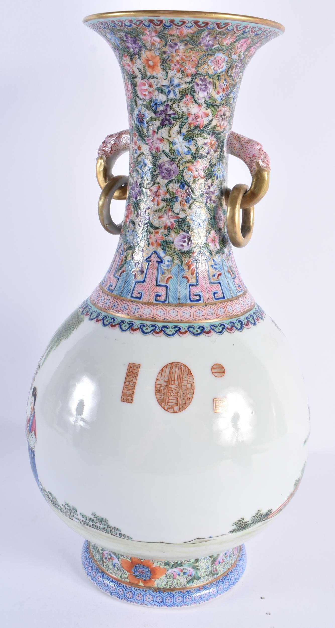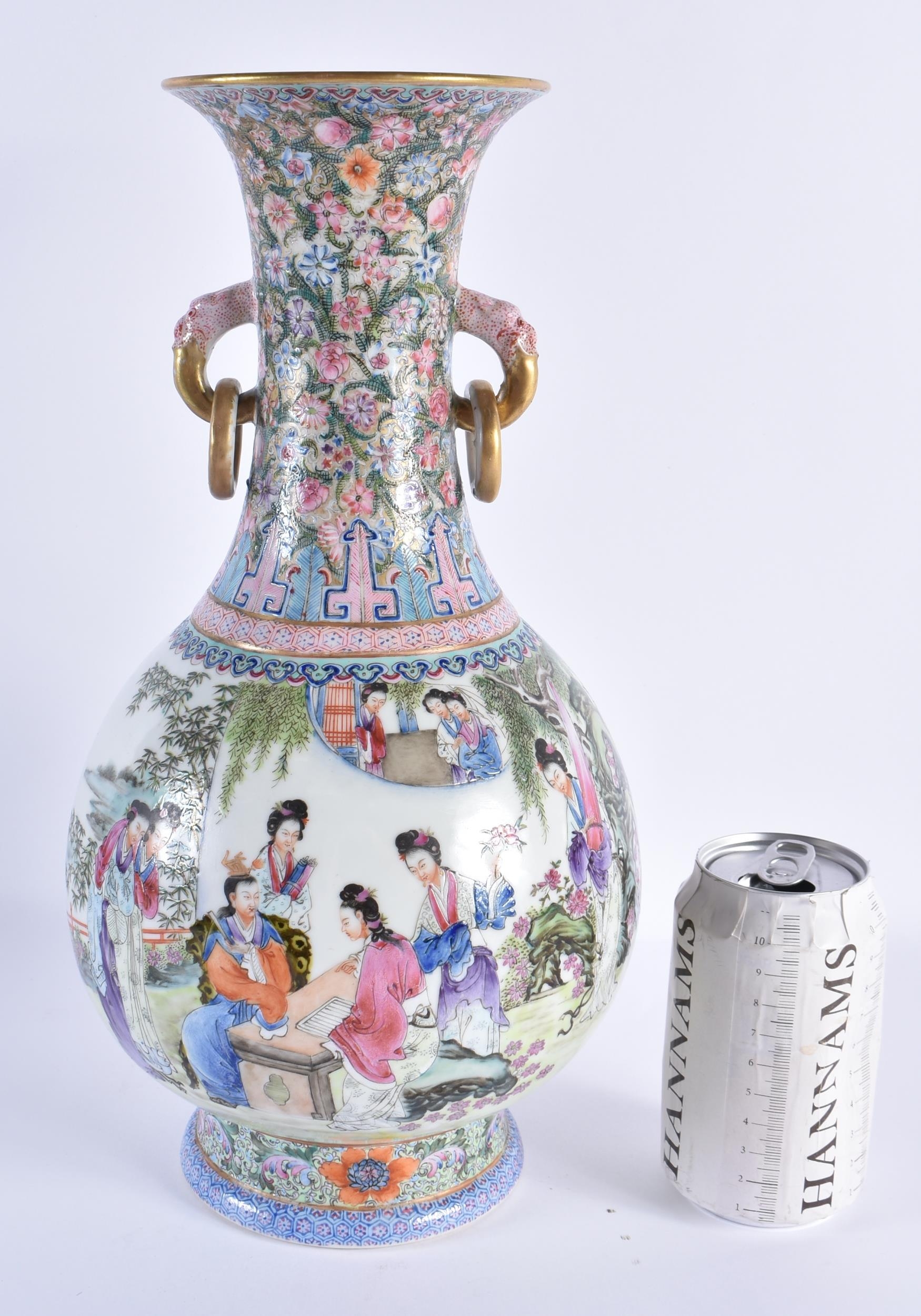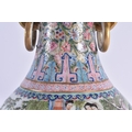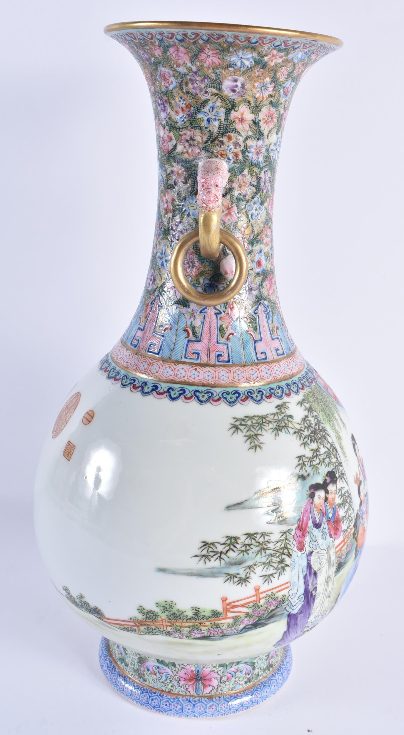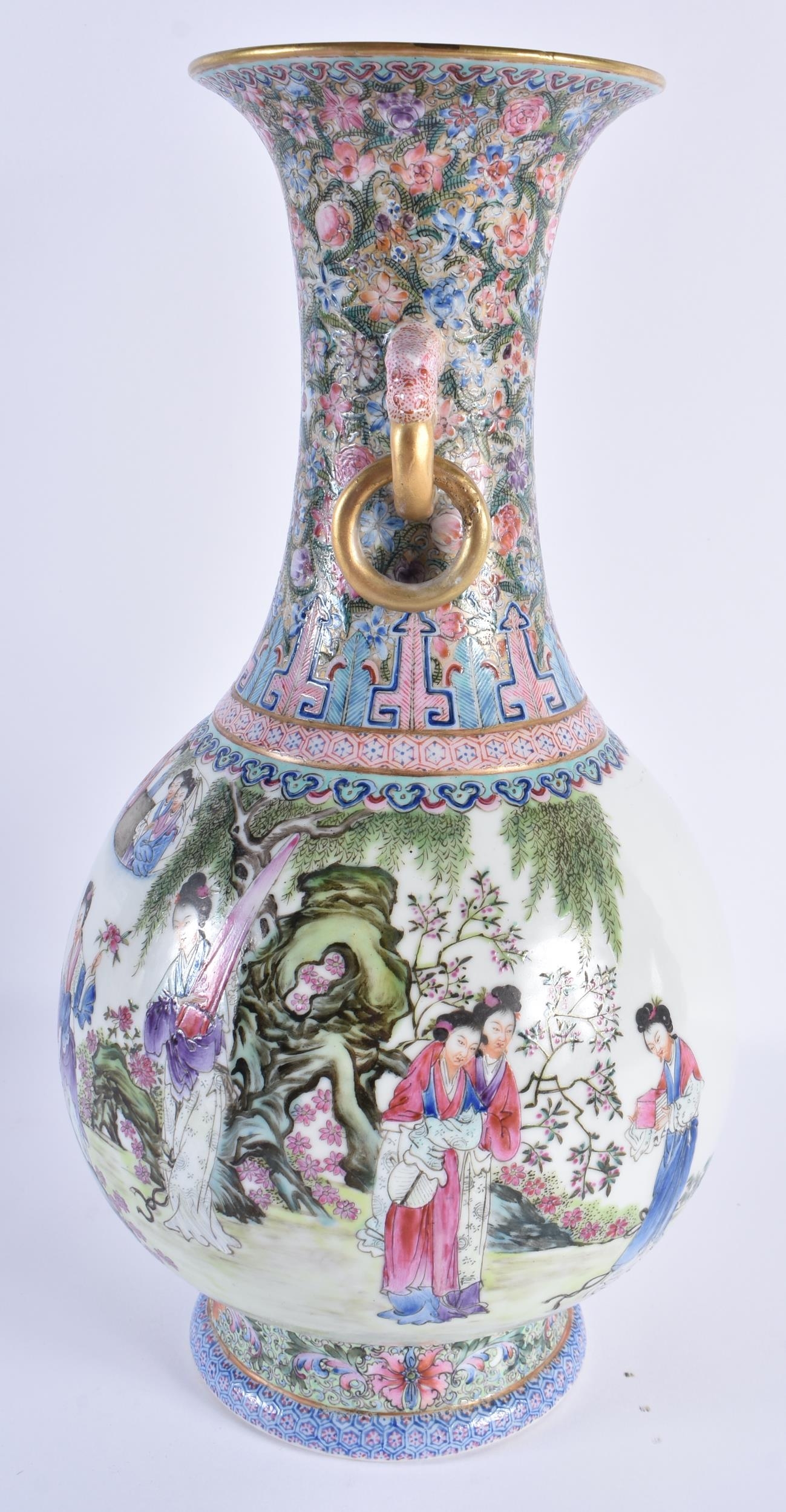 A FINE LARGE EARLY 20TH CENTURY CHINESE FAMILLE ROSE PORCELAIN TWIN HANDLED VASE Late Qing/Republic, painted with numerous females within landscapes and interiors. 35 cm x 15 cm. Note: Famille rose is a type of Chinese porcelain introduced in the 18th century and defined by pink overglaze enamel. It is a Western classification for Qing dynasty porcelain known in Chinese by various terms: fencai, ruancai, yangcai, and falangcai.