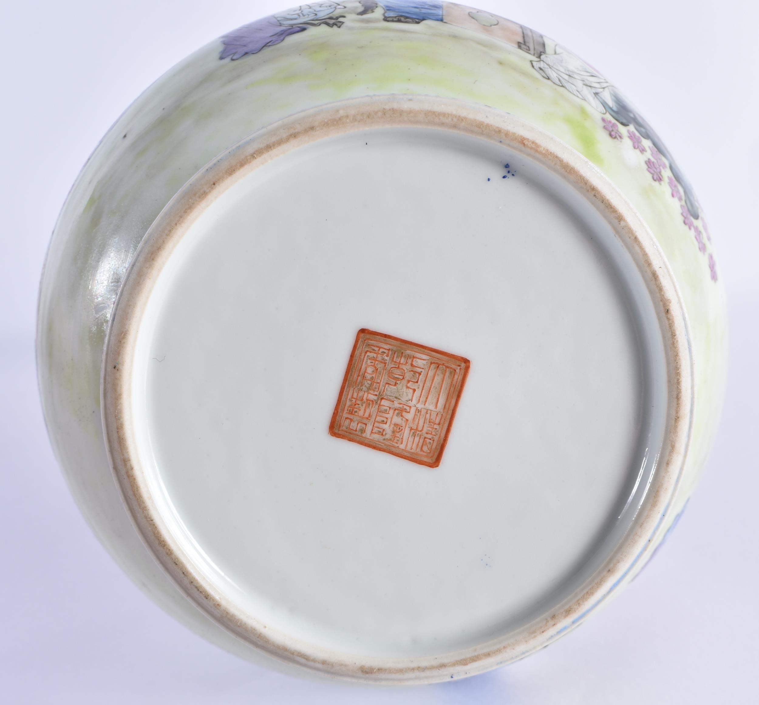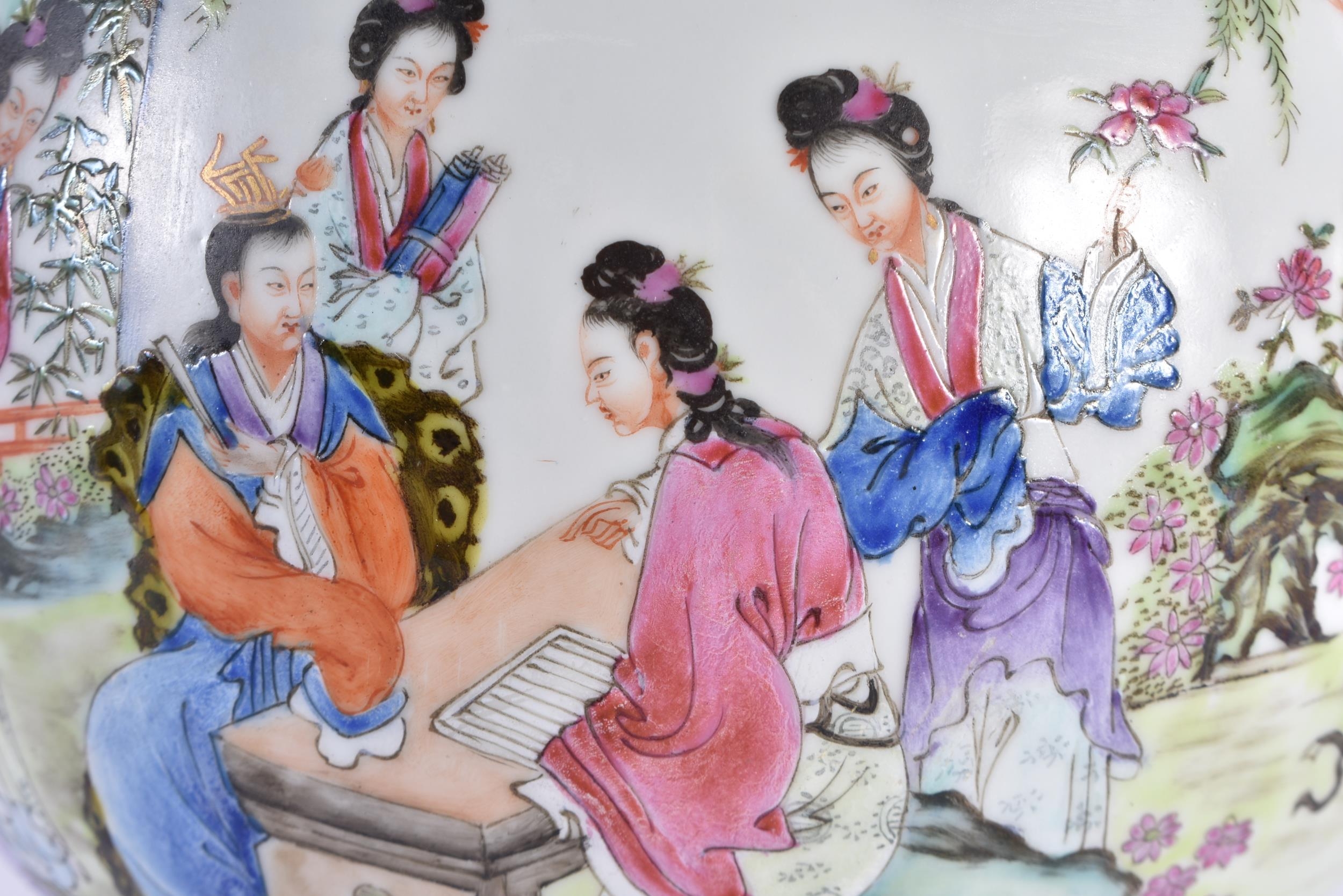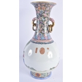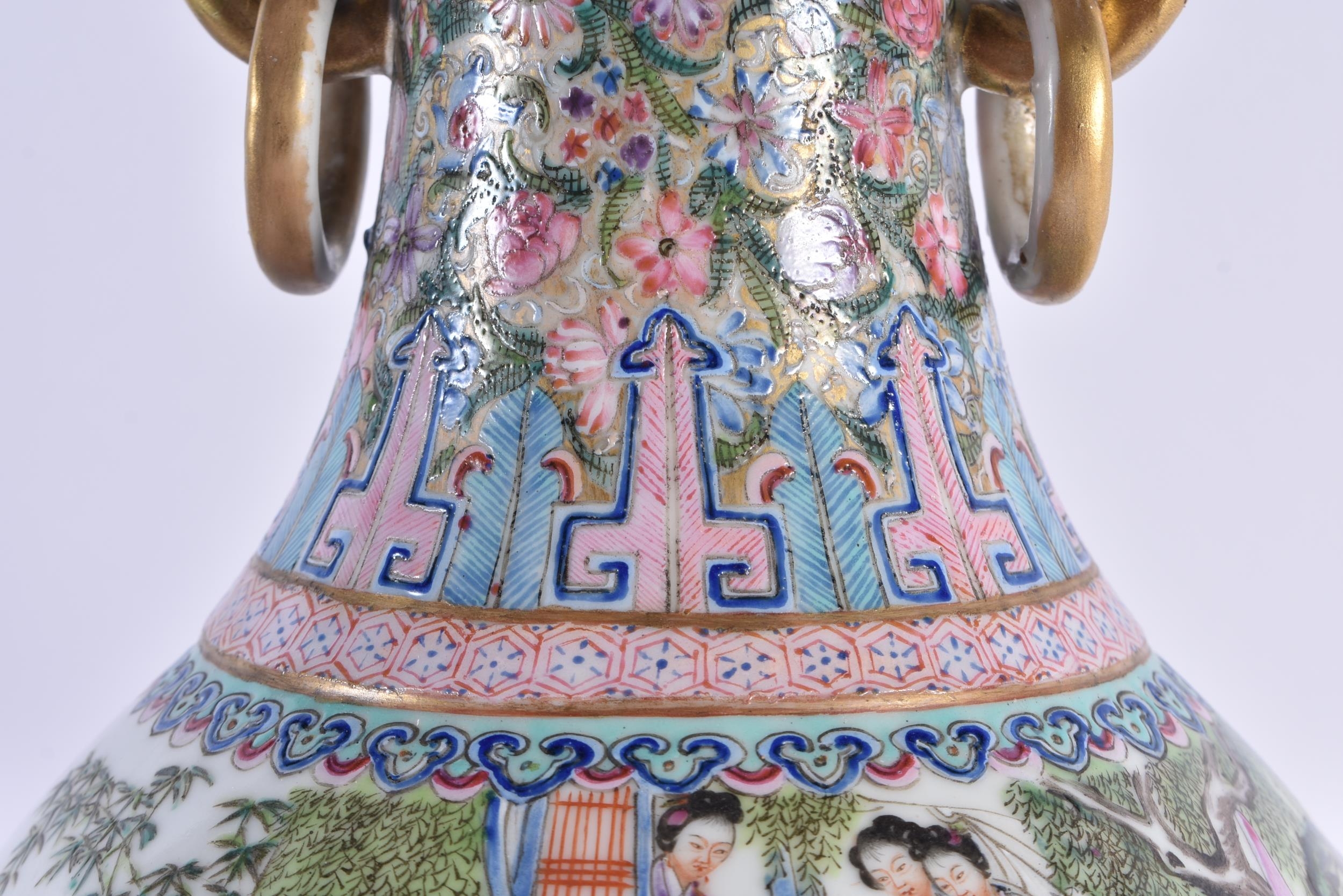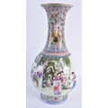 A FINE LARGE EARLY 20TH CENTURY CHINESE FAMILLE ROSE PORCELAIN TWIN HANDLED VASE Late Qing/Republic, painted with numerous females within landscapes and interiors. 35 cm x 15 cm. Note: Famille rose is a type of Chinese porcelain introduced in the 18th century and defined by pink overglaze enamel. It is a Western classification for Qing dynasty porcelain known in Chinese by various terms: fencai, ruancai, yangcai, and falangcai.