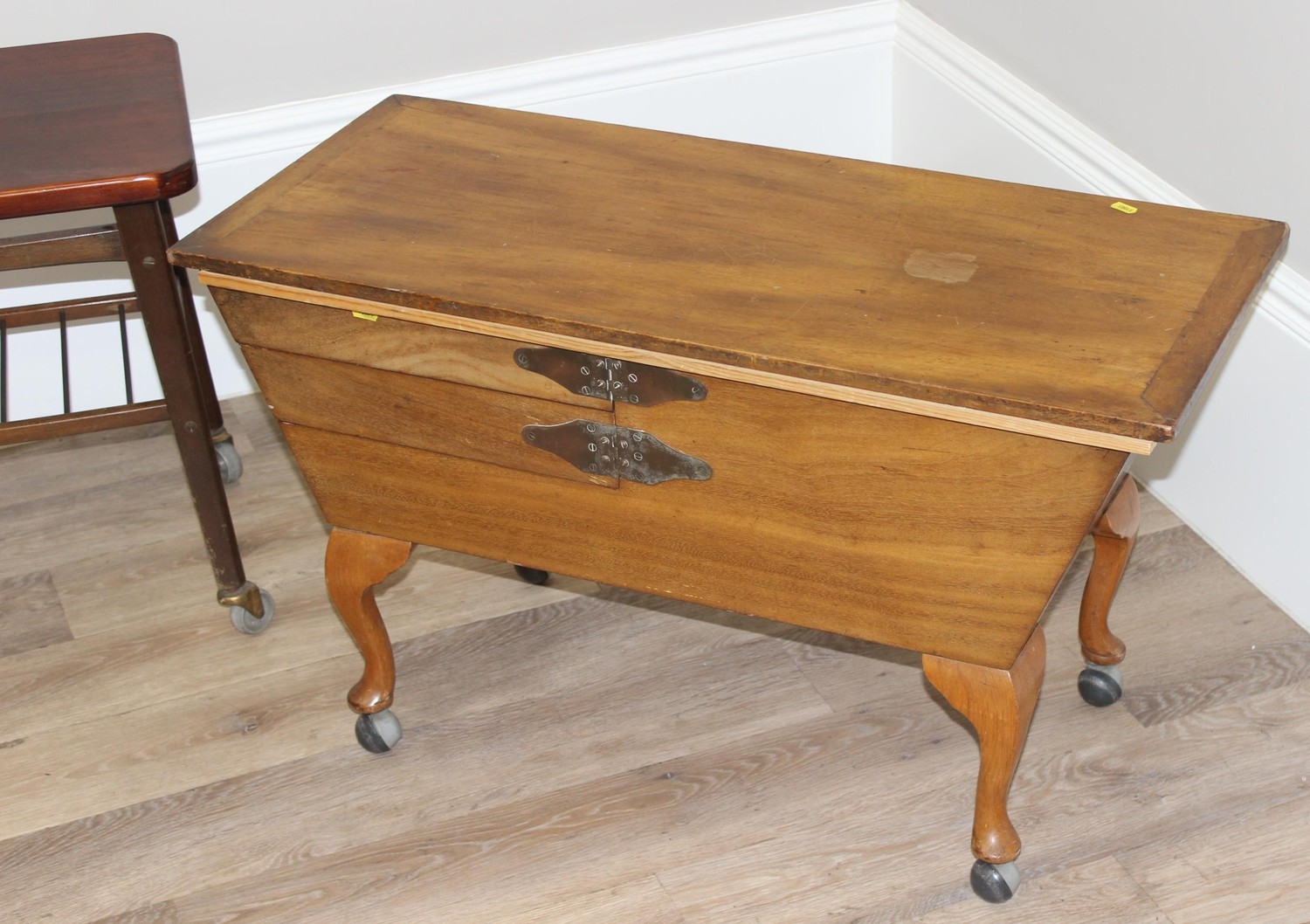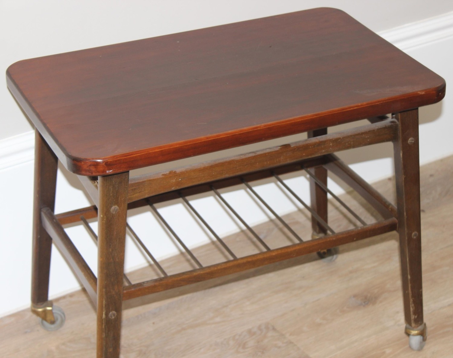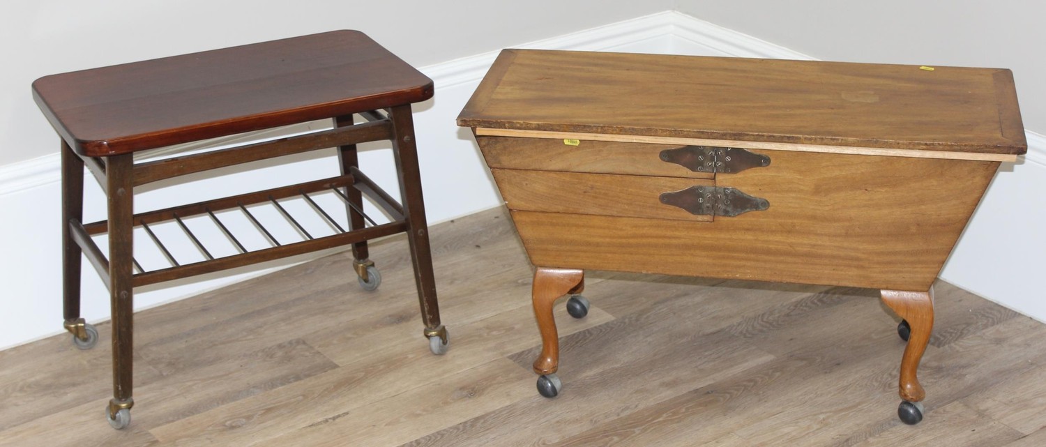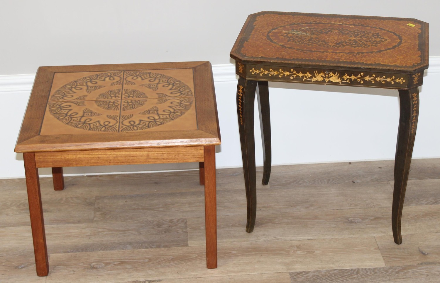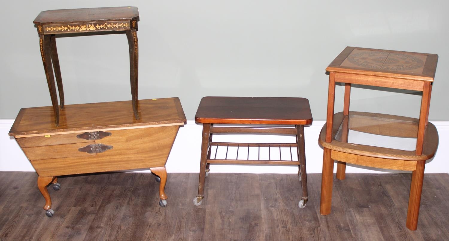 A collection of various retro furniture items to inc small tables, G-Plan coffee table, a retro tile topped table and a Sorrento style musical table amongst others, largest approx 91cm wide x 40cm deep x 52cm tall (5)