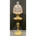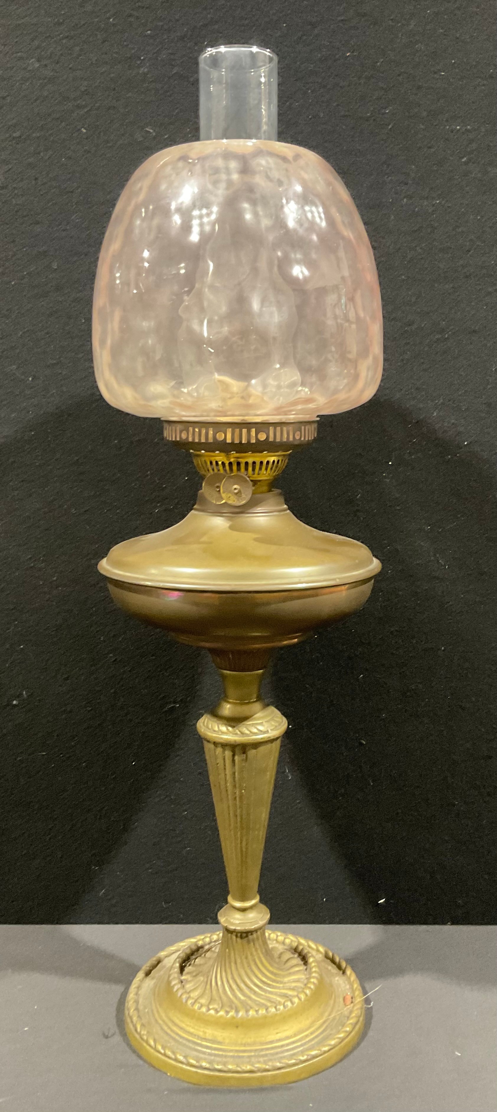A brass oil lamp, twin burner, moulded glass shade in pale lilac, chimney flute, 66cm