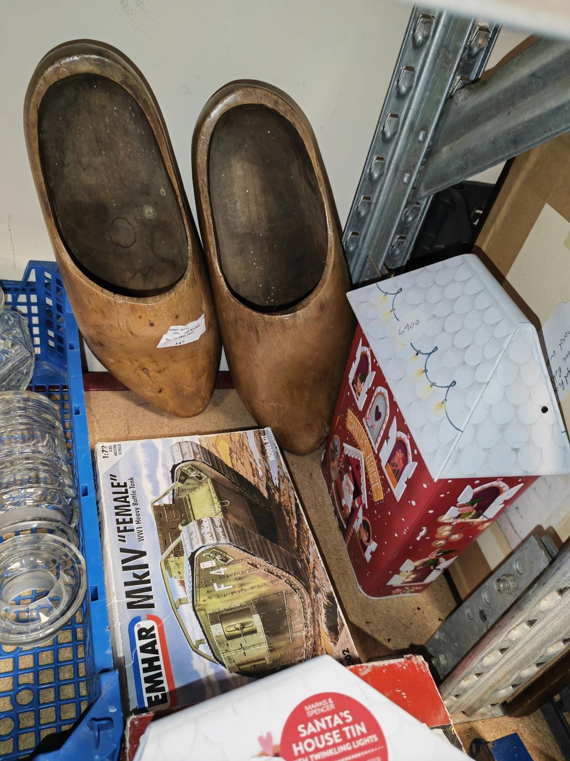 Large Pair Of Wooden Clogs Plus 2 Christmas Tins And A Model Kit