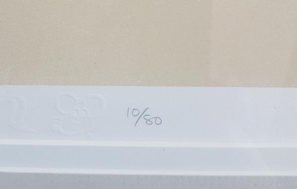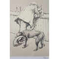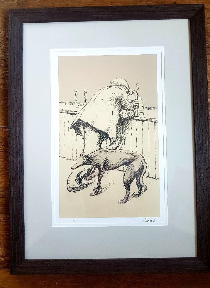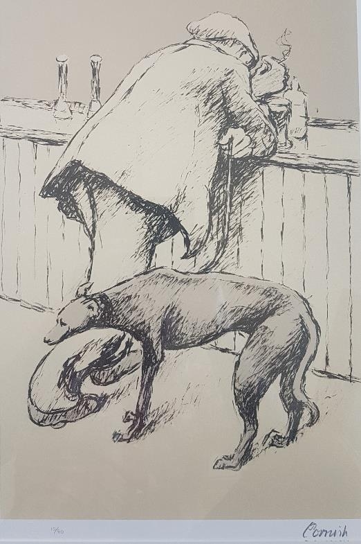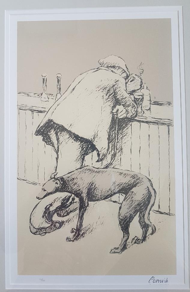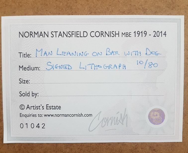 Norman Cornish Signed and Numbered Lithograph of Leaning Man at Bar with Dog. Size is 29 inches x 21 inches