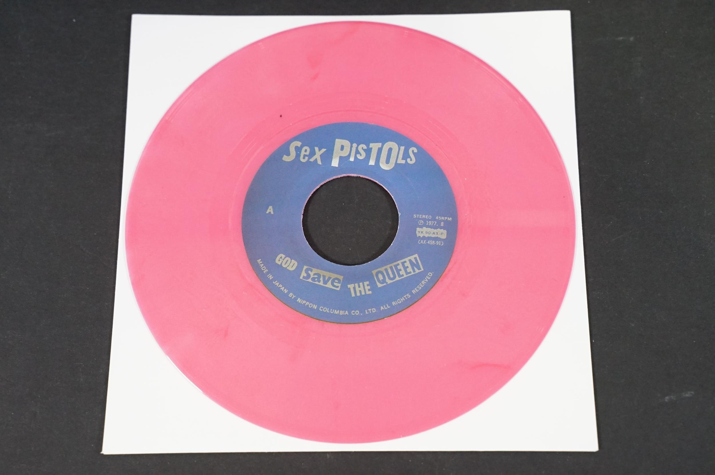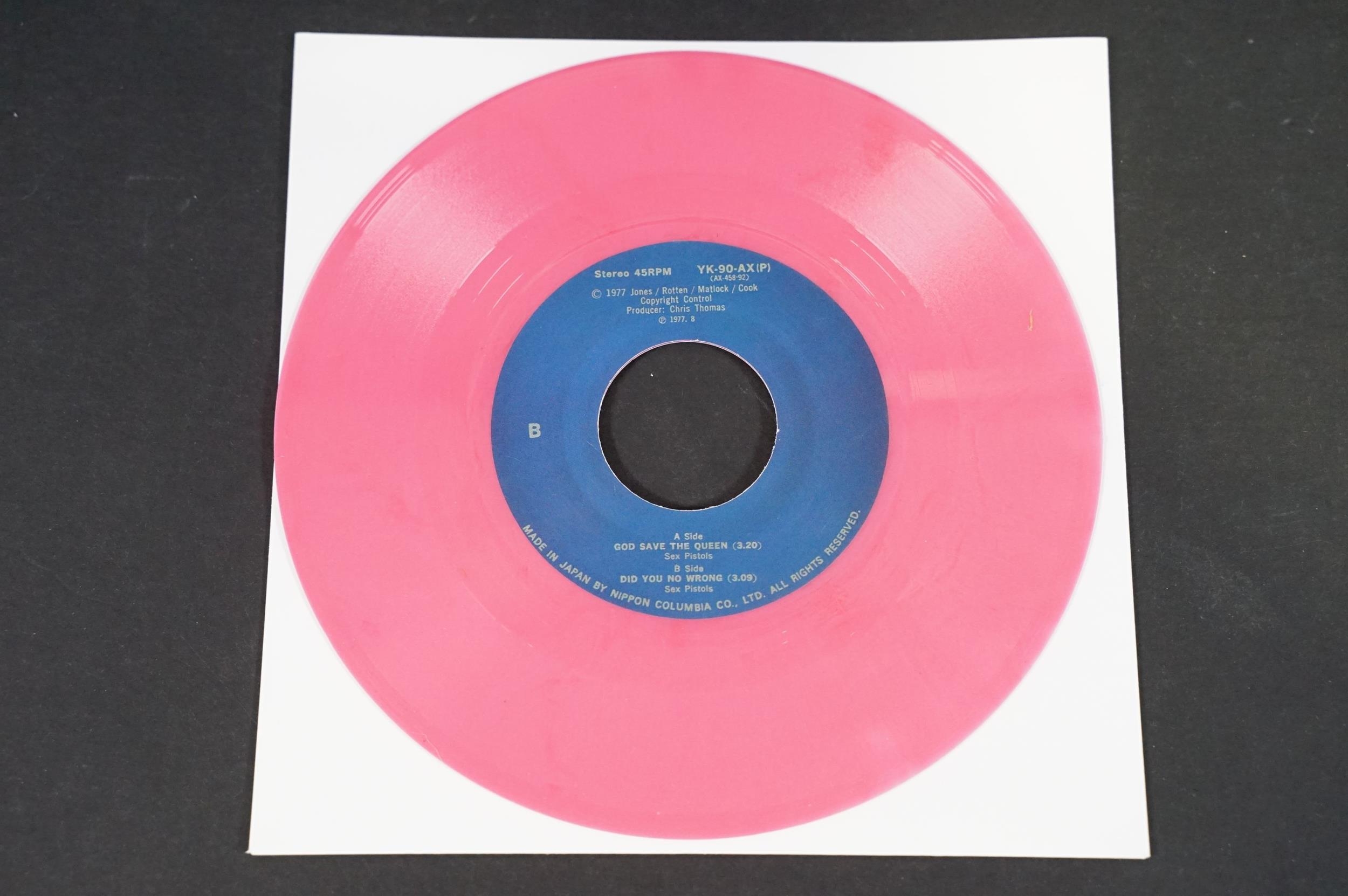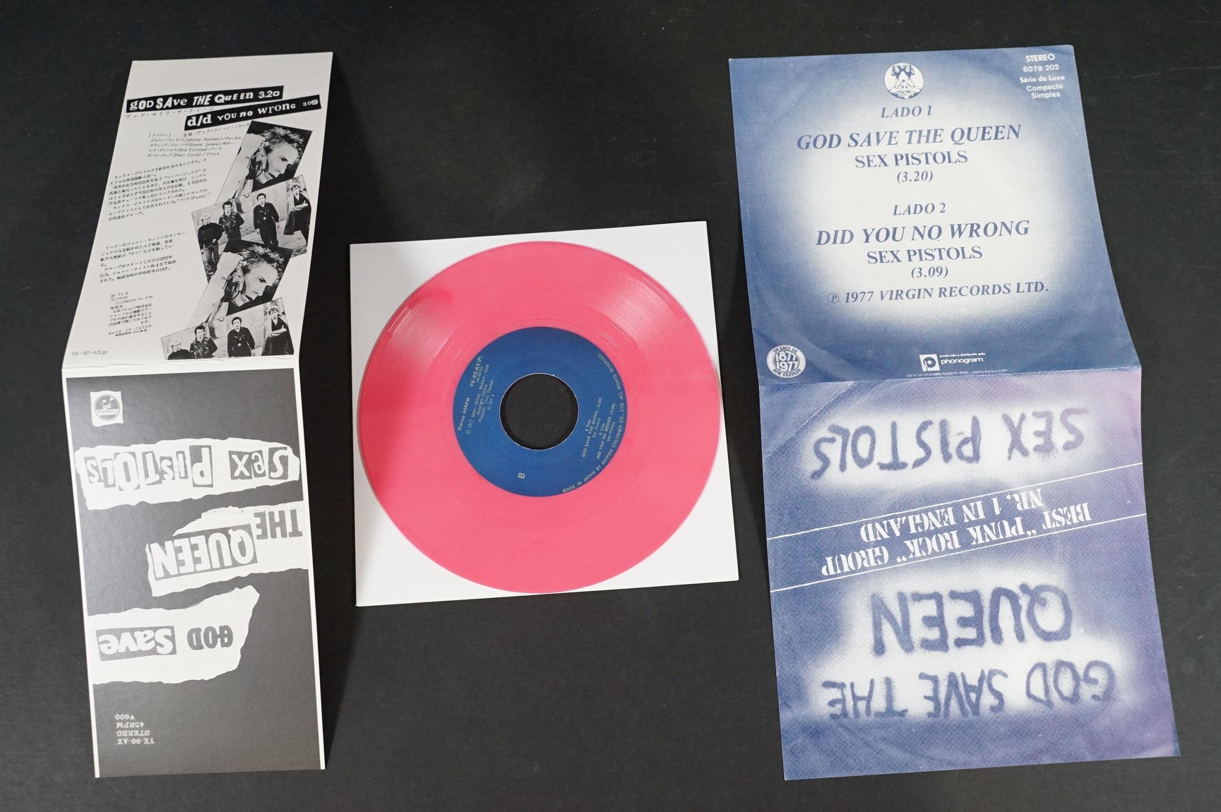 Vinyl - Punk - Sex Pistols, 5 different coloured vinyl Japanese pressing 7” singles of “God Save The Queen”, red, pink, purple, yellow and blue marbled vinyl. All come with picture sleeves and hard cardboard inserts. EX+