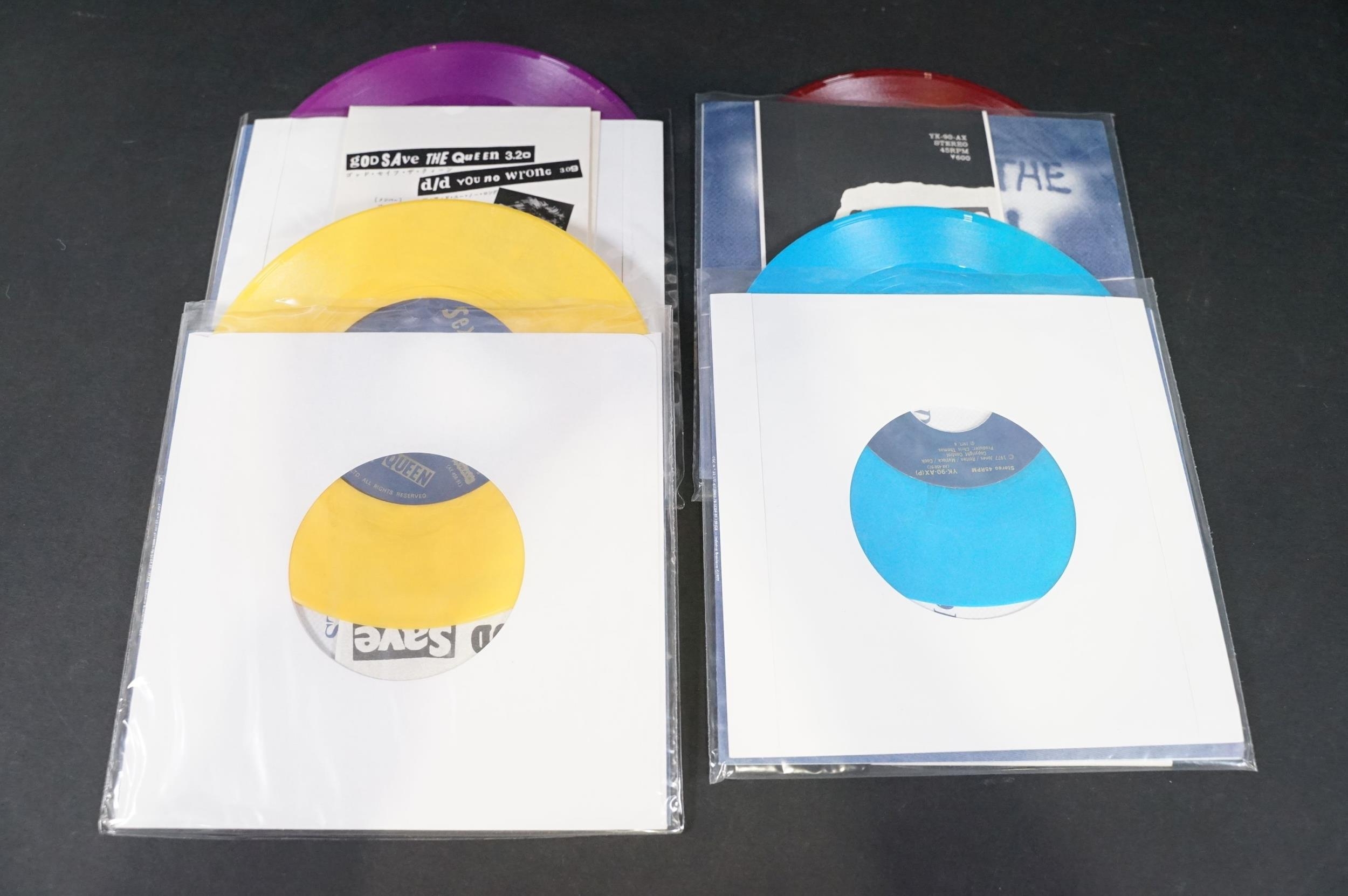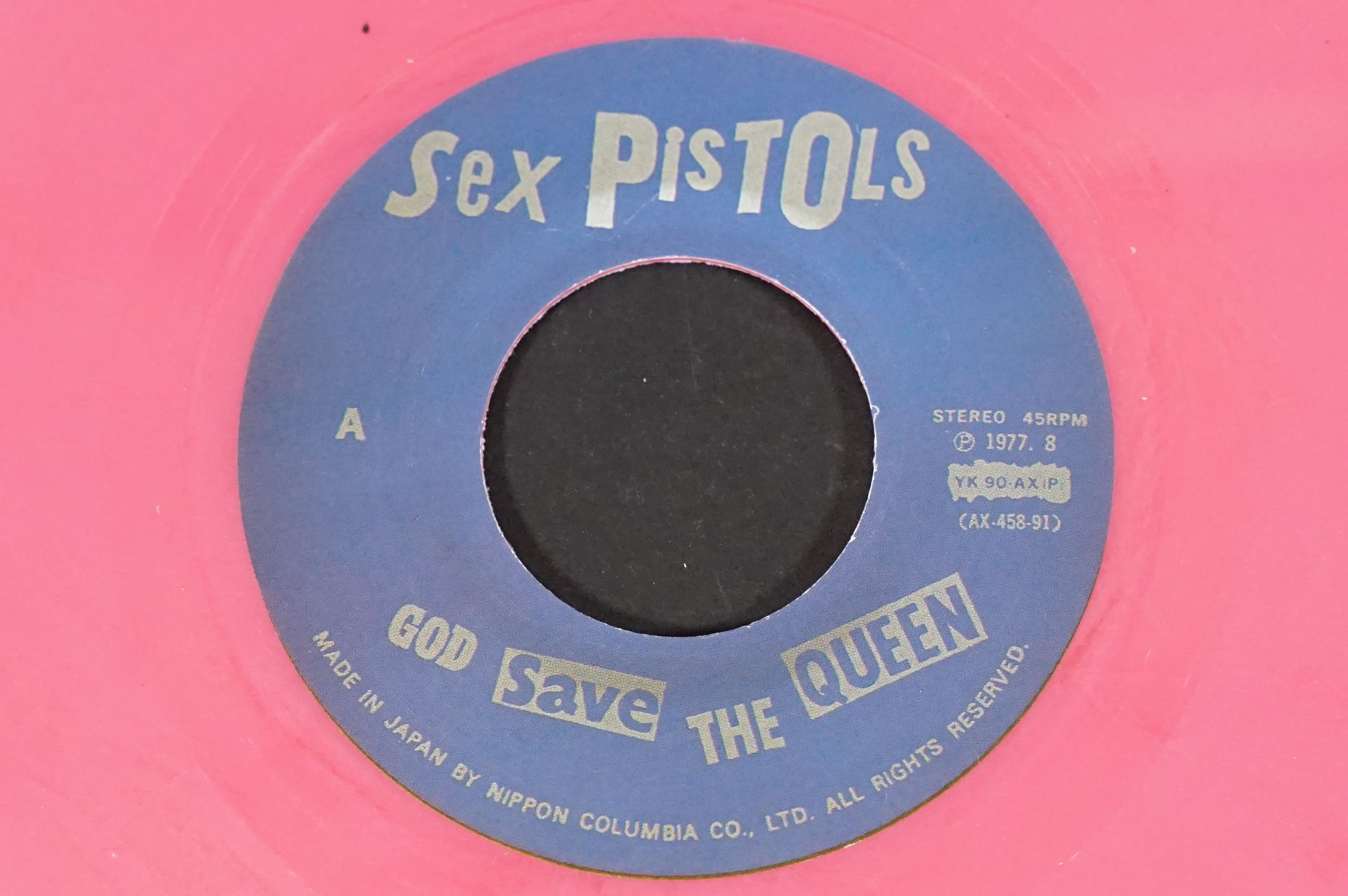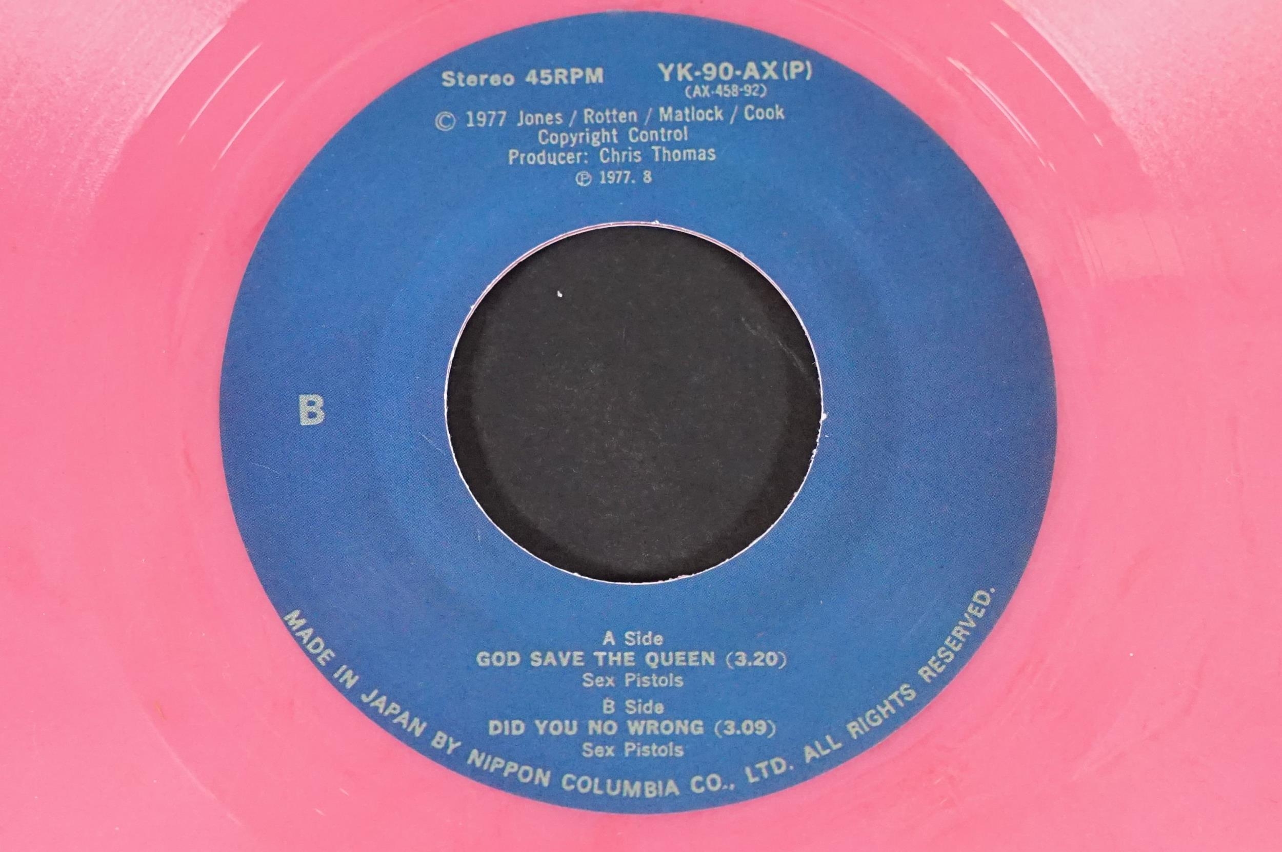 Vinyl - Punk - Sex Pistols, 5 different coloured vinyl Japanese pressing 7” singles of “God Save The Queen”, red, pink, purple, yellow and blue marbled vinyl. All come with picture sleeves and hard cardboard inserts. EX+